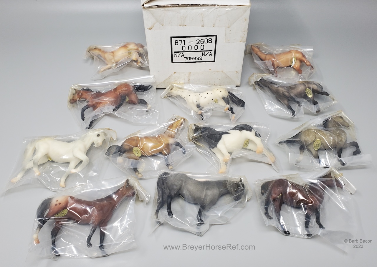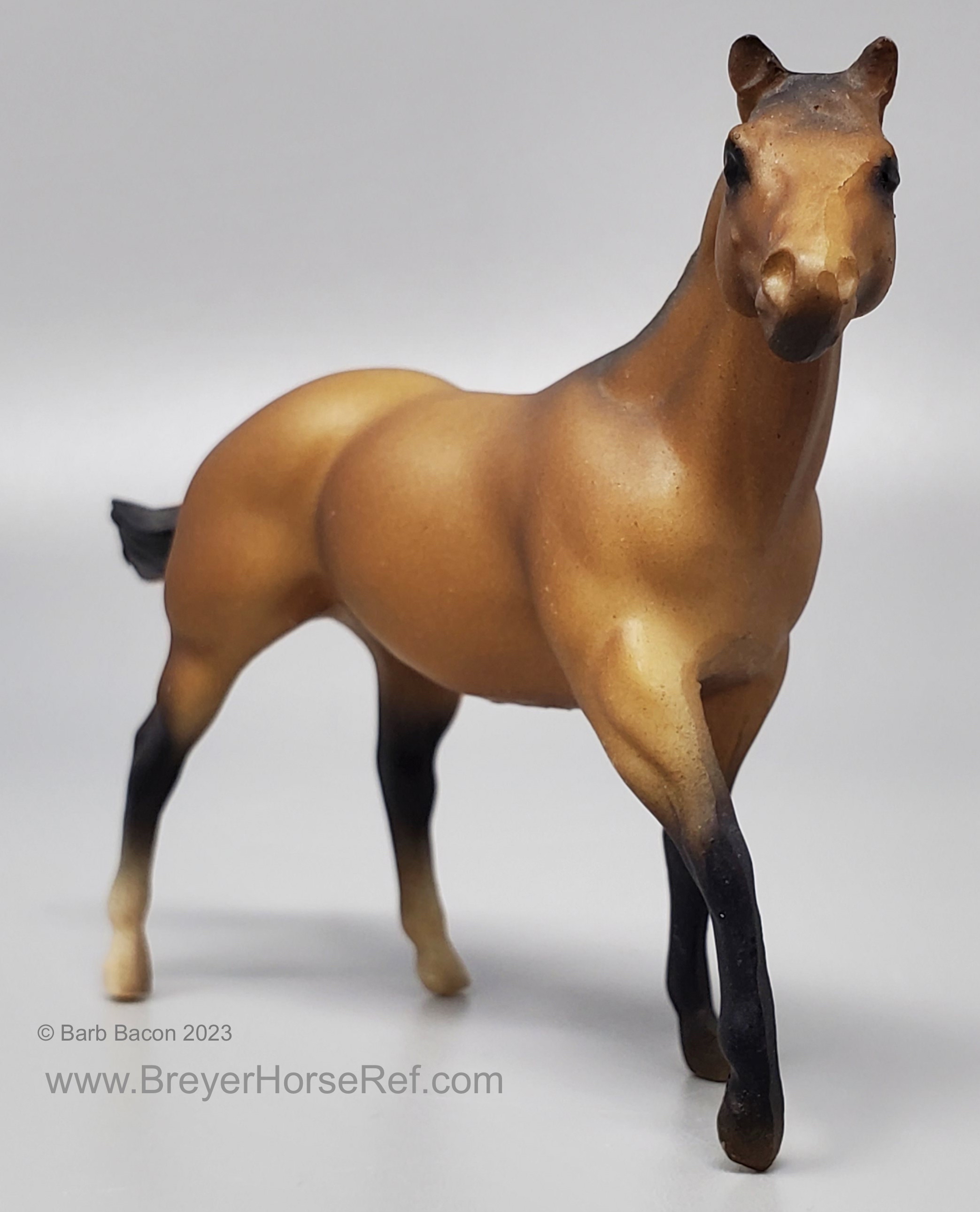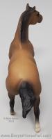 Sooty Buckskin color with hind sock. In 1996, JC Penney released this set as the 12 Piece Stablemate Set #711096 (JCP #671-2608). This set included a blue roan Arabian Mare, rose grey Arabian Stallion, bay blanket appaloosa Citation, black pinto Draft Horse, red dun Morgan Mare, alabaster with striped mane Morgan Stallion, red dun Native Dancer, sooty buckskin Quarter Horse Stallion, dapple grey Saddlebred, sandy bay Seabiscuit, black leopard appaloosa Silky Sullivan and a bay Swaps.