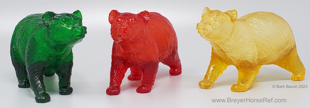 "Our next BreyerFest: Prost! Special Run Model reveal is the non-equine animal model! These delightful little bears have been inspired by an iconic German candy - gummy bears! Done on the Bear Cub, mold #308 sculpted by Chris Hess, our Breyer Bears are deliciously-colored clearware bears. They are being sold as a set of three and will come in red, yellow, and green – and be sweetly-scented, to boot! As an added bonus, unlike the other Special Run models, this set will come in stunning custom packaging that is themed to this summer’s celebration of Prost." www.breyerhorses.com.