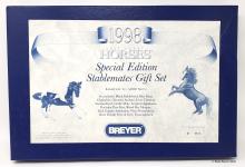 This set was released as the 1998 Special Edition Stablemate Gift Set #790798. The set included a black American Saddlebred, dapple grey Andalusian, black leopard appaloosa on the Appaloosa mold, chestnut Rearing Arabian, roan pinto Clydesdale, dun Mule, buckskin Paso Fino, bay Prancing Morgan, silver dapple Shetland Pony, chestnut Standardbred, grey Thoroughbred, and a black pinto Warmblood. These models were made from the heavier Cellulose Acetate plastic.