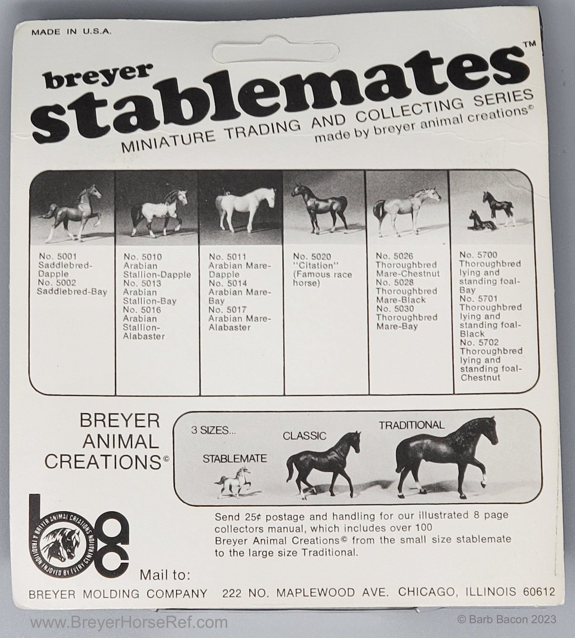 Chestnut with darker mane and tail, solid face and various socks. Originally sculpted by Maureen Love for Hagen-Renaker. Early models did not have a mold stamp, then a Copyright Breyer Molding Co 1976 was added (even though this mold was released in 1975). Released late in 1975, so not pictured in the catalog. These models were made from the heavier Cellulose Acetate plastic.