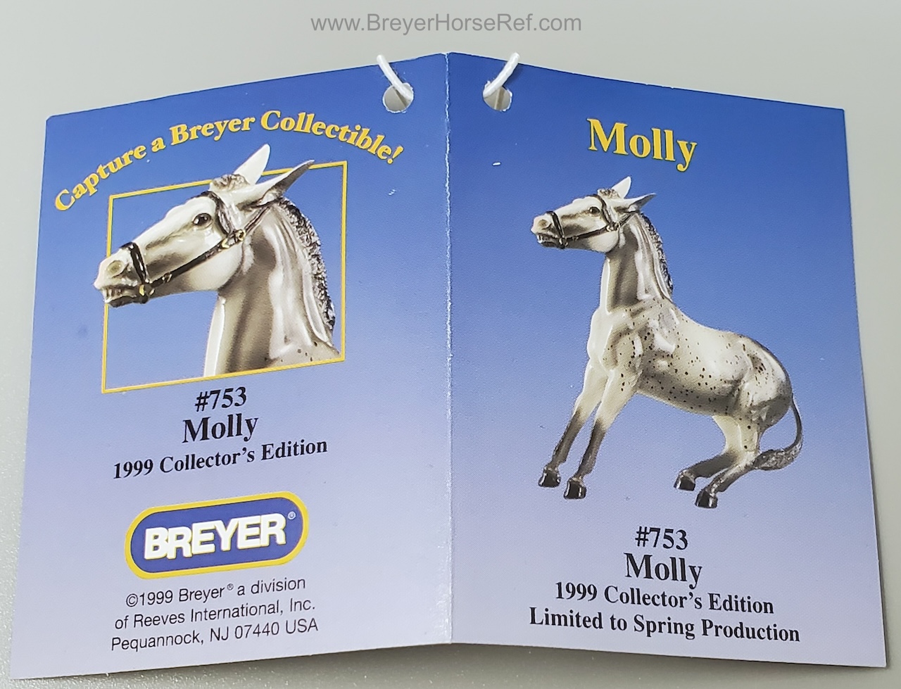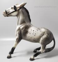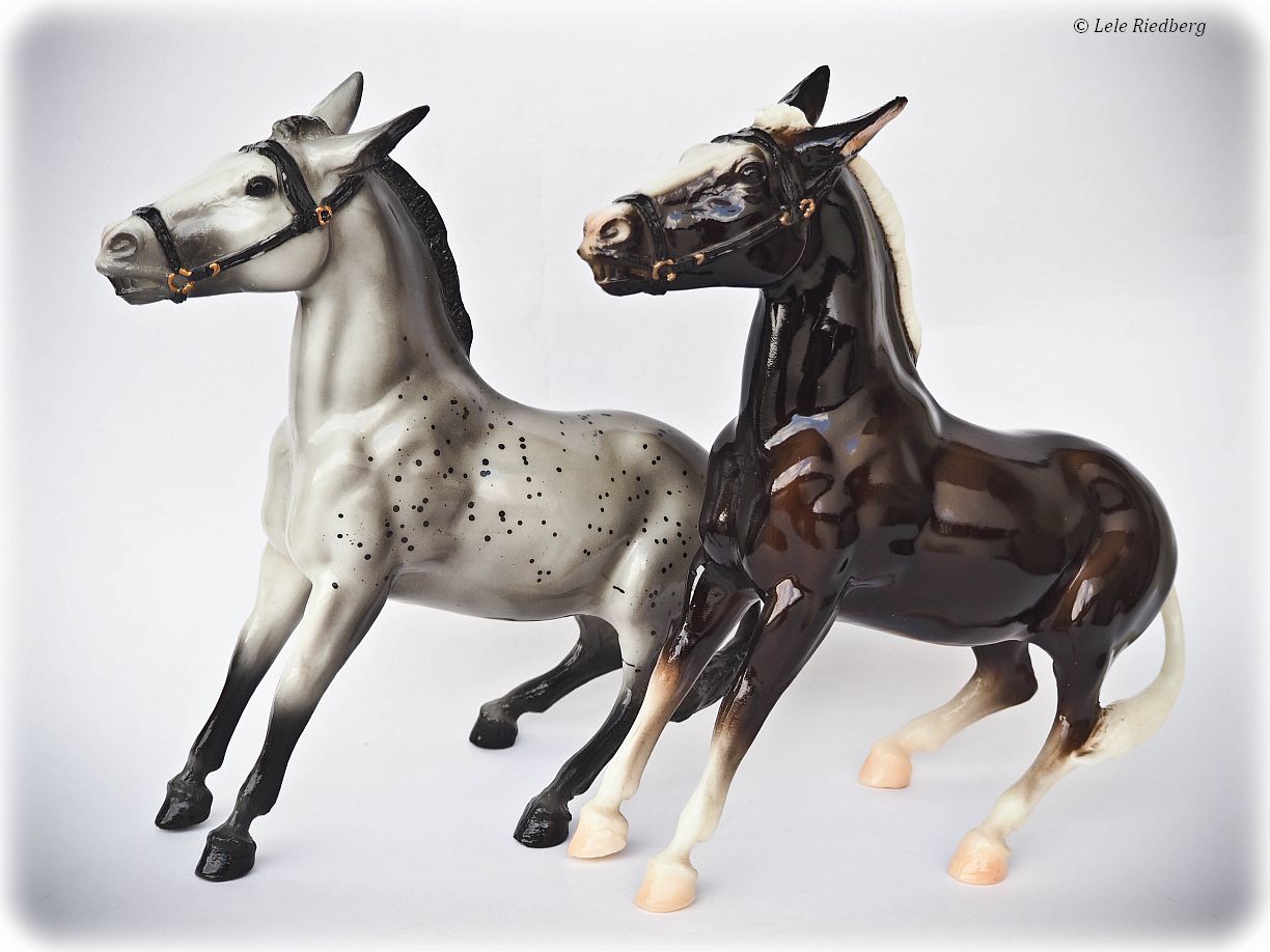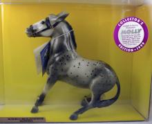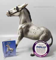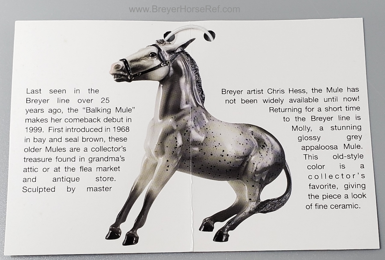 The Balking Mule made its first regular line appearance in over 30 years as Molly and Dolly, the first releases in the Collector's Edition lineup. Painted in glossy grey appaloosa and glossy charcoal, these stubborn ladies were the perfect introduction to the series for vintage Breyer fans! To add to their collectibility factor, each model was made for only six months, transitioning to the second color during the Mid-Year season." www.breyerhorses.com.