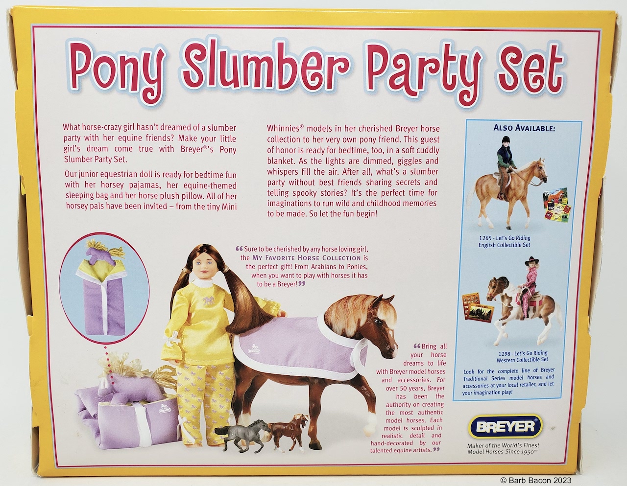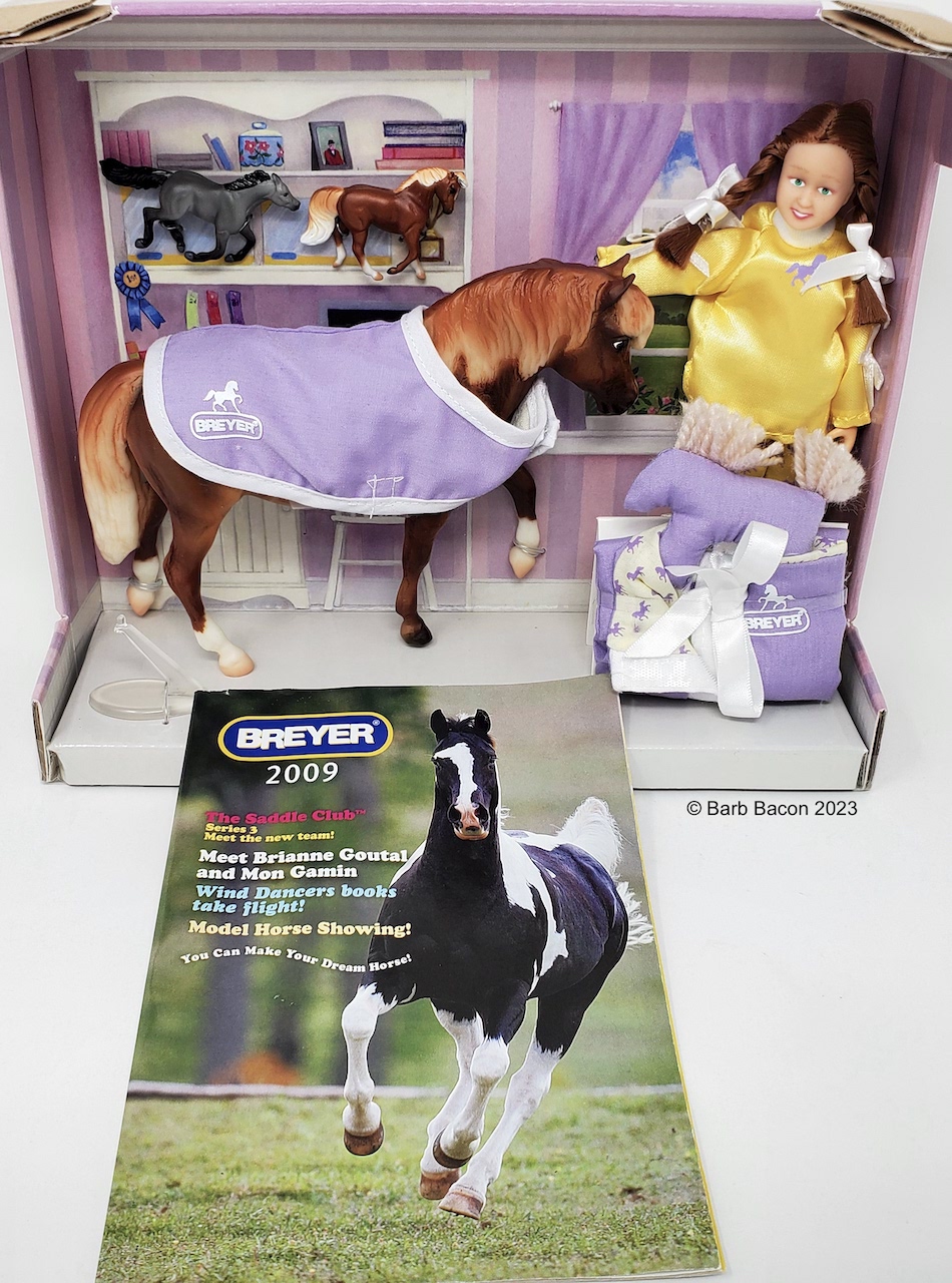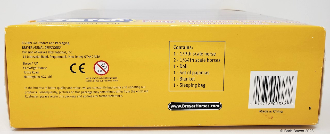 My Favorite Horses Series #1386 Pony Slumber Party Set included the Cantering Morgan, Galloping Mustang, Merrylegs, Doll, Horse Blanket, Sleeping Bag and Pillow from 2009-2010. On the 2010 Retired List.