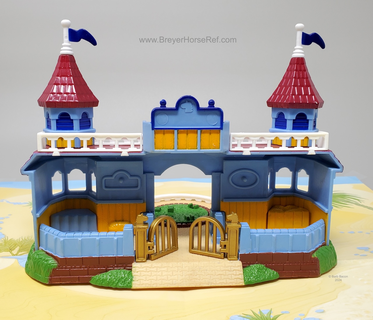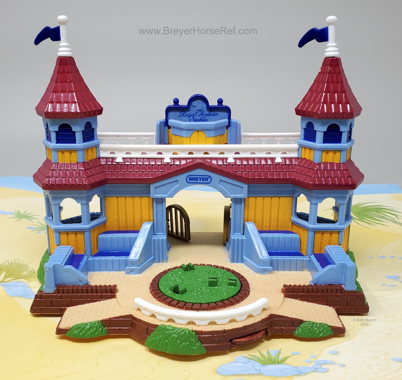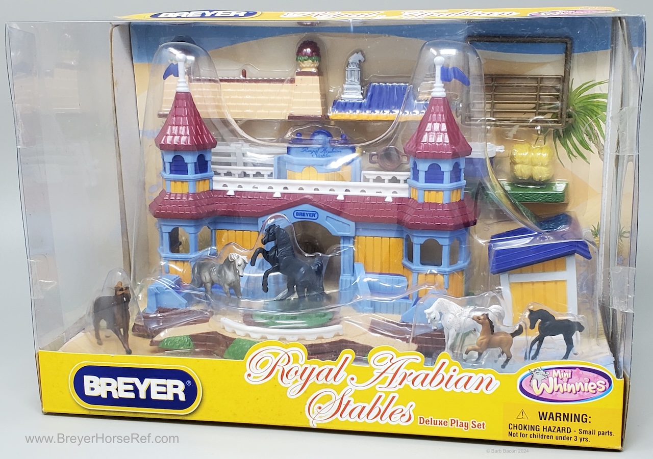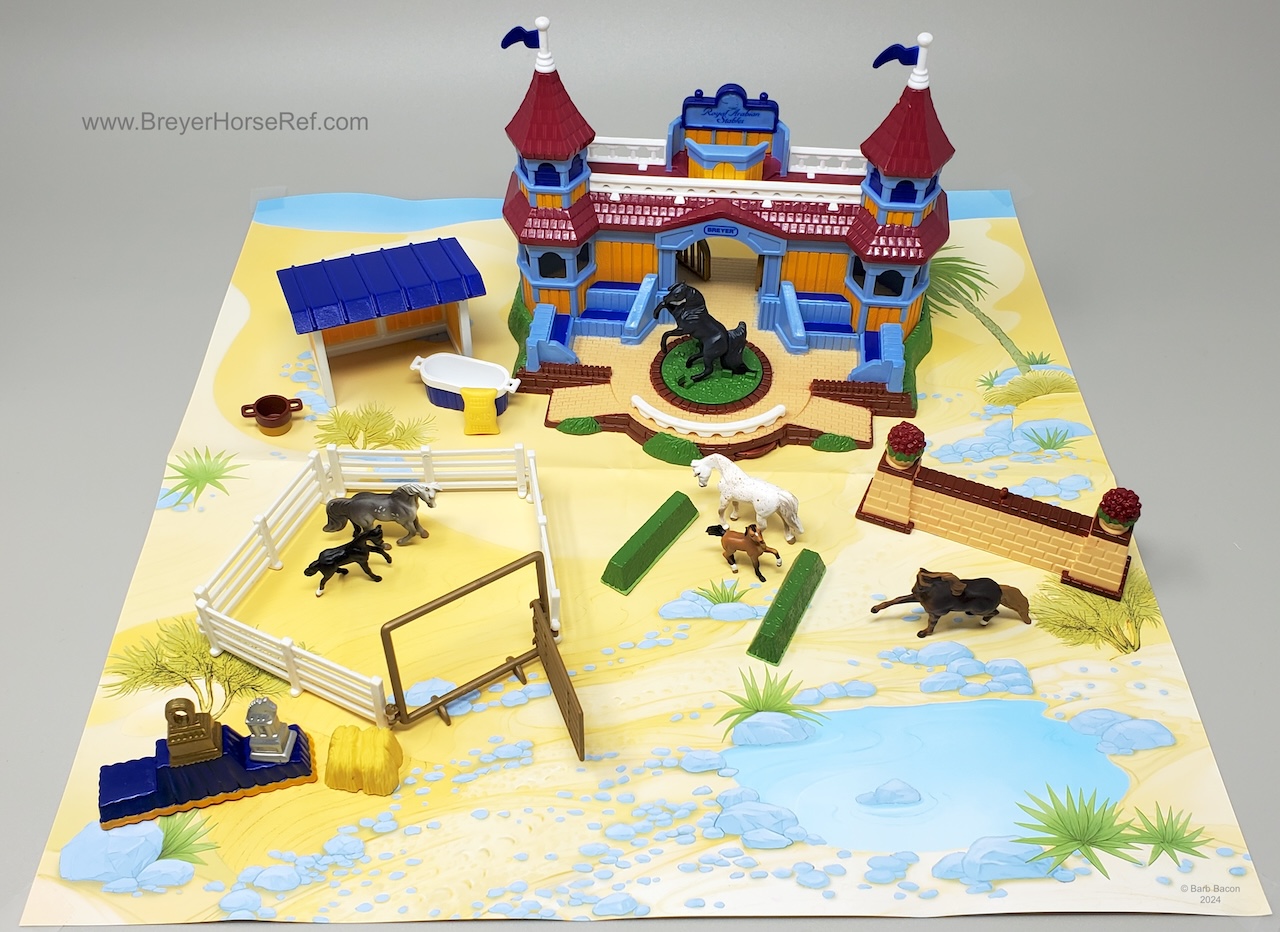 Set #300112 Royal Arabian Play Set from 2006-2007, included the Cantering Morgan, Playful Arabian, Prancing Foal, Romping Foal, Trotting Morgan, Walking Arabian, Castle, Stall, Corral with Gate, 3 Jumps, Water Trough, Oat Bag, Bucket, Trophy Stand, Gold and Silver Trophies, Hay Bale and Play Mat.