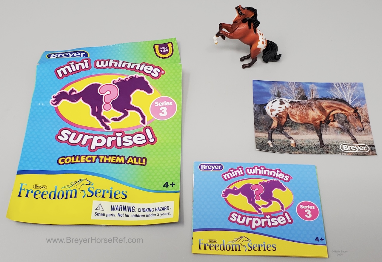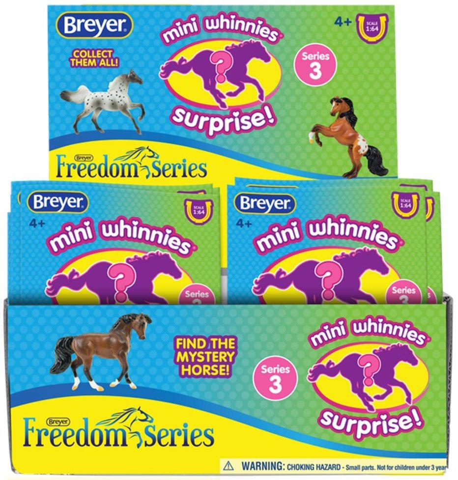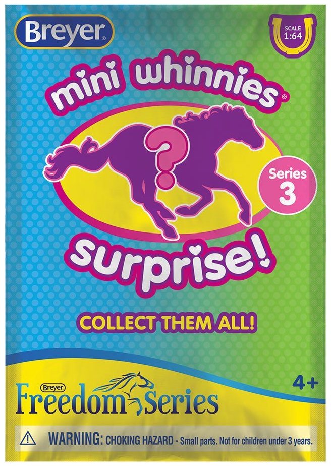 "You're in for a surprise each time you open one of the 1:64 scale Mini Whinnies Surprise packs! With 18 different horses to collect, including the special copper florentine "Treasure" horse, you will keep coming back for more!" www.breyerhorses.com.