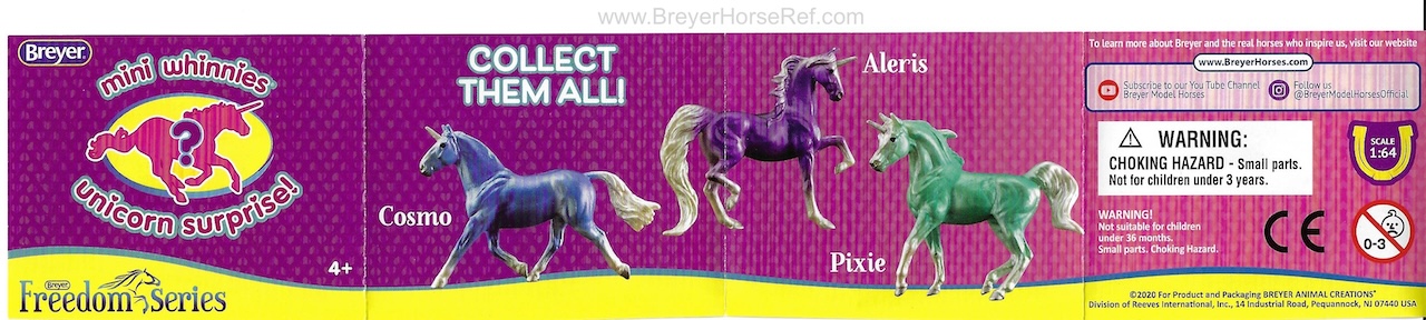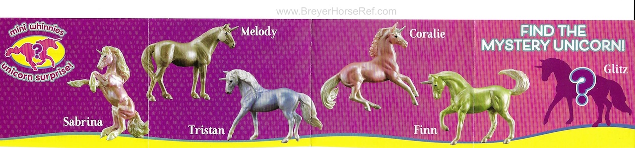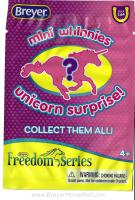 "Mini Whinnies Unicorns! There are 8 different models, each in its own blind bag with sticker and mini brochure. These beautiful unicorns are sure to enchant any unicorn lover. And to make it more exciting, a random golden chase horse might be found in every 96 packages." www.breyerhorses.com. Individual Bags #300196 and Display is #300197.