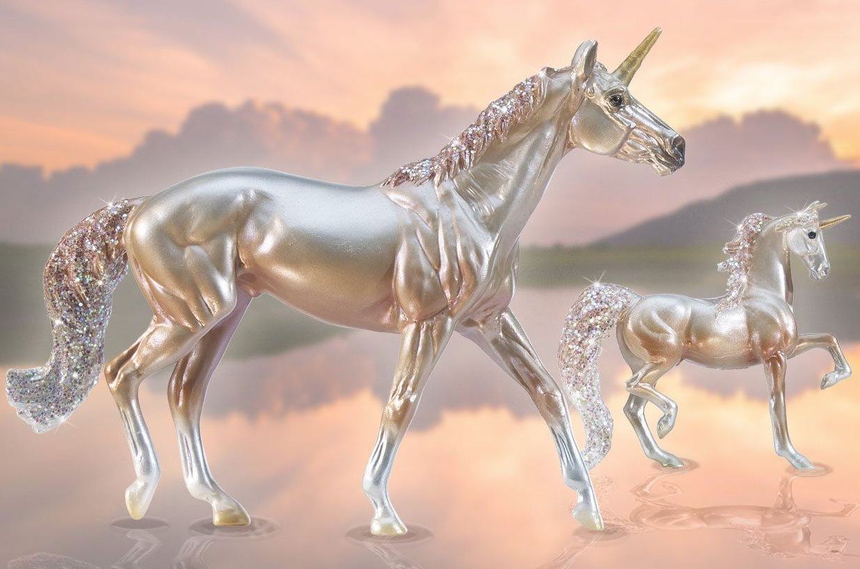 "The Fairytale Friends spread their magic with a brilliant unicorn stallion named Sunchaser! Aglow with the light of a new day, Sunchaser is ready to strut his stuff with his Mini Whinnies unicorn Saddlebred companion. His pearly silver and bronze coat gorgeously reflects the morning light as he and his miniature friend race to greet the sun. Fairytale Friends is a limited edition collection of magnificent Breyer unicorns: collect all six Fairytale Friends sets. This beautifully hand-painted Stablemates model arrives in a satin bag, and comes with a Mini Whinnies unicorn model whose coat color matches the Stablemate model." www.breyerhorses.com.
