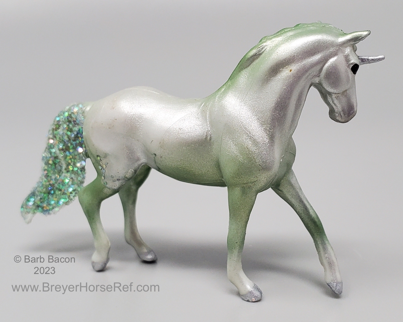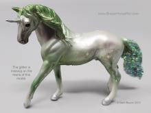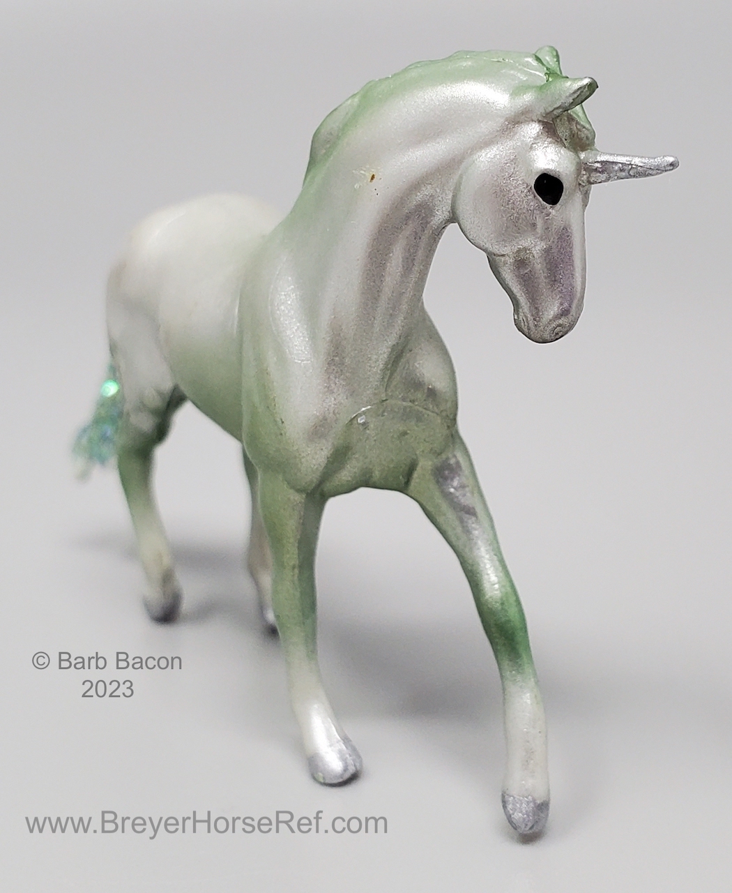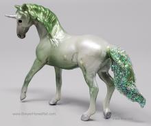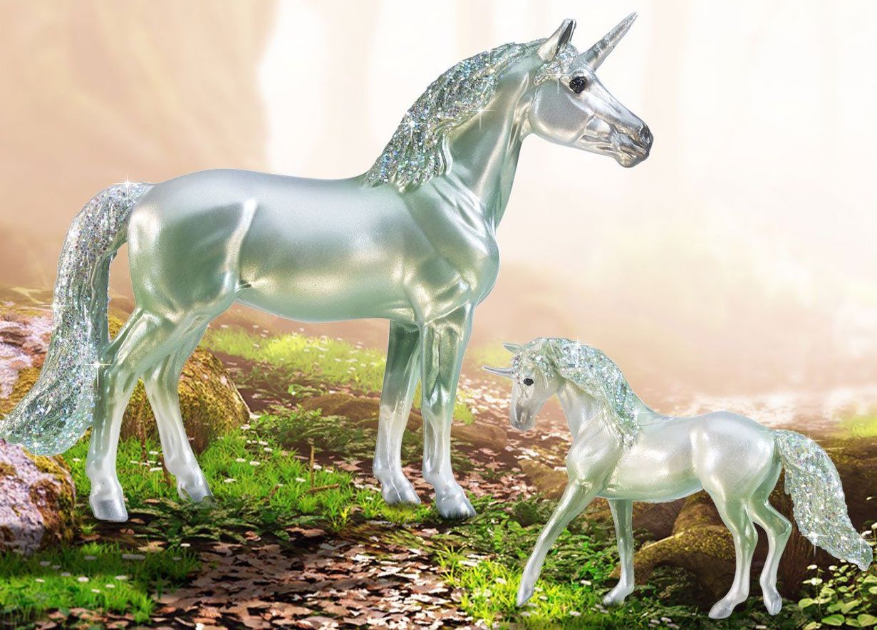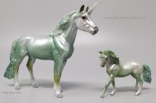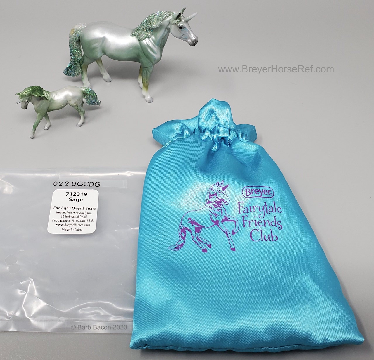"The Fairytale Friends' newest member is Sage! Sage and her best friend, a Mini Whinnies unicorn Spanish Barb, love exploring the outdoors. Their pearl and green coats are the color of new Spring growth, and their manes and tails sparkle as if they were kissed by the morning dew – a perfect look for two nature-loving pals! Fairytale Friends is a limited edition collection of magnificent Breyer unicorns: collect all six Fairytale Friends sets! This beautifully hand-painted Stablemates model arrives in a satin bag, and comes with a Mini Whinnies unicorn model whose coat color matches the Stablemates model." www.breyerhorses.com.
