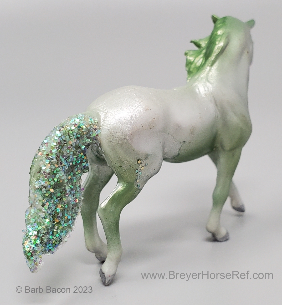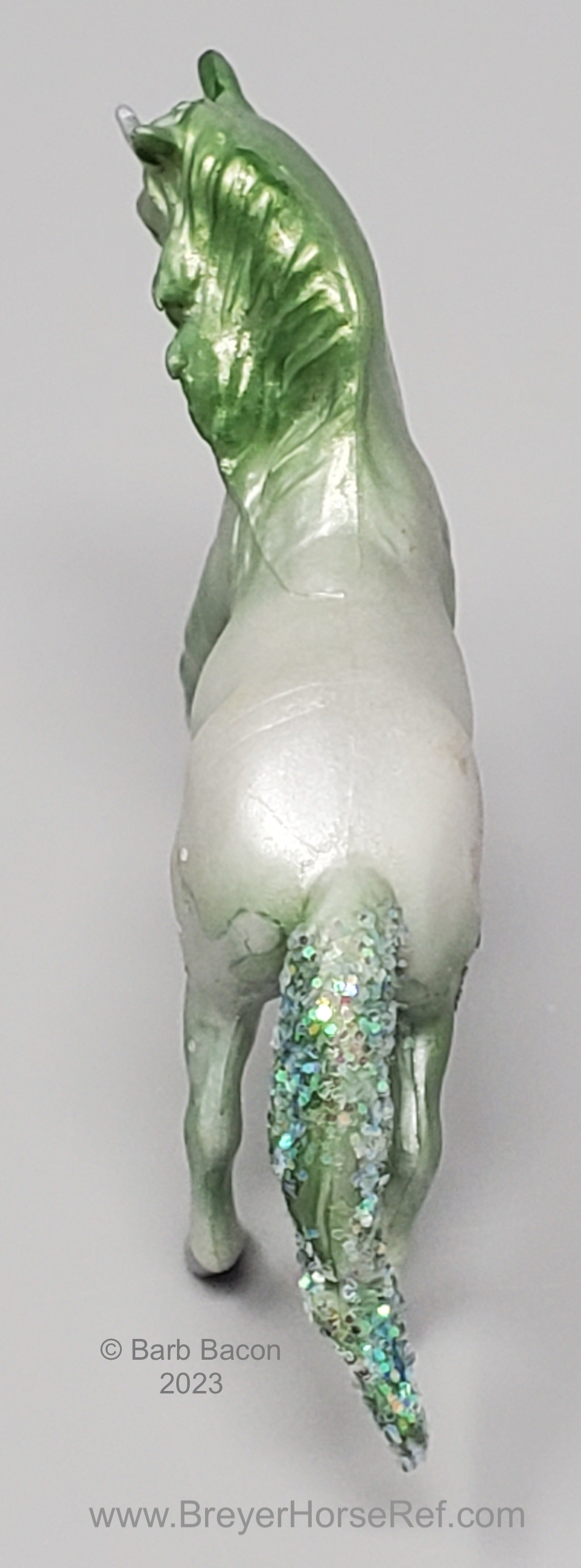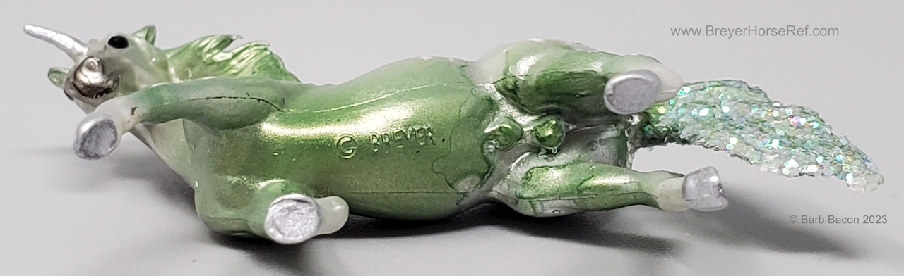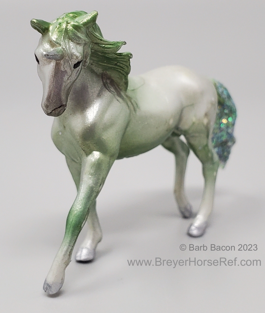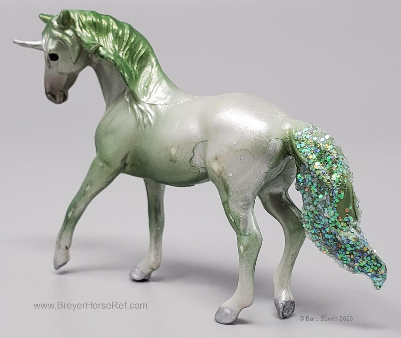 "The Fairytale Friends' newest member is Sage! Sage and her best friend, a Mini Whinnies unicorn Spanish Barb, love exploring the outdoors. Their pearl and green coats are the color of new Spring growth, and their manes and tails sparkle as if they were kissed by the morning dew – a perfect look for two nature-loving pals! Fairytale Friends is a limited edition collection of magnificent Breyer unicorns: collect all six Fairytale Friends sets! This beautifully hand-painted Stablemates model arrives in a satin bag, and comes with a Mini Whinnies unicorn model whose coat color matches the Stablemates model." www.breyerhorses.com.