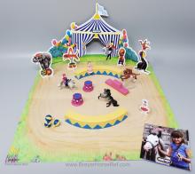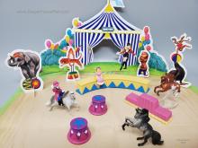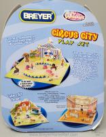 Set #300130 Circus City Backpack Play Set from 2008-2009, included the Big Lick TWH, Leaping Lipizzan, Rearing Andalusian, Arena, 2 Round Stands, Podium, Two Dolls, 3 Balls, Cardboard Pop-Outs and Play Mat with Big Top Backdrop. Released late in 2008, so not pictured in the catalog. 2009 Catalog mentions 4 horses in this set, but there were only 3. This was on both the 2008 and 2009 Retired Lists.