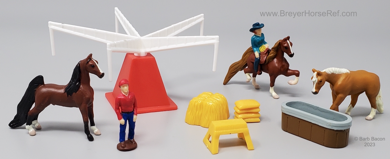 Also in 1997, this model was released in the Series 1 set #3970 Carousel Cool-Down Playset. Set included a Bay Show Pose Saddlebred, Chestnut High Stepping Saddlebred, Palomino Jog Trot Mare, 2 dolls, hot walker, water trough, stool, feed bags and hay bale.
