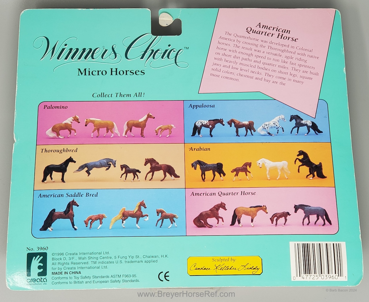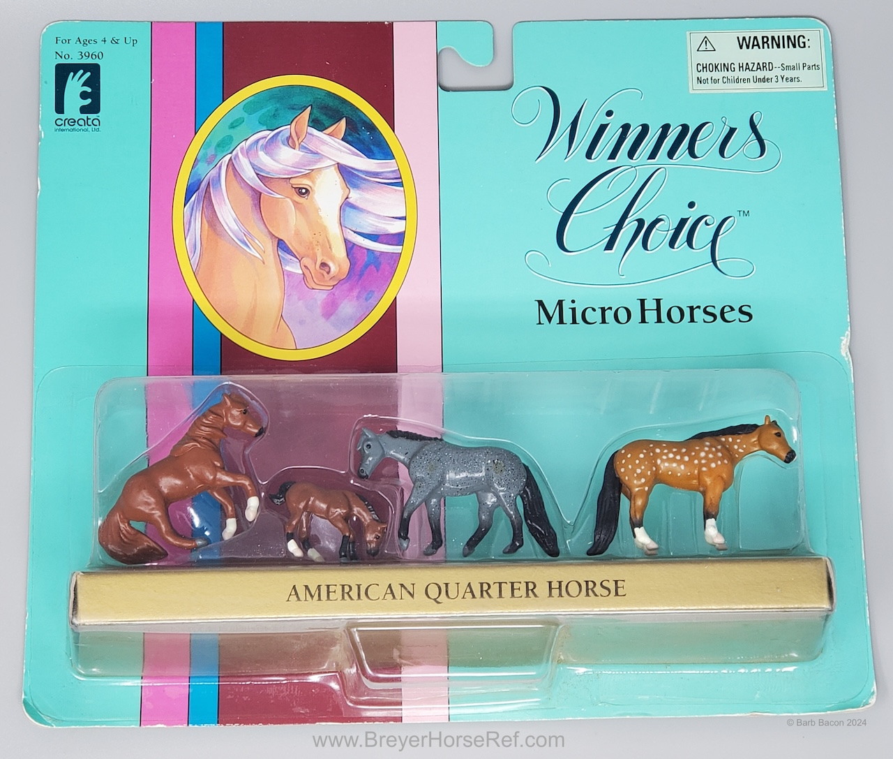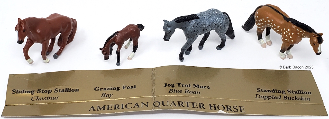 This model was released in the Series I American Quarter Horse Set #3960, Winners Choice Micro Horses by Creata International. Per Artist Candace Liddy, the packaging was completed in 1996, however the models were not available until 1997. Breyer bought this mold in 2004.