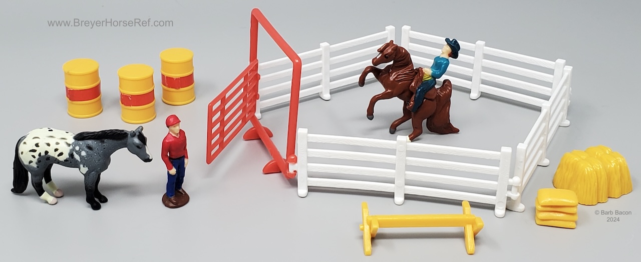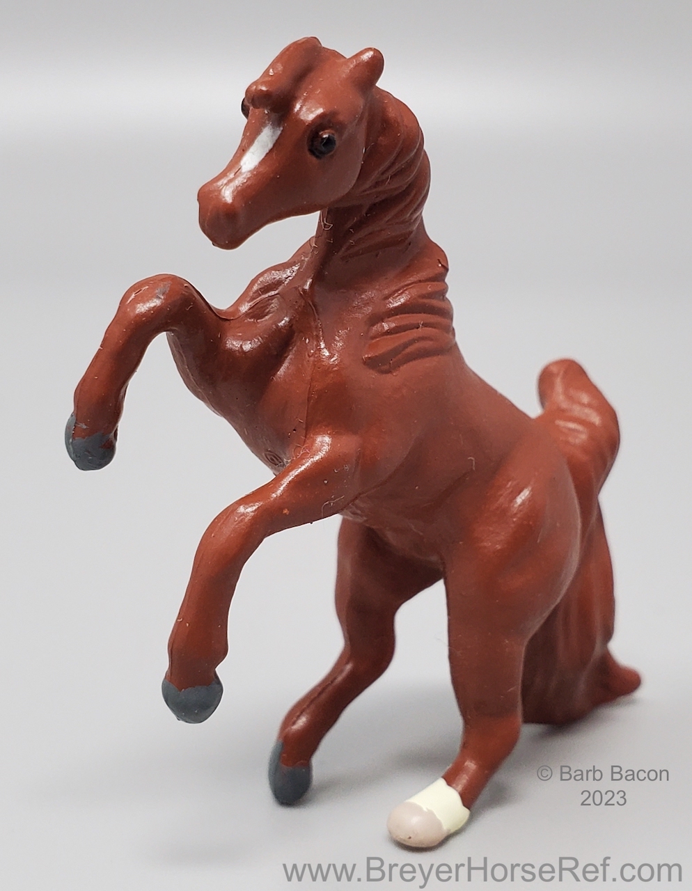This model was released in the Series I Champion Corral Playset #3970, Winners Choice Micro Horses by Creata International. Per Artist Candace Liddy, the packaging was completed in 1996, however the models were not available until 1997. Breyer bought this mold and accessories in 2004. Set included a Chestnut Playful Arabian and Grey Appaloosa Standing Quarter Horse, fencing, gate, 2 dolls, 3 barrels, feed bags, hay bale and jump.