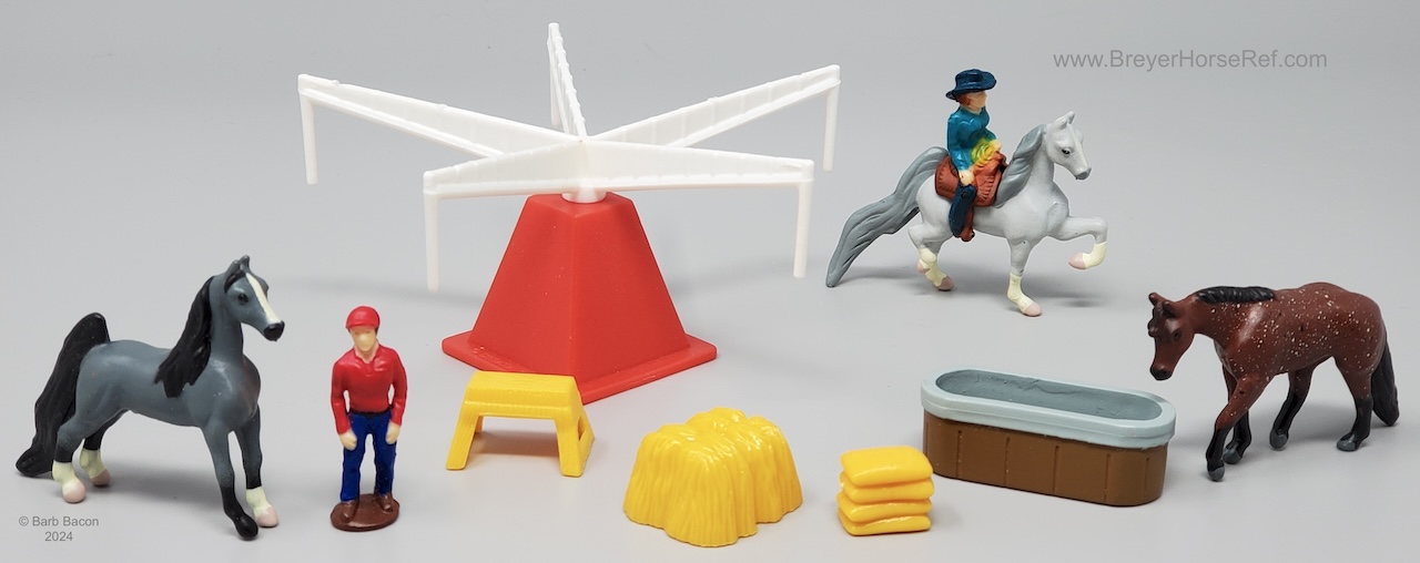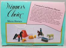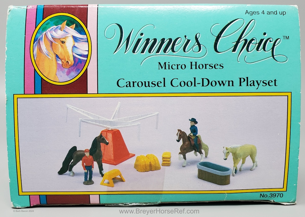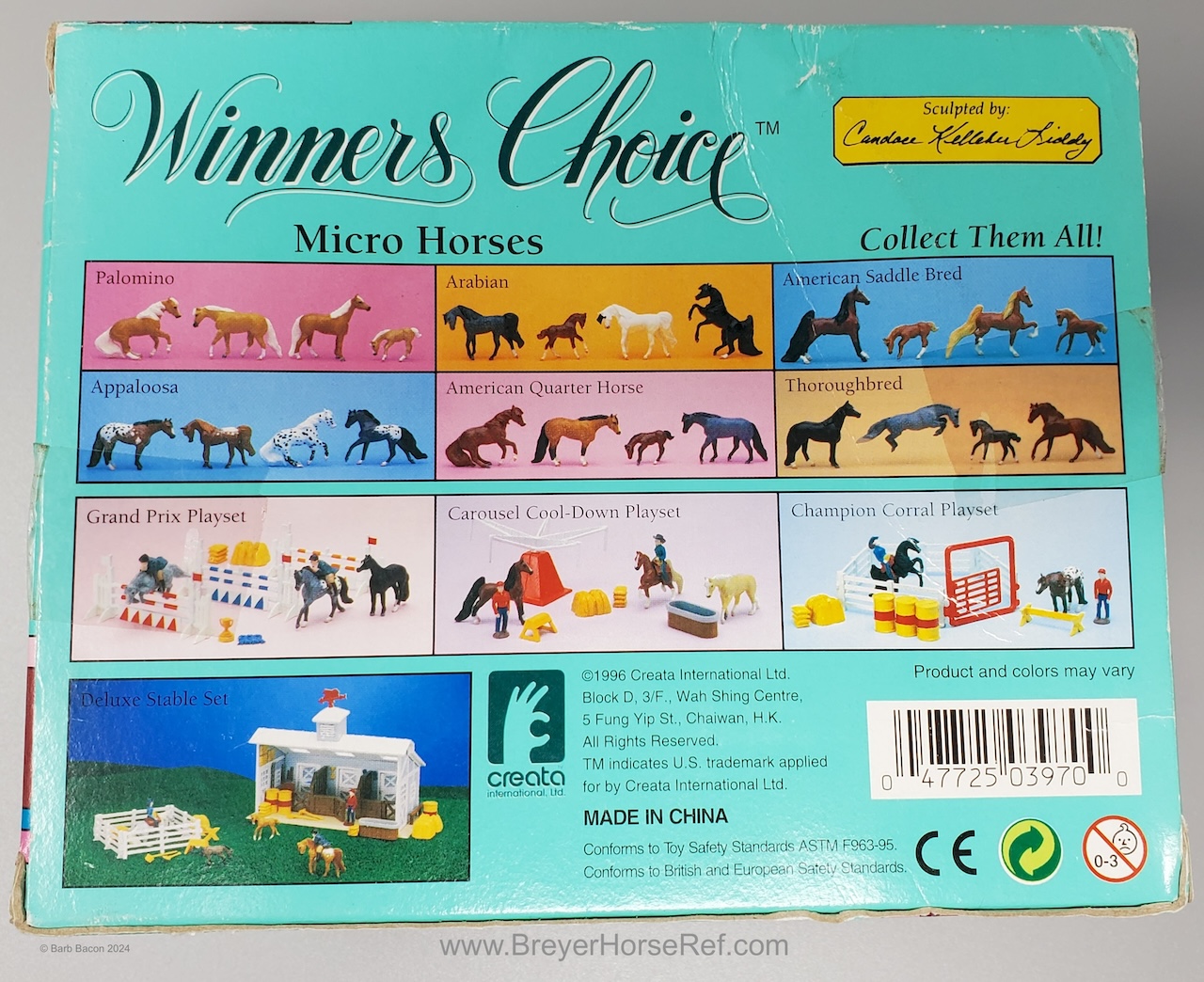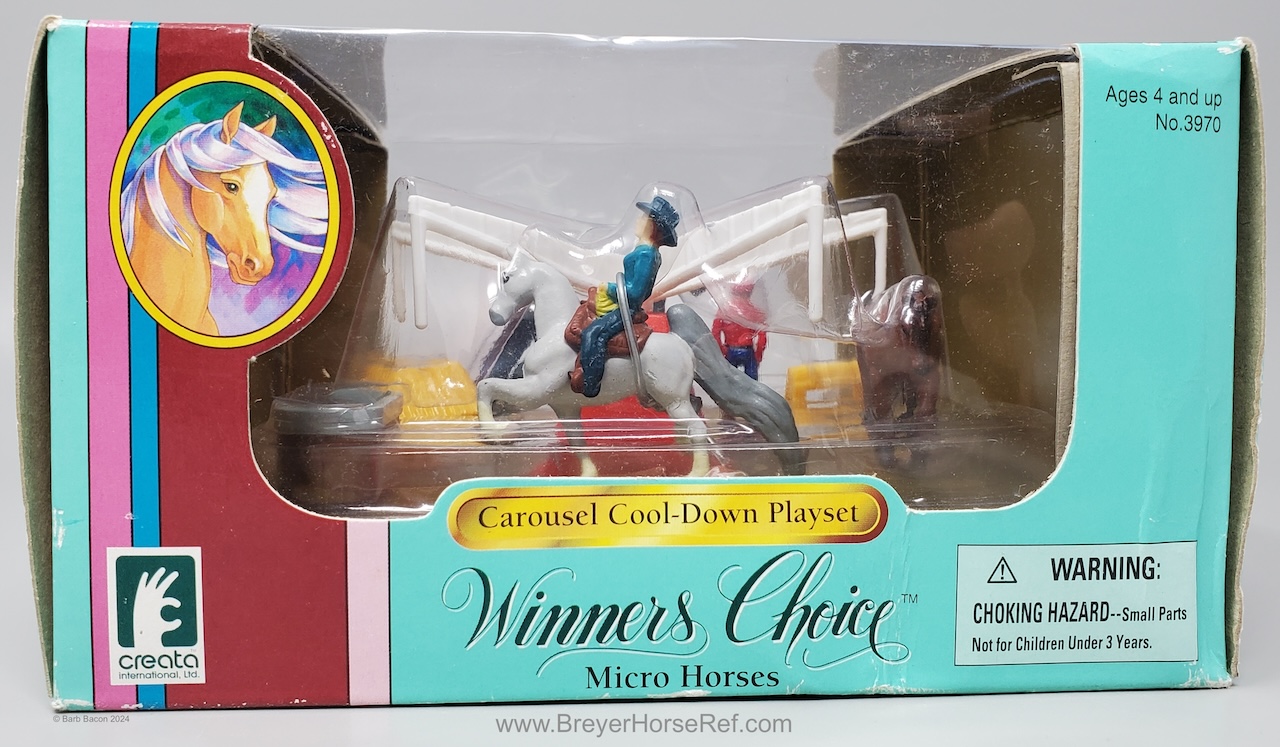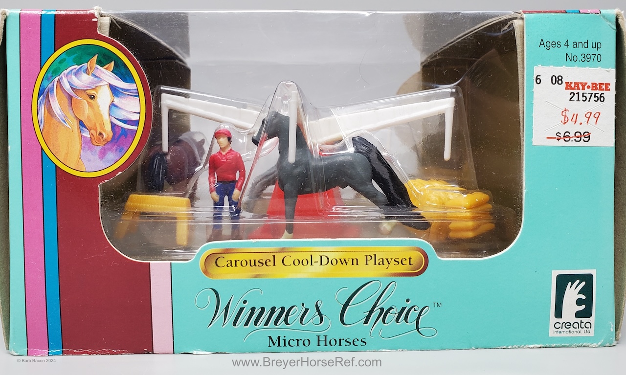This model was released in the Series I Carousel Cool-Down Playset #3970, Winners Choice Micro Horses by Creata International. Per Artist Candace Liddy, the packaging was completed in 1996, however the models were not available until 1997. Set included a Dark Grey with Black Points Show Pose Saddlebred, Light Grey High Stepping Saddlebred, Bay Jog Trot Mare, 2 dolls, hot walker, water trough, stool, feed bags and hay bales. Breyer bought this mold and accessories in 2004.