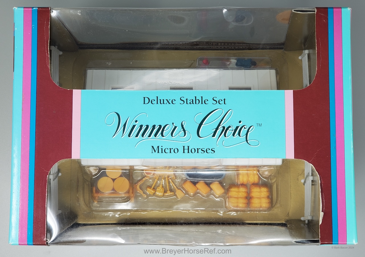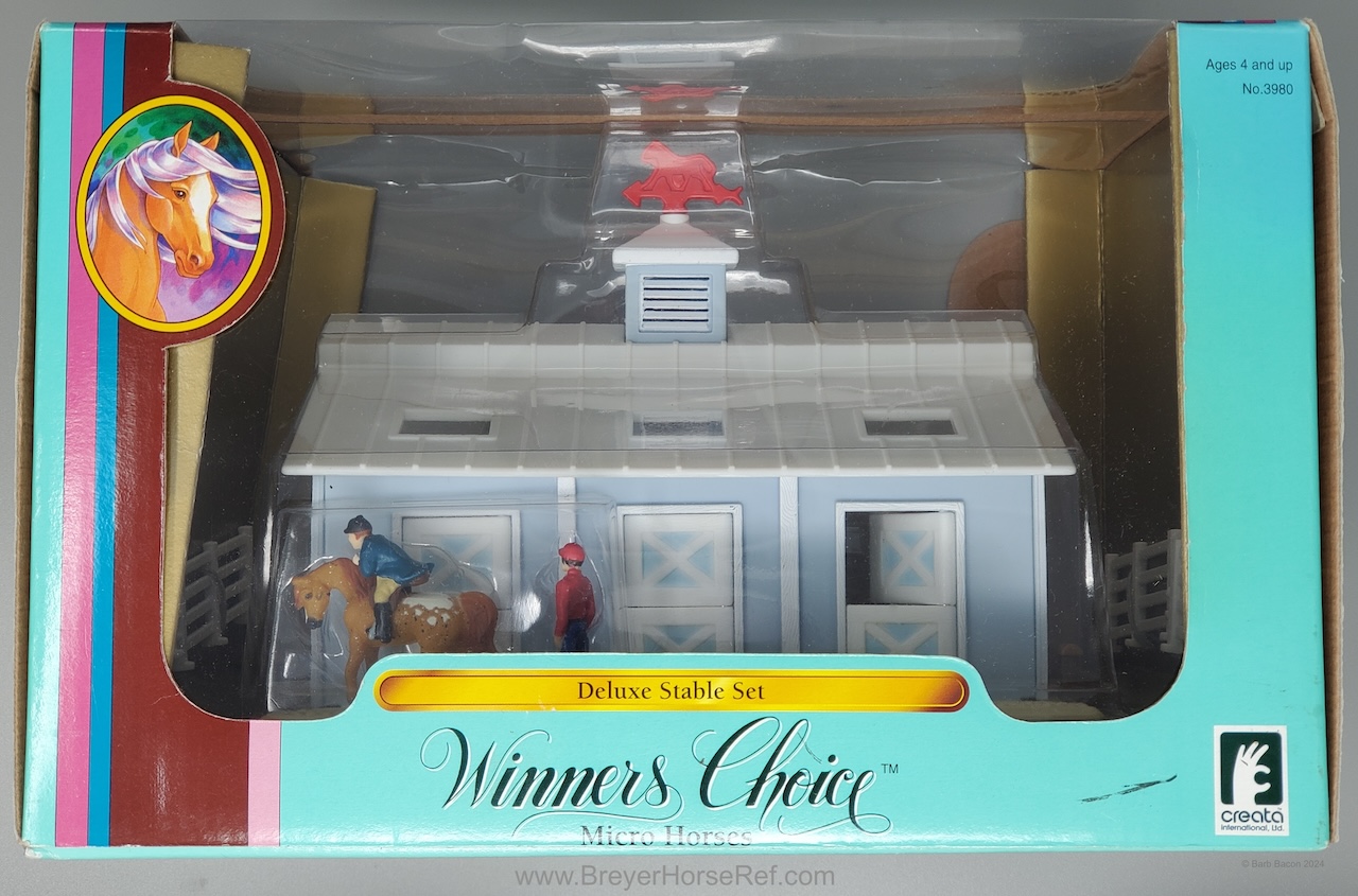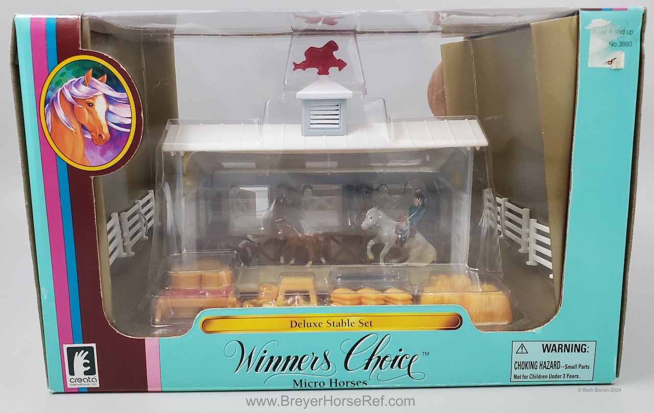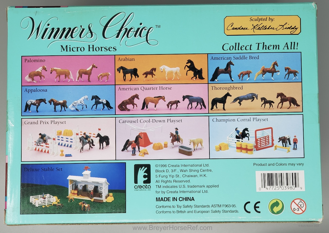 This model was released in the Series I Deluxe Stable Playset #3970, Winners Choice Micro Horses by Creata International. Per Artist Candace Liddy, the packaging was completed in 1996, however the models were not available until 1997. Breyer bought this mold and accessories in 2004. This set included a Dun Appaloosa Walking Arabian, Grey Sliding Stop QH, Bay Grazing Foal, Chestnut Romping Foal, stable, 3 dolls, 3 barrels, feed bags, hay bales, water trough and misc accessories. This set was also listed as a Series 2 #3980 for 1997. This set was produced for Mass Market stores (larger retail stores like Target).