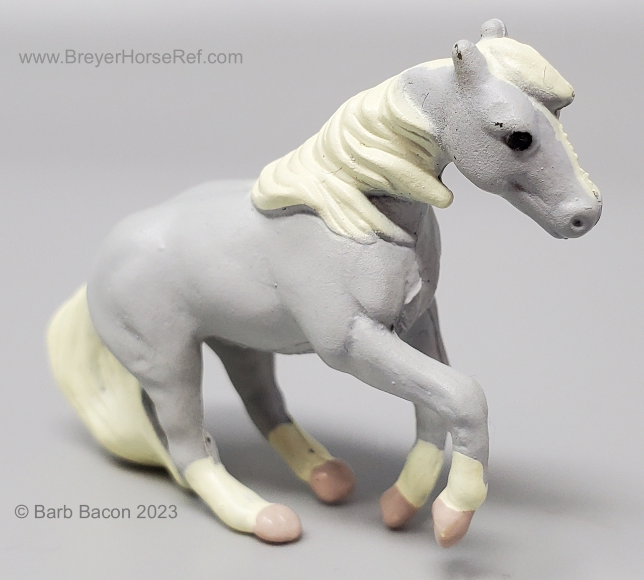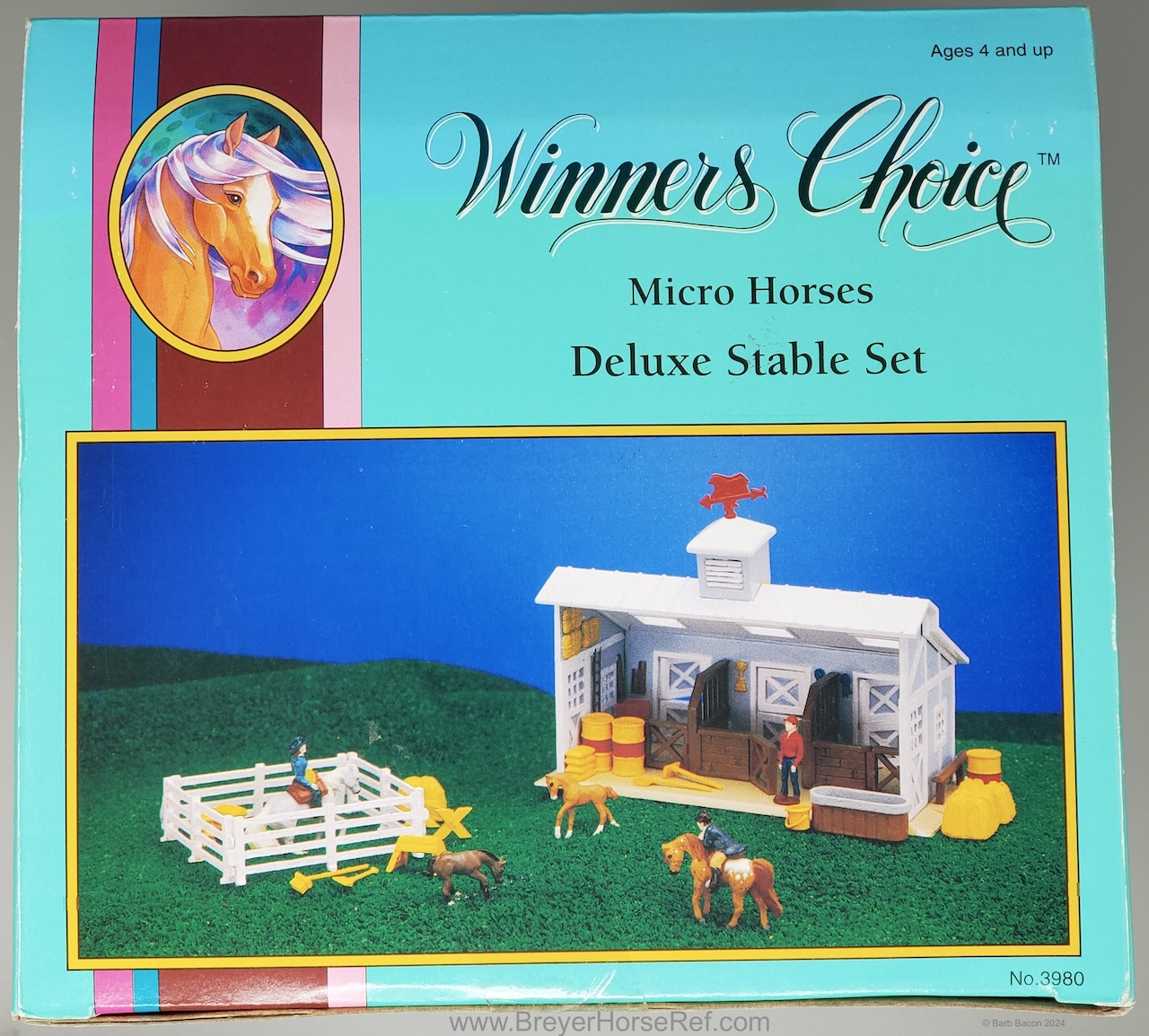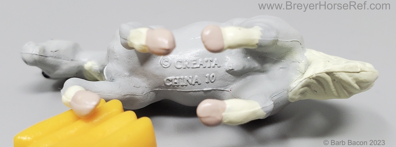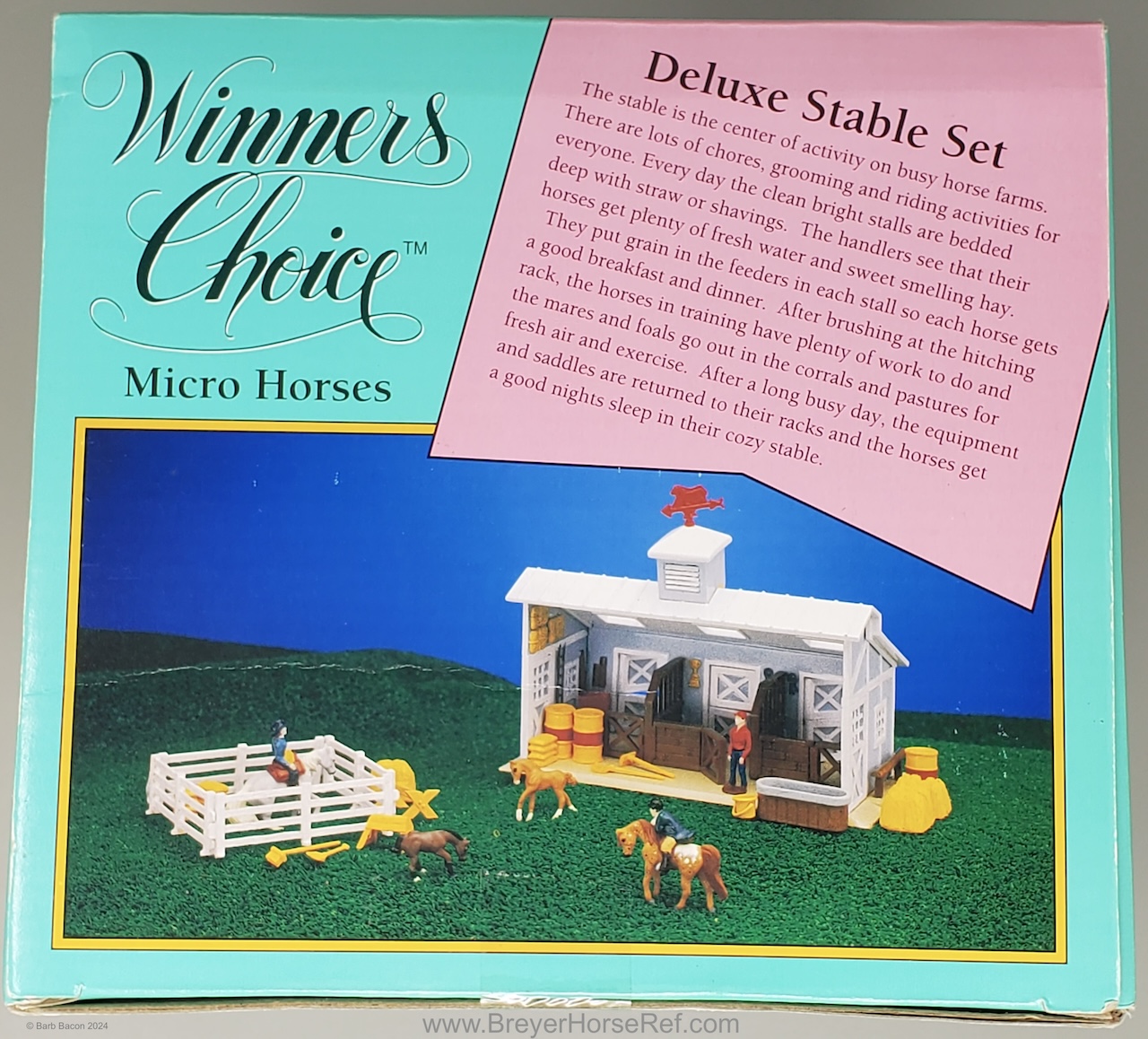 This model was released in the Series I Deluxe Stable Playset #3970, Winners Choice Micro Horses by Creata International. Per Artist Candace Liddy, the packaging was completed in 1996, however the models were not available until 1997. Breyer bought this mold and accessories in 2004. This set included a Dun Appaloosa Walking Arabian, Grey Sliding Stop QH, Bay Grazing Foal, Chestnut Romping Foal, stable, 3 dolls, 3 barrels, feed bags, hay bales, water trough and misc accessories. This set was also listed as a Series 2 #3980 for 1997. This set was produced for Mass Market stores (larger retail stores like Target).