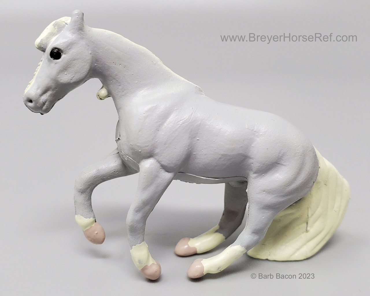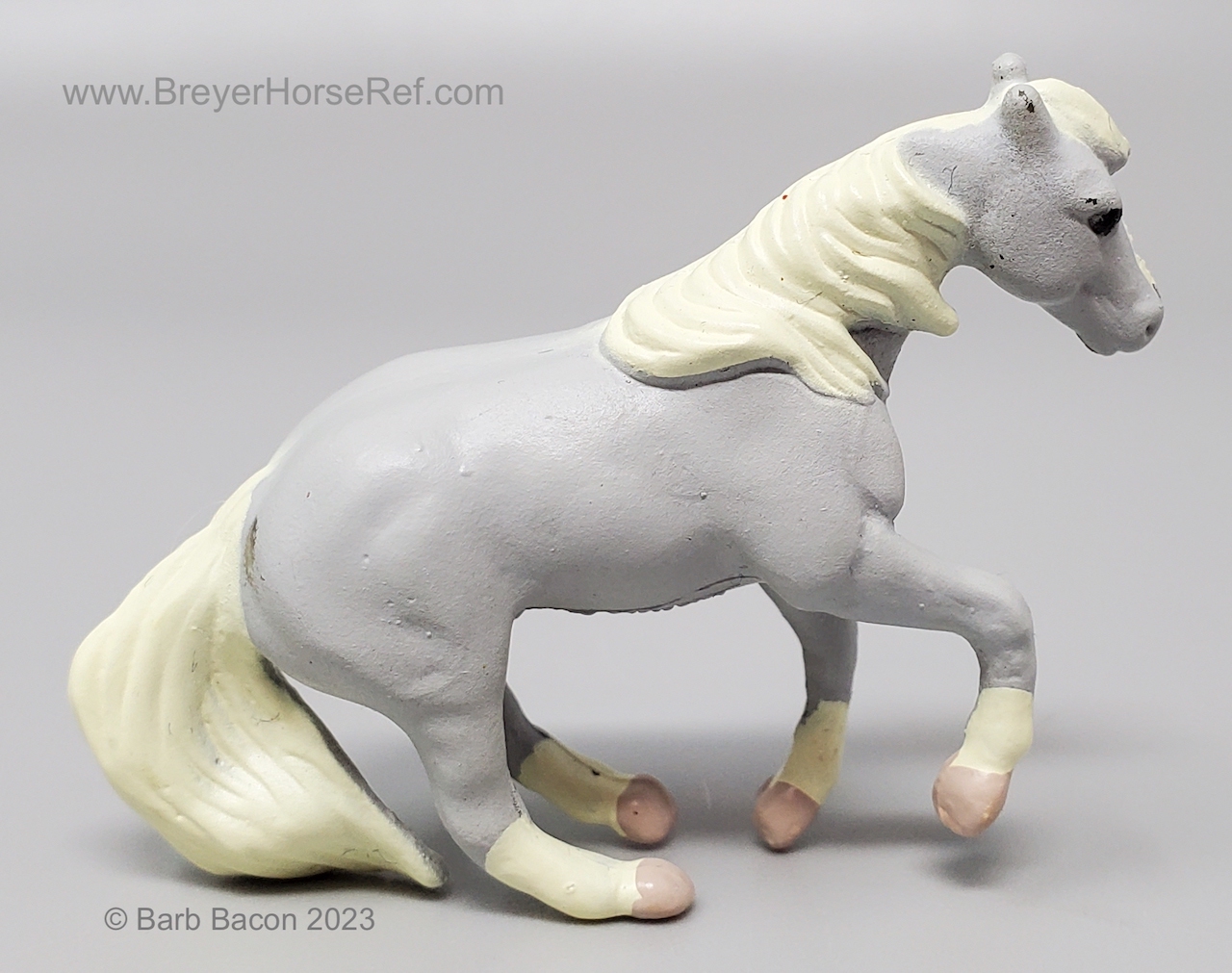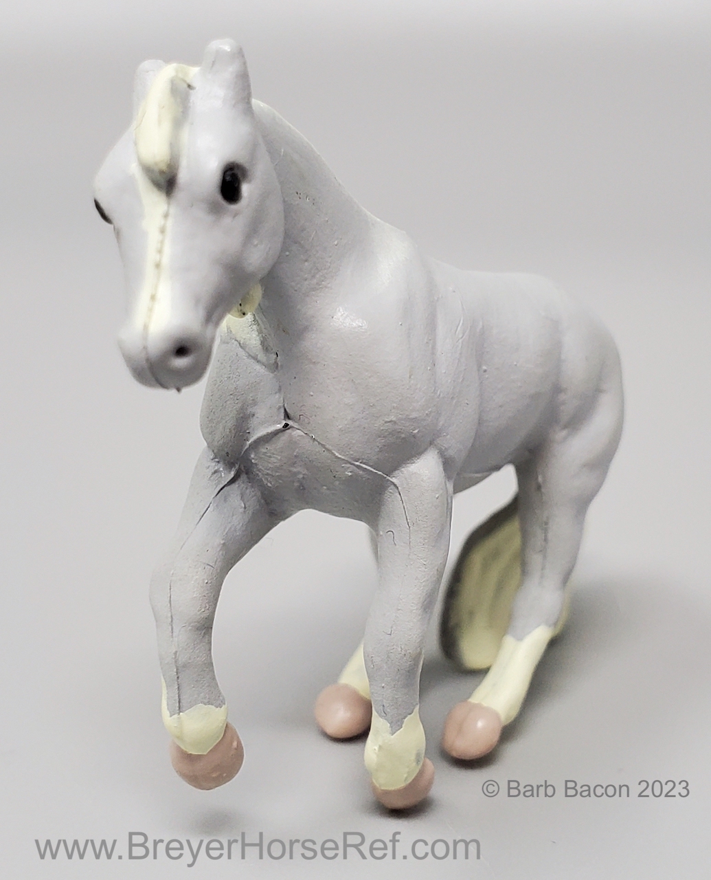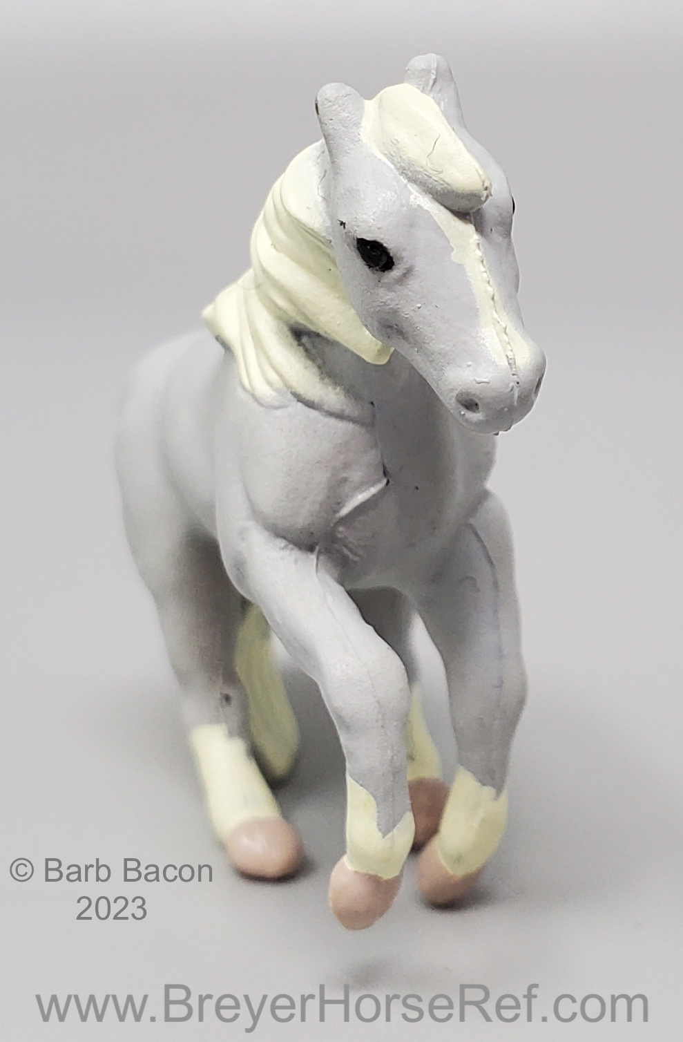 This model was released in the Series I Deluxe Stable Playset #3970, Winners Choice Micro Horses by Creata International. Per Artist Candace Liddy, the packaging was completed in 1996, however the models were not available until 1997. Breyer bought this mold and accessories in 2004. This set included a Dun Appaloosa Walking Arabian, Grey Sliding Stop QH, Bay Grazing Foal, Chestnut Romping Foal, stable, 3 dolls, 3 barrels, feed bags, hay bales, water trough and misc accessories. This set was also listed as a Series 2 #3980 for 1997. This set was produced for Mass Market stores (larger retail stores like Target).