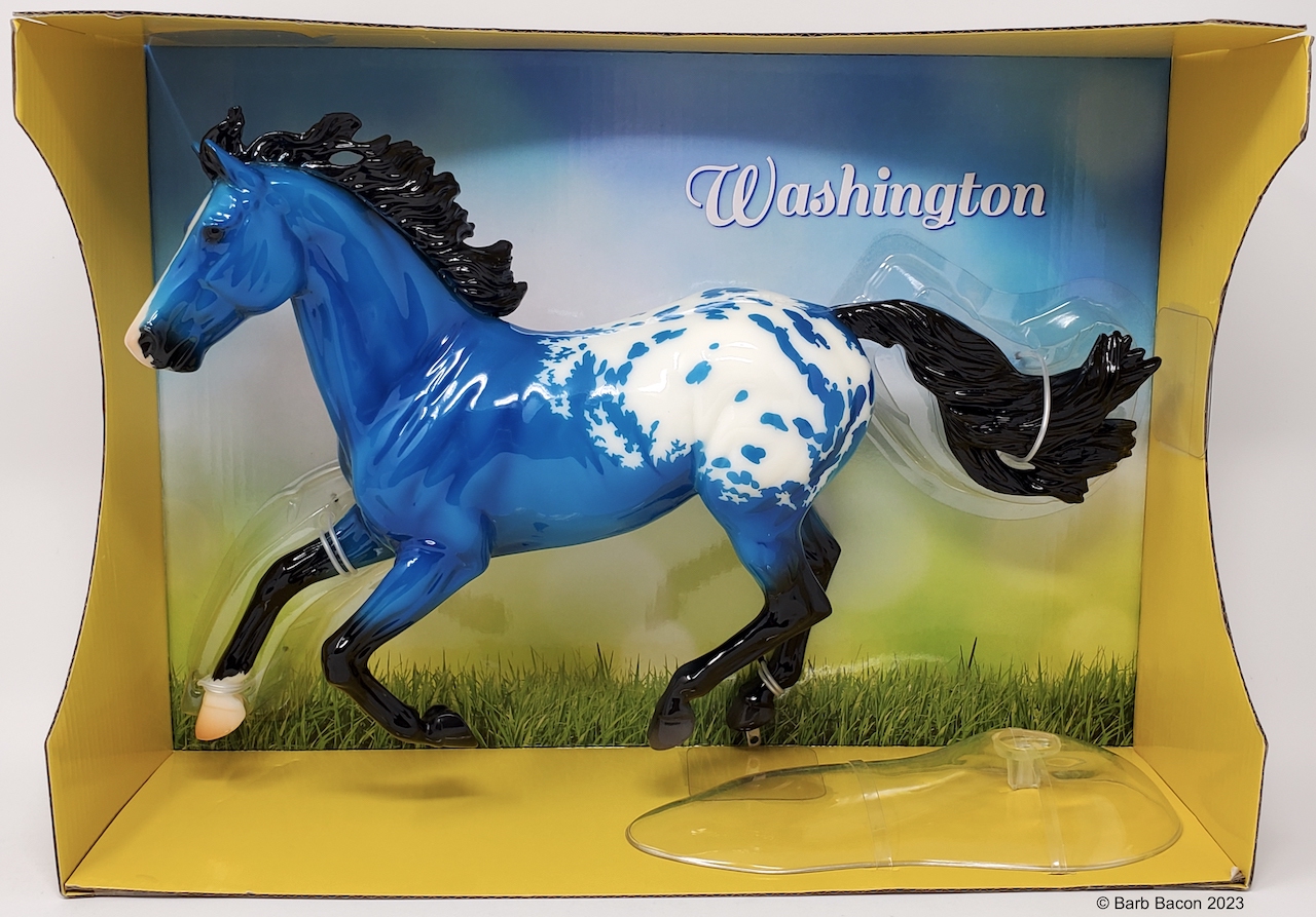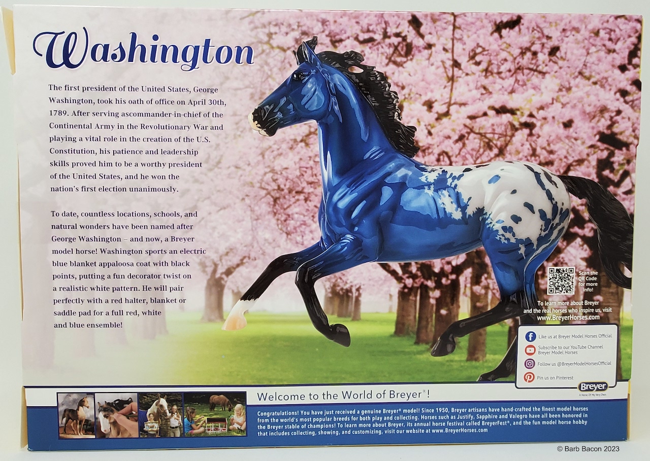 To date, countless locations, schools, and natural wonders have been named after George Washington – and now, a Breyer model horse! Washington sports an electric blue blanket appaloosa coat with black points, putting a fun decorator twist on a realistic white pattern. He will pair perfectly with a red halter, blanket, or saddle pad for a full red, white and blue ensemble!" www.breyerhorses.com.