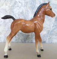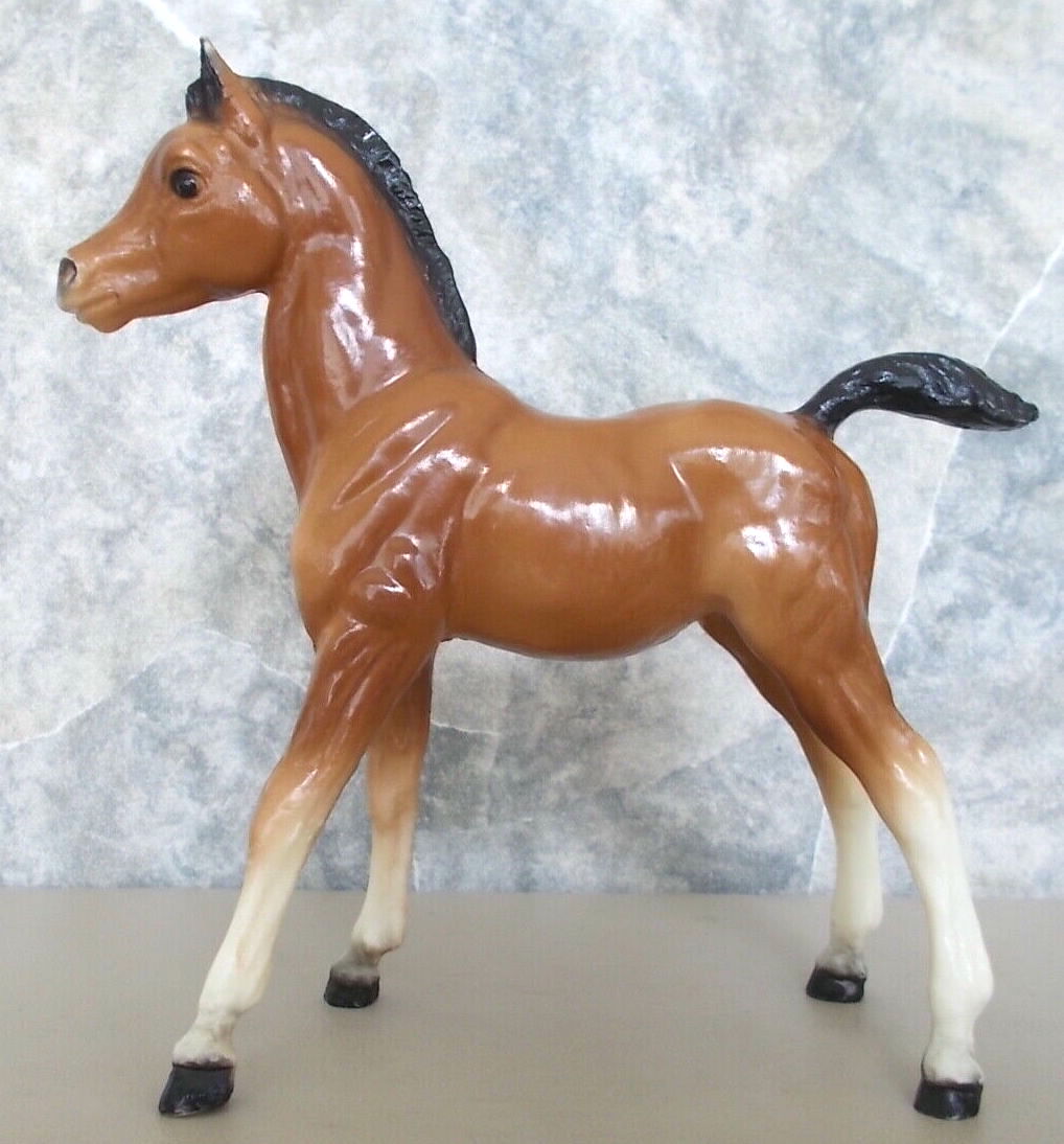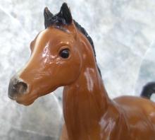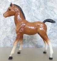Bay with long stripe to the nose, black mane and tail but no black on the legs, and four stockings. The bay color can vary from light shades of brown, have reddish tones, or be a dark chocolate brown. The name 'Shah' was dropped by the 1969 catalog. Models were advertised in a matte finish in the later 1968 catalog. The small Blue ribbon stickers were on the glossy bay FAFs. See separate record for the Matte variation.