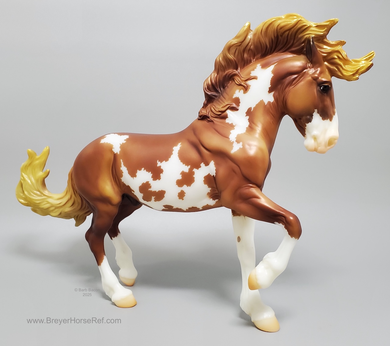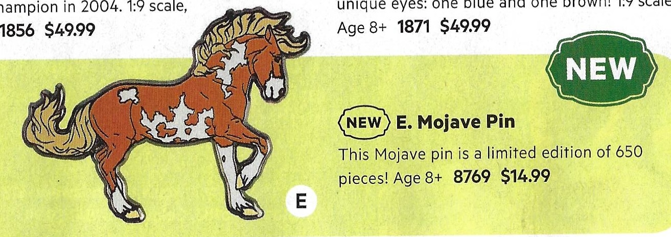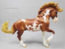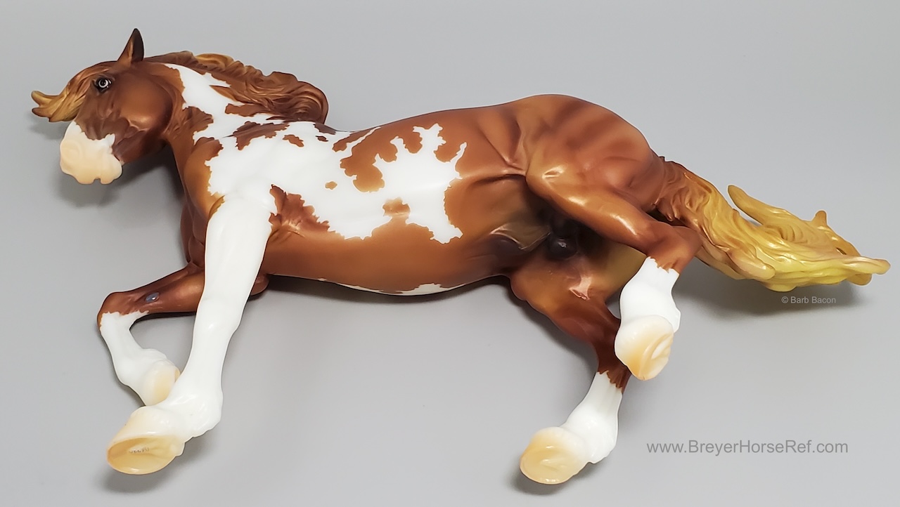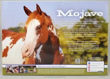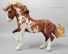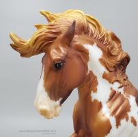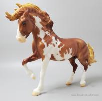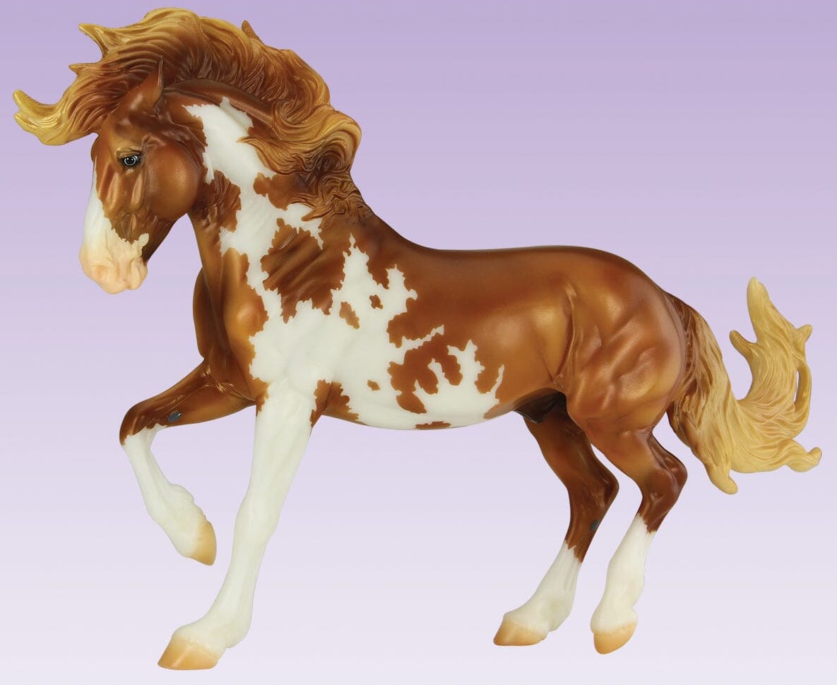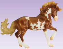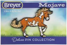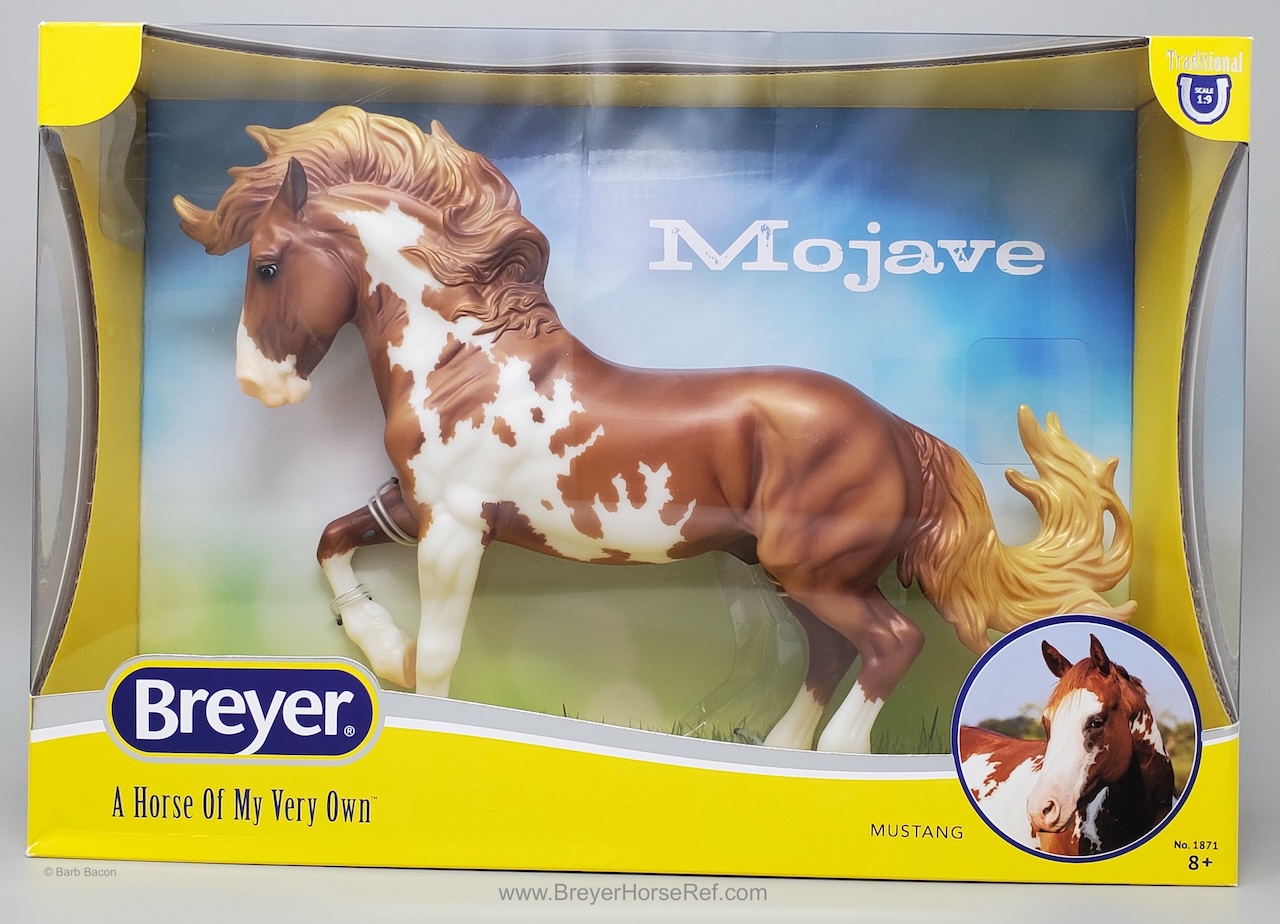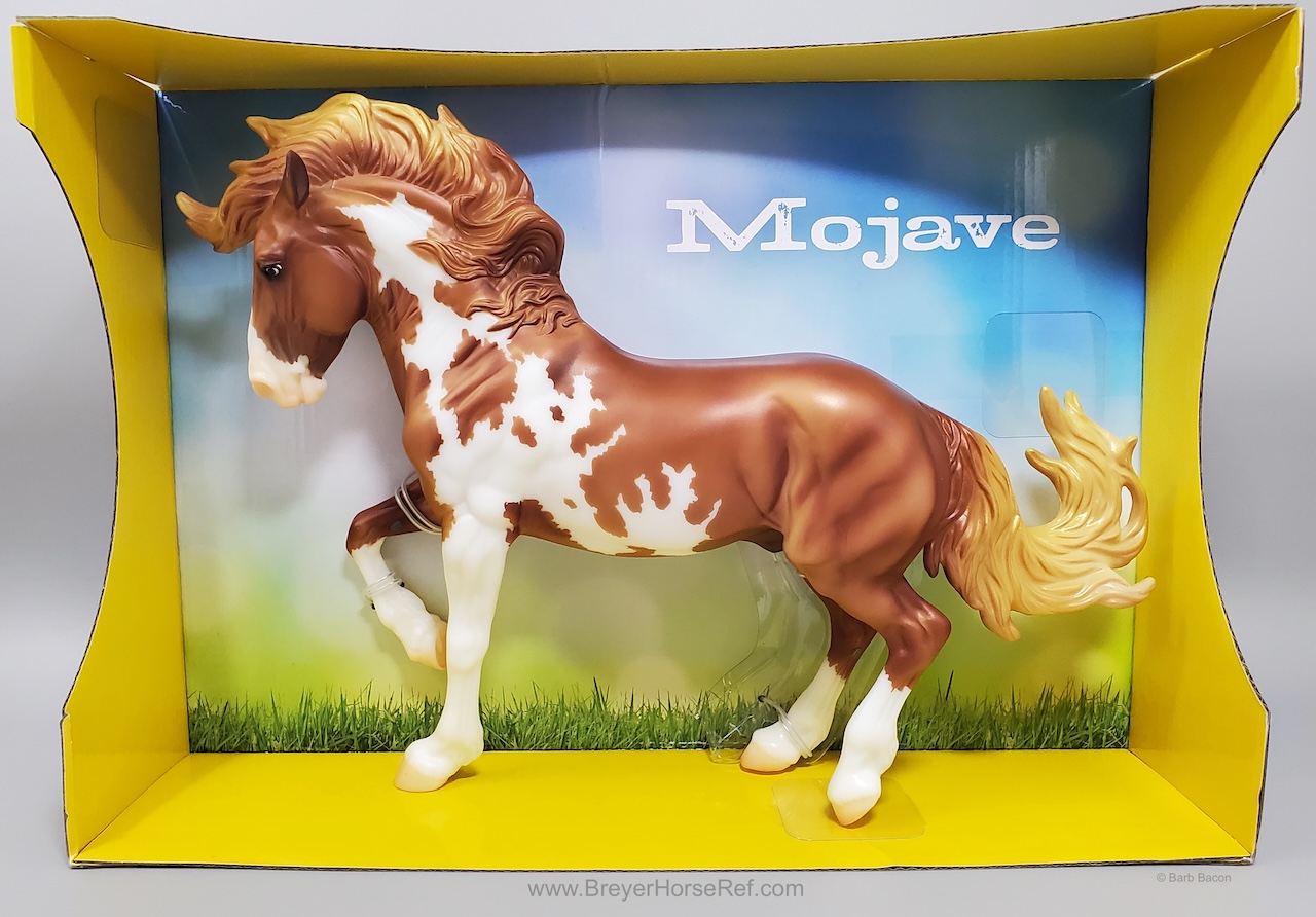Mojave is a proud Mustang, poised as if he’s defending his band from a threat or scaring off a challenging stallion. His wild mane and tail beautifully accent his rich overo pinto coat as he paws the ground and pins his ears. Like some pintos, he displays unique eyes: one blue and one brown!" www.breyerhorses.com.