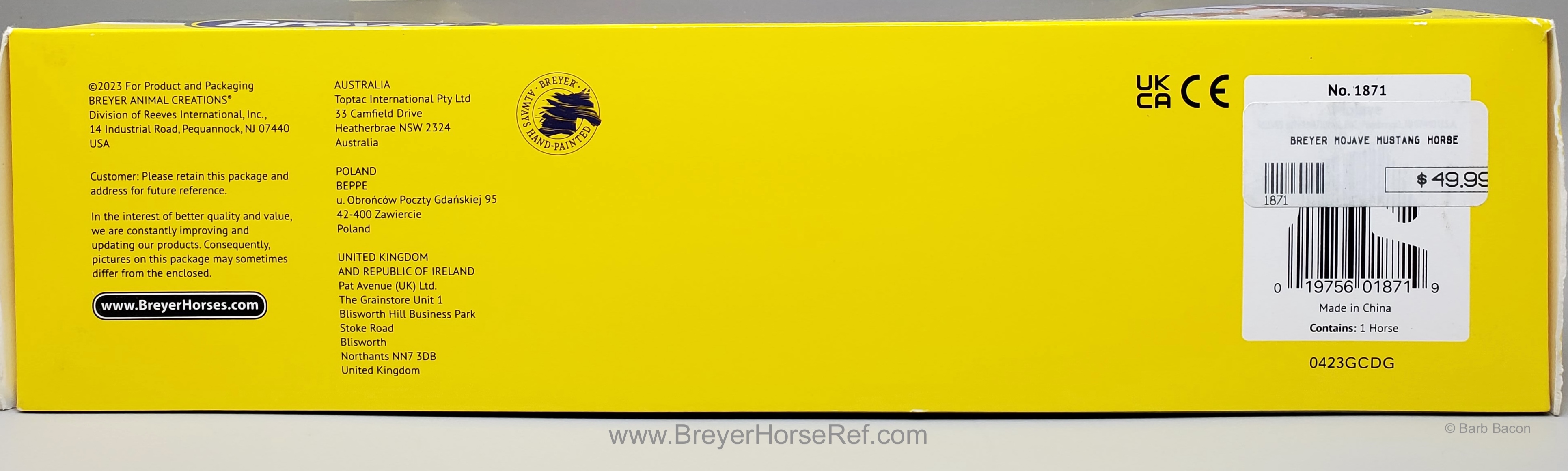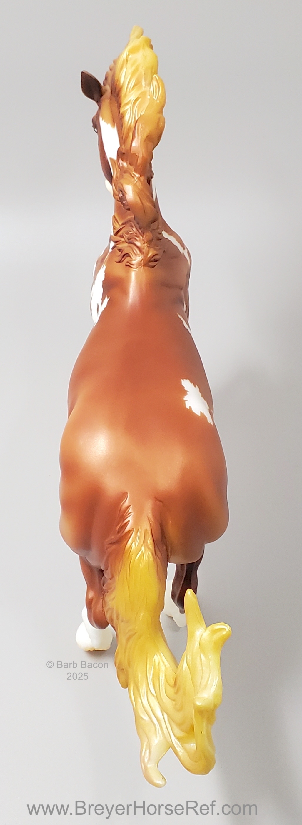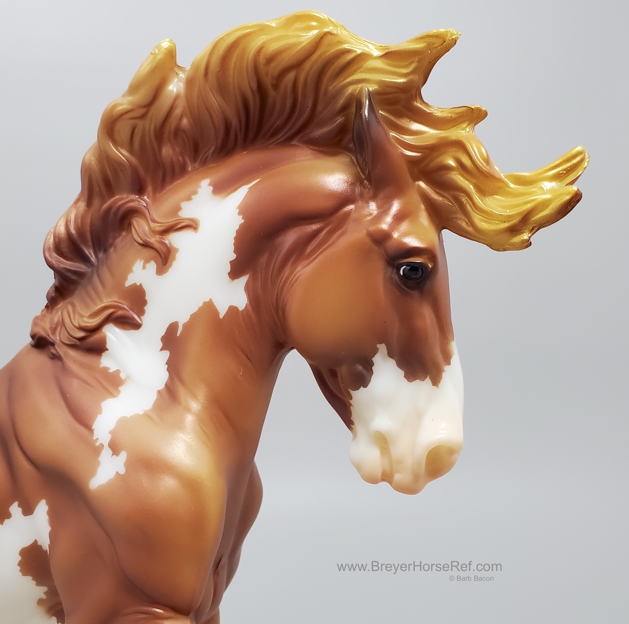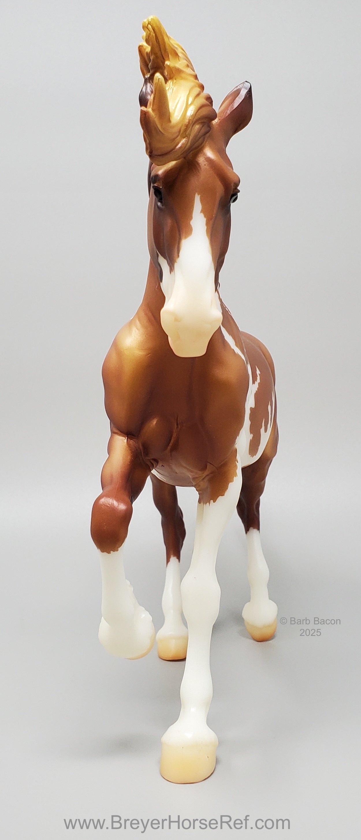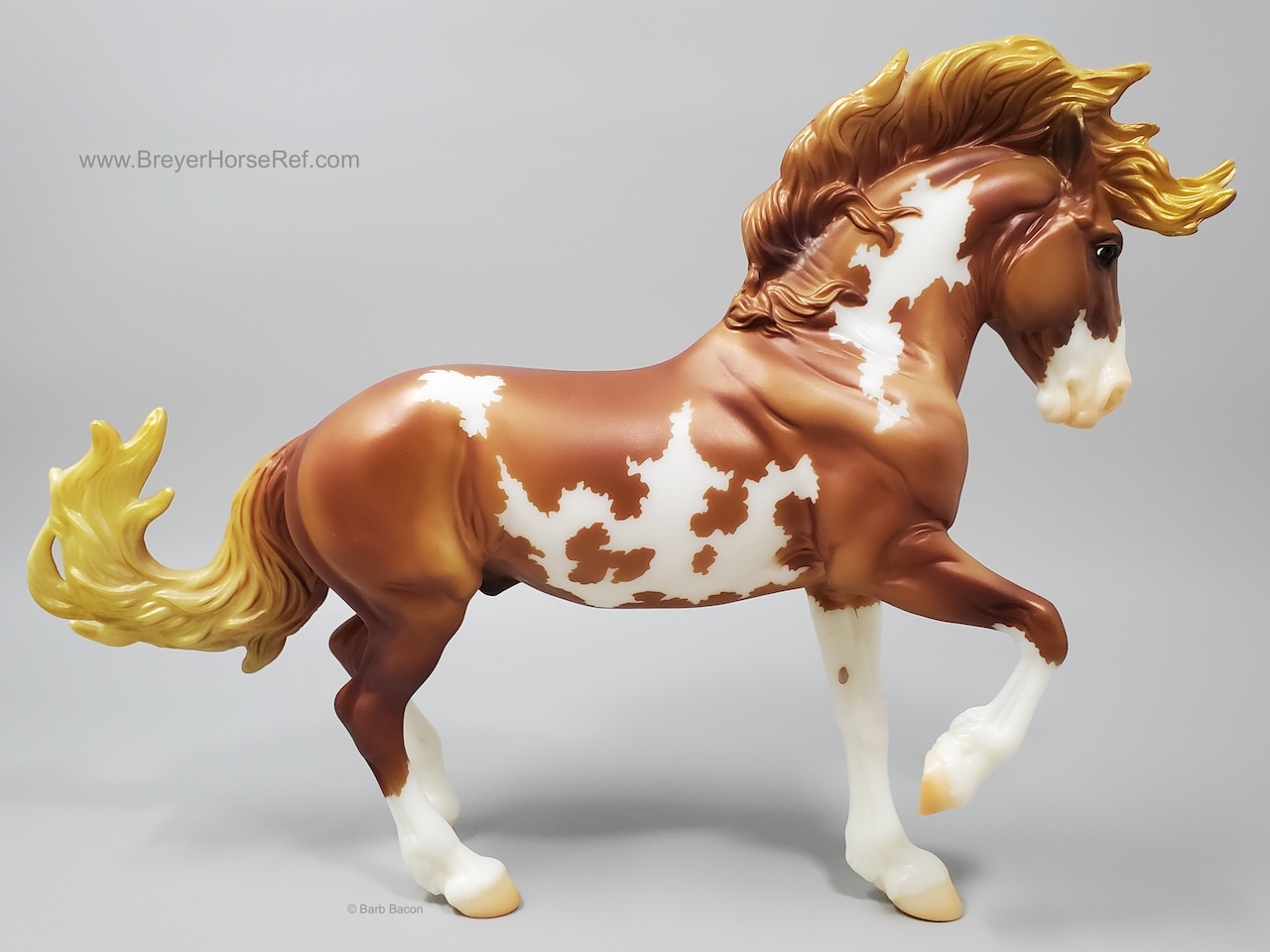 Mojave is a proud Mustang, poised as if he’s defending his band from a threat or scaring off a challenging stallion. His wild mane and tail beautifully accent his rich overo pinto coat as he paws the ground and pins his ears. Like some pintos, he displays unique eyes: one blue and one brown!" www.breyerhorses.com.