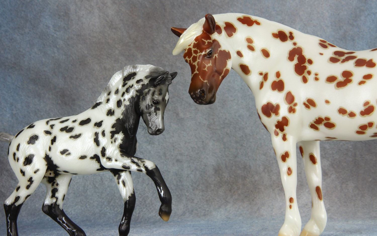 BreyerFest 2023 Auction. Welsh Mare and Foal painted a Pearly Chestnut Leopard Appaloosa and a Pearly Black Leopard Appaloosa.