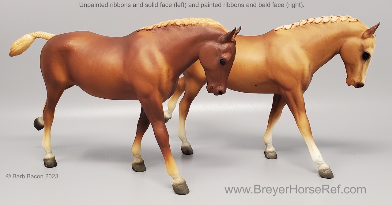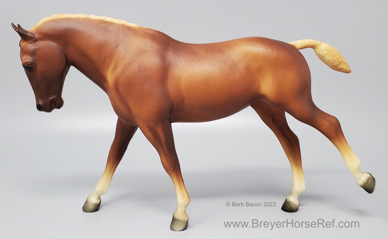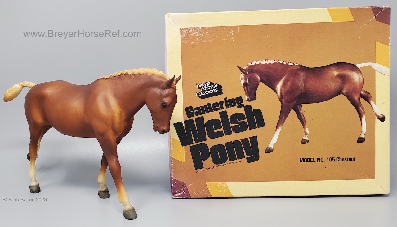 Chestnut with solid face and unpainted ribbons. From 1971-1976, the #105 chestnut Cantering Welsh Pony had red ribbons and a bald face (separate record). That model was discontinued in 1976, and brought back in 1979 by popular demand, but did not have the painted ribbons, the face was now solid, and the color had a deeper red chestnut color. Not advertised in the 1977 and 1978 catalogs.