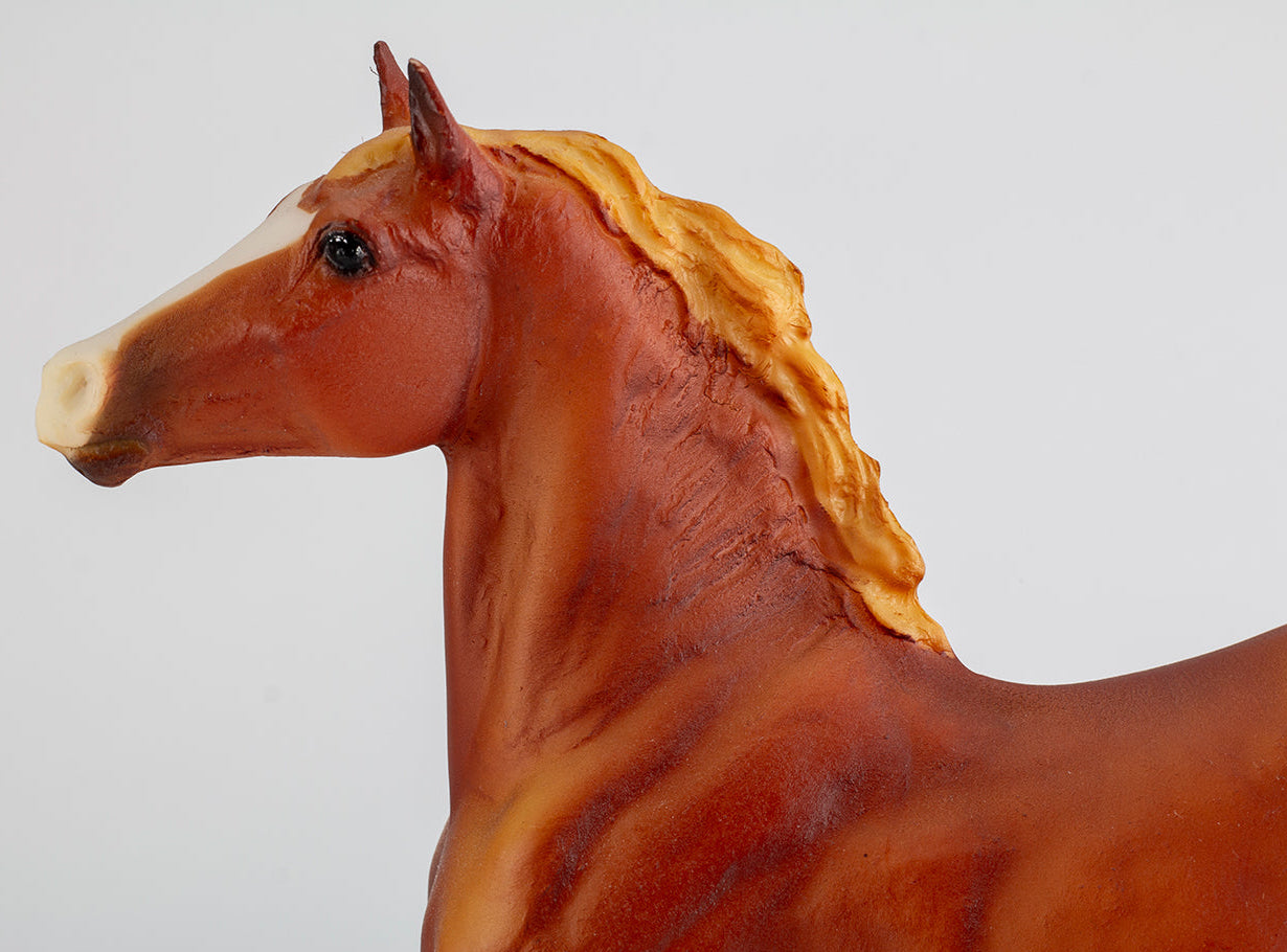 "Sculpted in the likeness of the classic literary character, Black Beauty (mold #3040BB) was first introduced in 1980 as part of the Classics (1:12 scale) “Black Beauty, His Family and Friends” set. Since his original release in – of course – black, he’s worn many different coat colors, but one that never made it to production is this lovely flaxen chestnut with four socks and a wide blaze. Based on his painting style, this piece likely dates to the late 1990s or early 2000s. This model was priced at $650 and comes with a certificate of authenticity." www.breyerhorses.com. Available in November 2023.