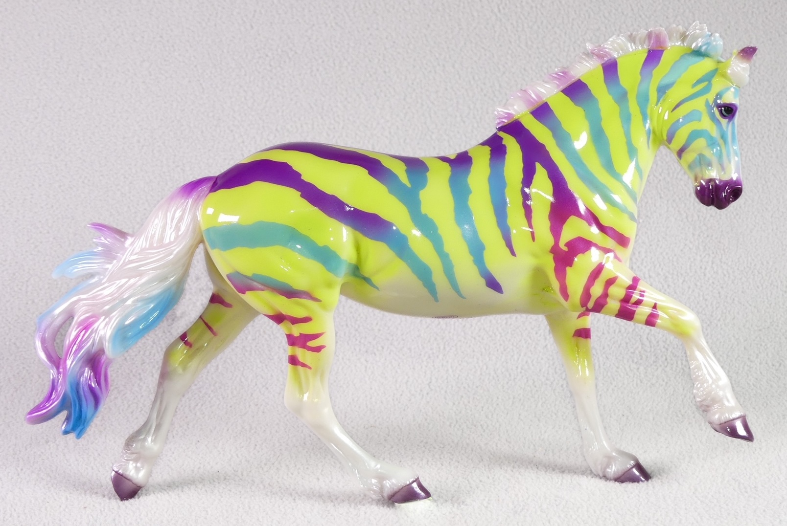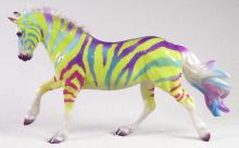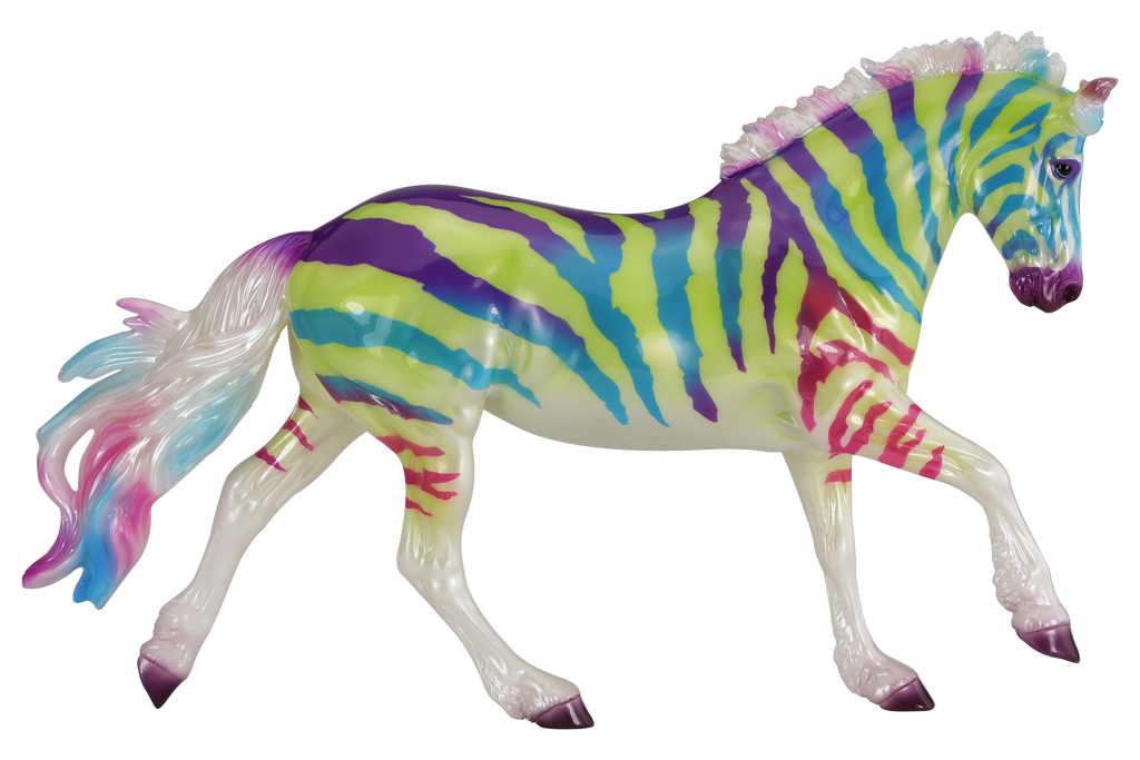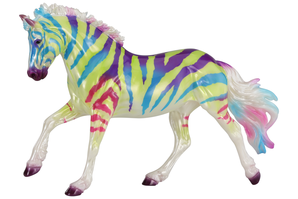 "This fun and wildly wonderful decorator is ready to take you back to the 90s. Whatever your aesthetic – Fruit Stripe Gum, Lisa Frank, Saved by the Bell – this model is it! Done on our delightful Sport Pony, this deliciously glossy neon rainbow zebra is ready to join your herd!" www.breyerhorses.com.