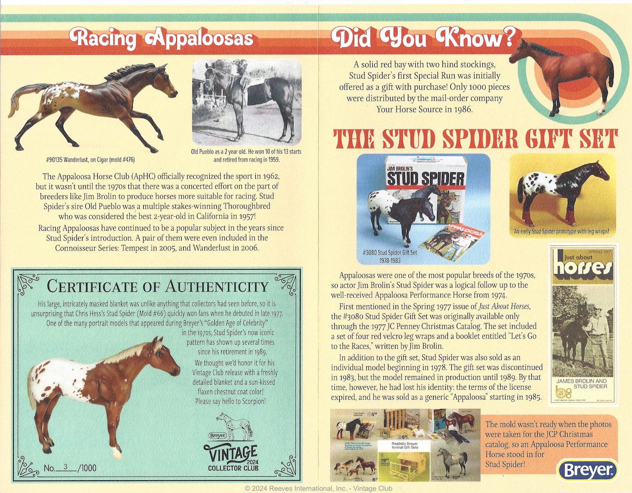 "The First Release of the 2024 Vintage Club. Appaloosas were one of the most popular breeds of the 1970s, so actor Jim Brolin’s racing stallion Stud Spider was a logical follow up to the well-received Appaloosa Performance Horse from 1974.