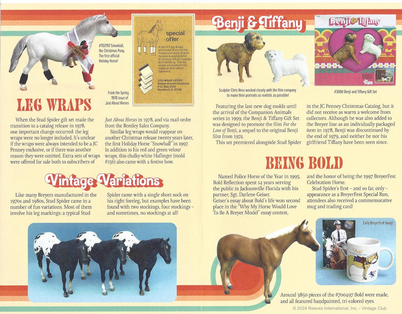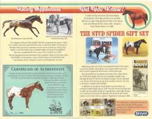 First mentioned in the Spring 1977 issue of Just About Horses, the #3080 Stud Spider Gift Set was originally available only through the 1977 JC Penney Christmas Catalog. The set included a set of four red Velcro leg wraps and a booklet entitled “Let’s Go to the Races,” written by Jim Brolin. His large, intricately masked blanket was unlike anything that collectors had seen before, so it is unsurprising that Chris Hess’ Stud Spider (Mold #66) quickly won over the fans.