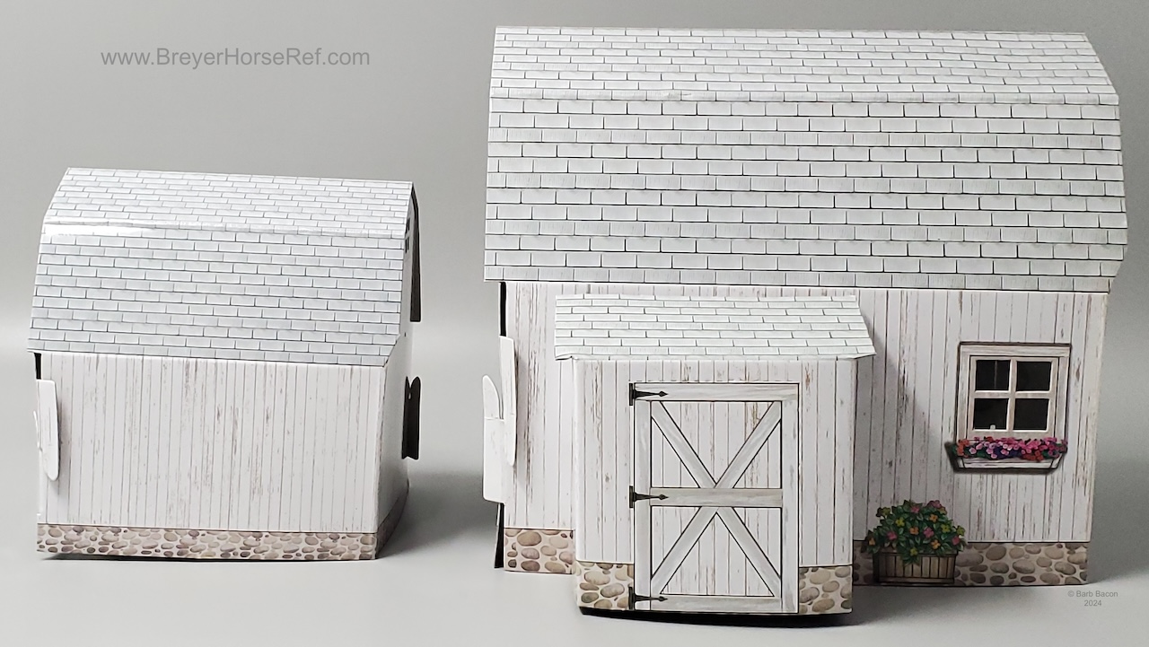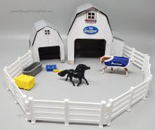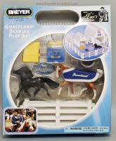 Set included a black Shetland Pony, palomino Appaloosa mold, paper stable, blanket, hay bale, water trough, fencing, grooming box and brush. On the 2012 Retired List.