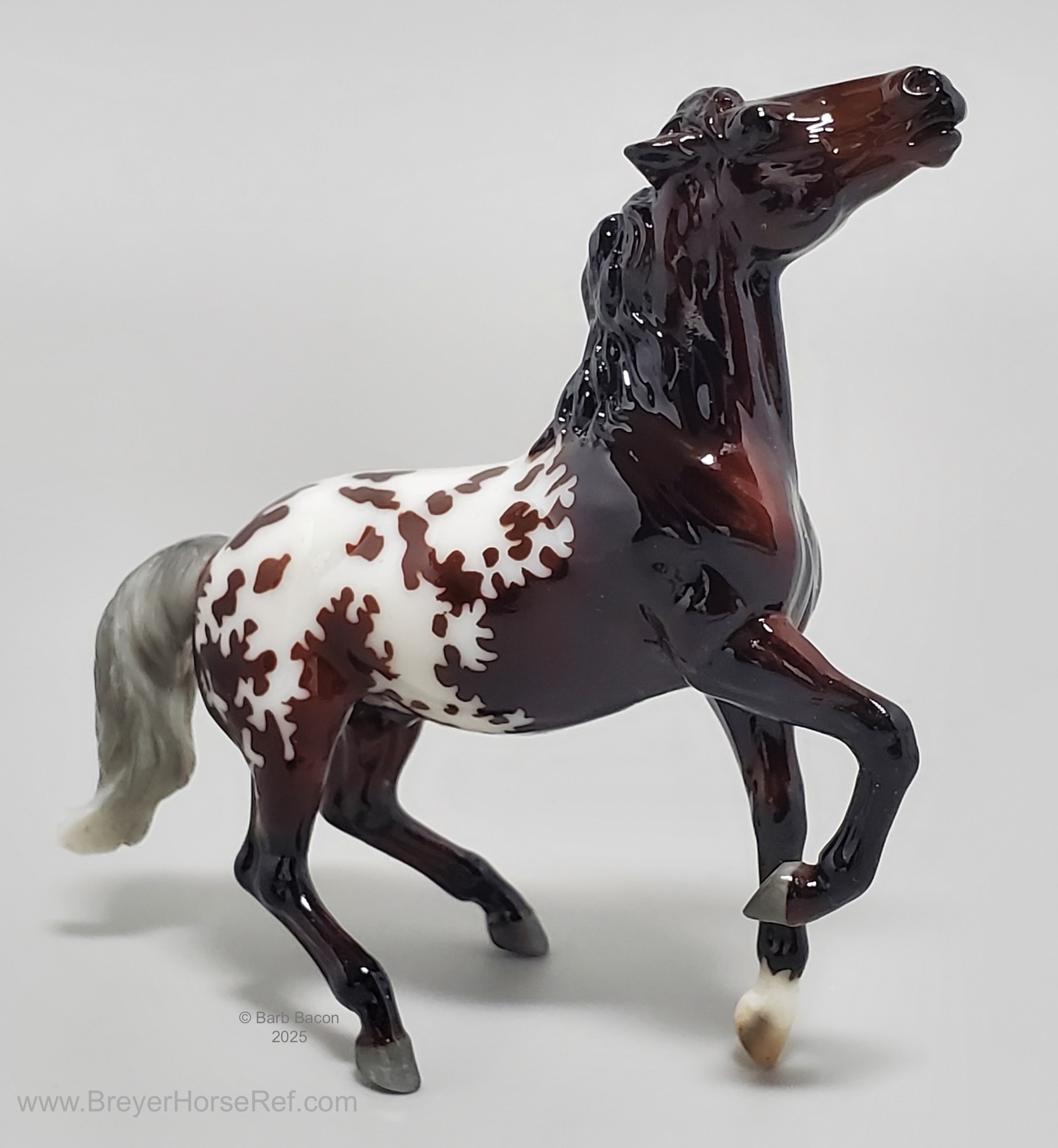 Deluxe Collector Club 2025 - First Release of the Semi-Rearing Mustang Stablemate. Members receive one glossy bay appaloosa Darius along with one vintage color decorator model: Wedgewood (solid blue), Copenhagen (dapple blue), Gold Charm (solid gold), or Florentine (dapple gold).