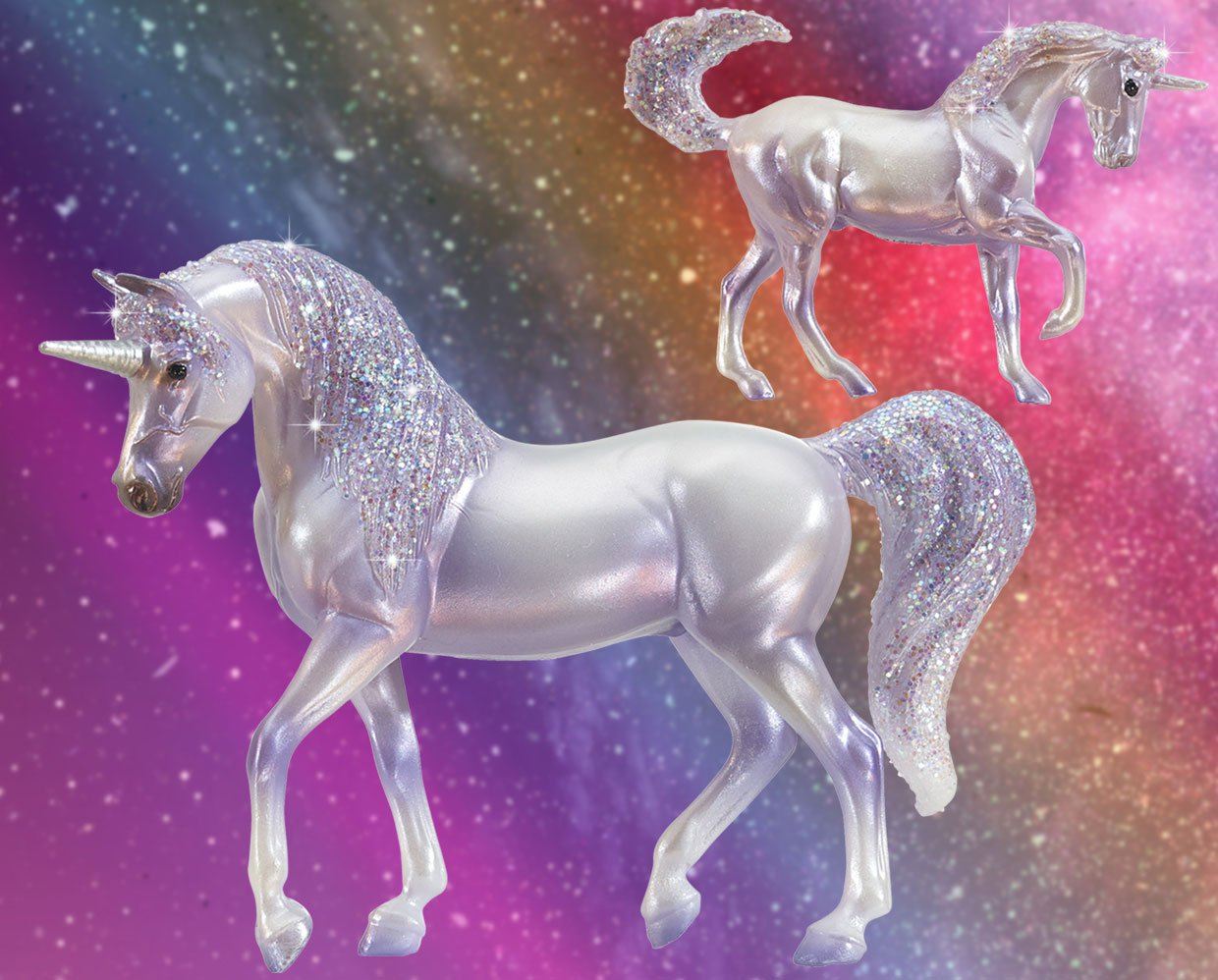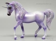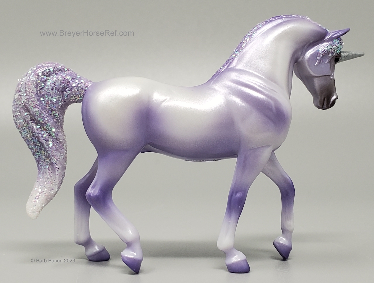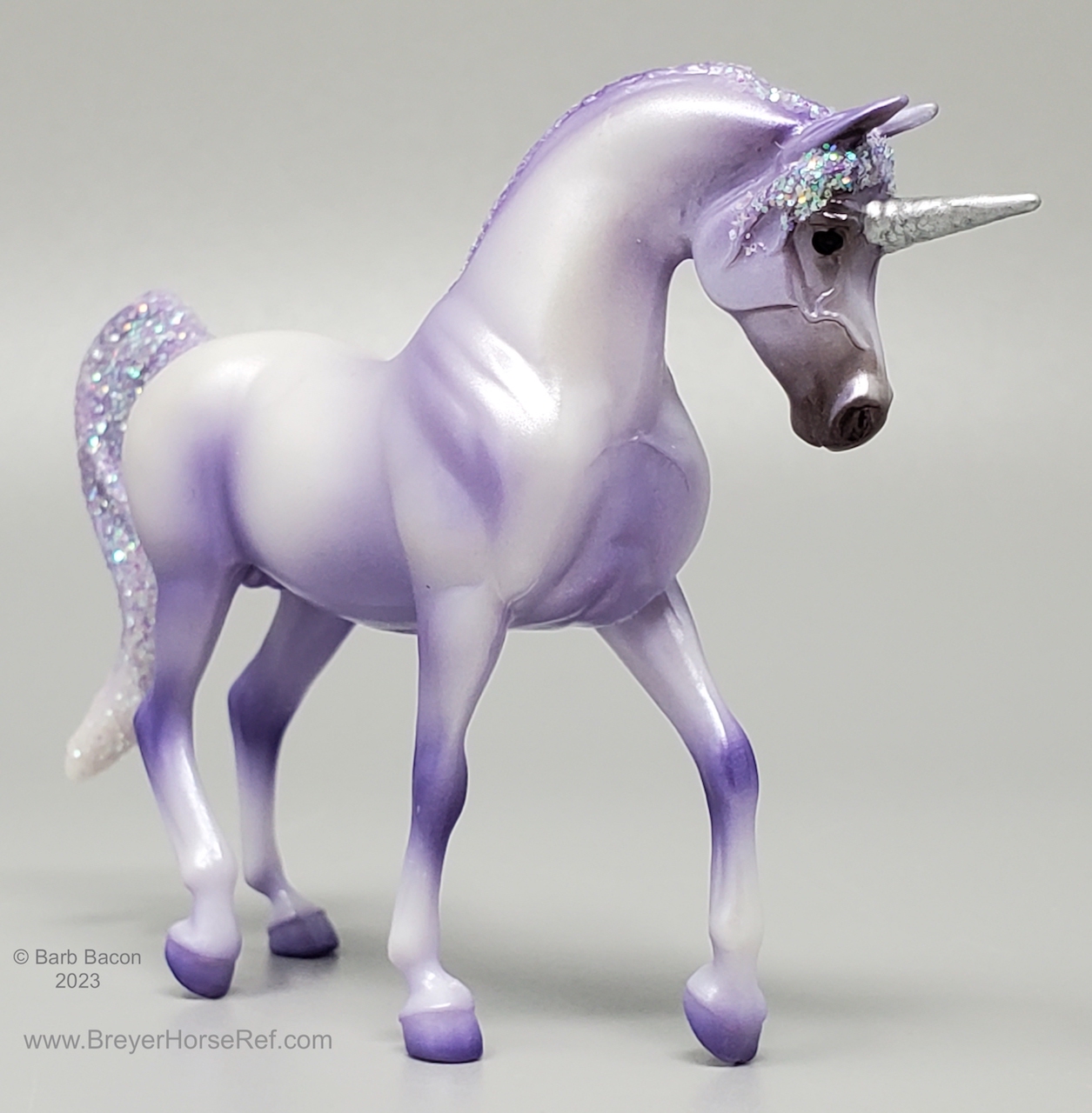 "The Fairytale Friends continue to spread their magic with an out-of-this-world stallion named Moonbeam! Moonbeam is a unicorn that certainly lives up to his name. With his glittering mane and tail and pearly lavender coat, he shimmers like the moonlight as he frolics beside his Mini Whinnies unicorn Morgan pal. What their next adventure will be is up to you! Fairytale Friends is a limited edition collection of magnificent Breyer unicorns: collect all six Fairytale Friends sets! This beautifully hand-painted Stablemates model arrives in a satin bag, and comes with a Mini Whinnies unicorn model whose coat color matches the Stablemate model." www.breyerhorses.com.
