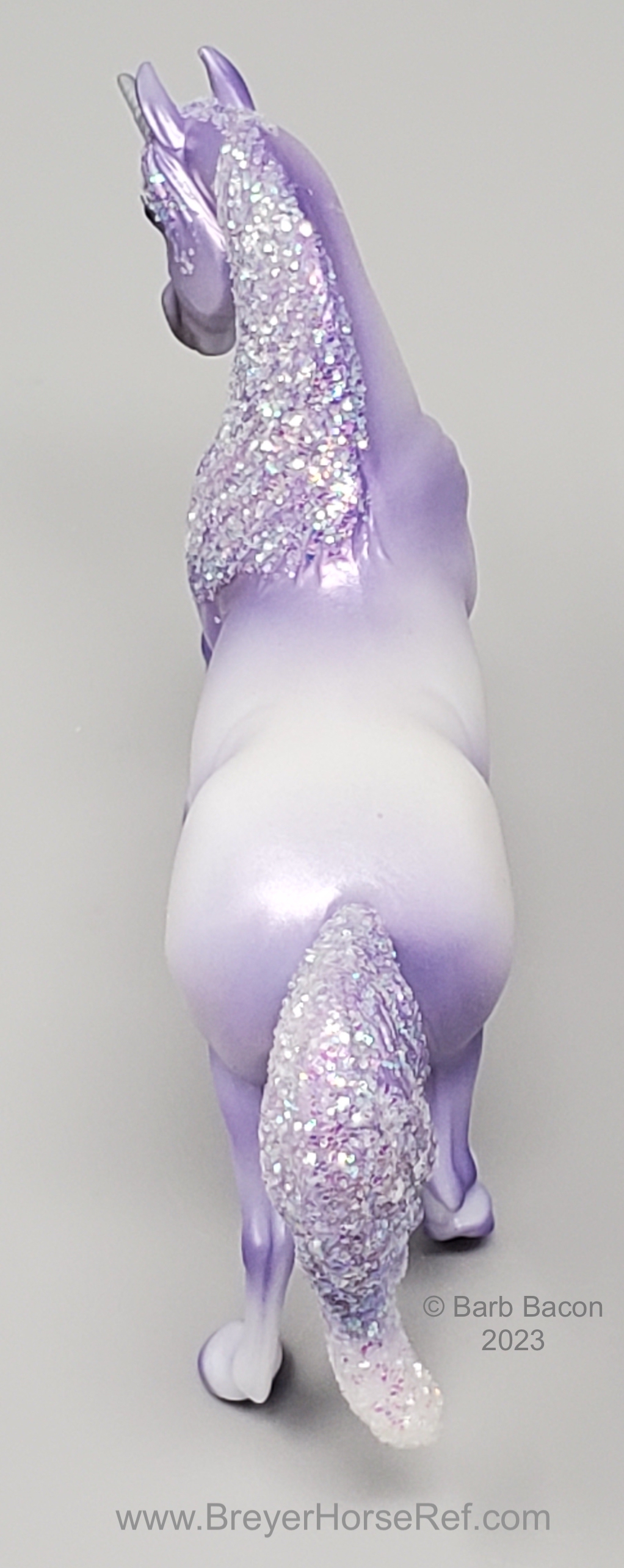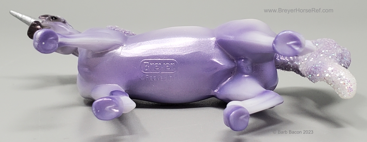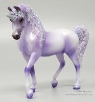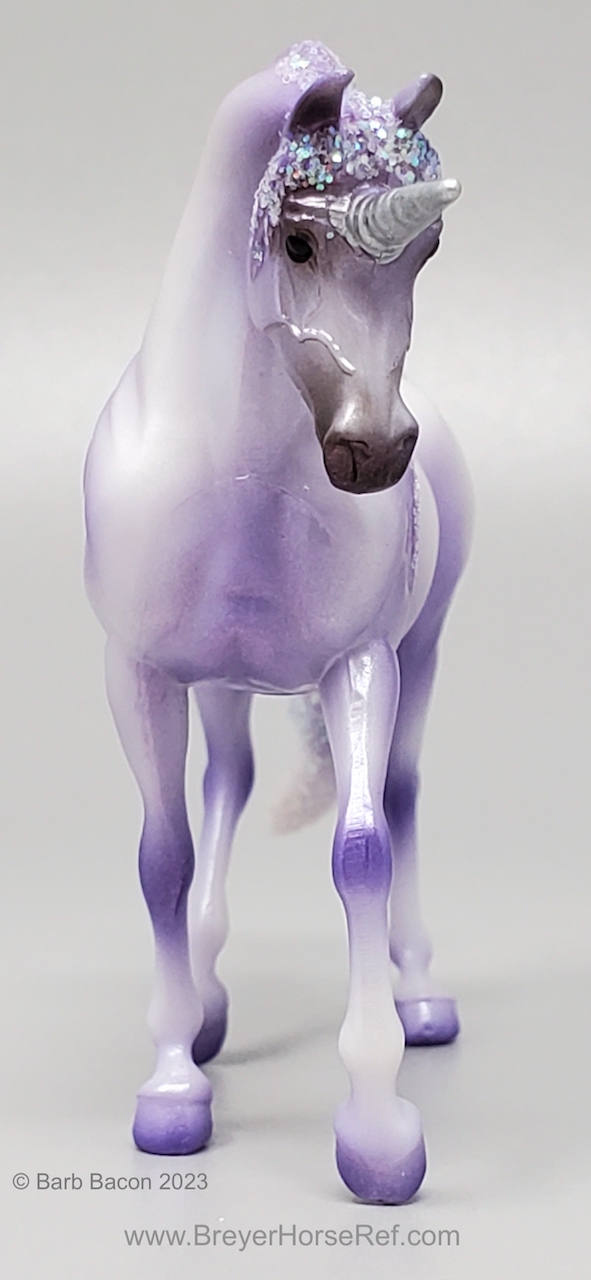 "The Fairytale Friends continue to spread their magic with an out-of-this-world stallion named Moonbeam! Moonbeam is a unicorn that certainly lives up to his name. With his glittering mane and tail and pearly lavender coat, he shimmers like the moonlight as he frolics beside his Mini Whinnies unicorn Morgan pal. What their next adventure will be is up to you! Fairytale Friends is a limited edition collection of magnificent Breyer unicorns: collect all six Fairytale Friends sets! This beautifully hand-painted Stablemates model arrives in a satin bag, and comes with a Mini Whinnies unicorn model whose coat color matches the Stablemate model." www.breyerhorses.com.
