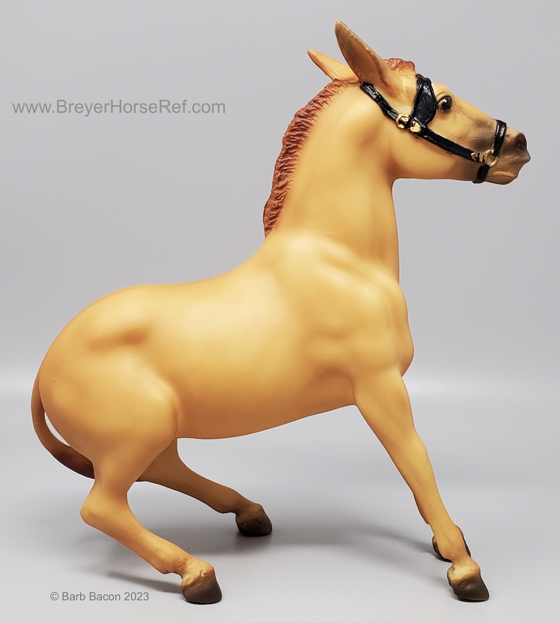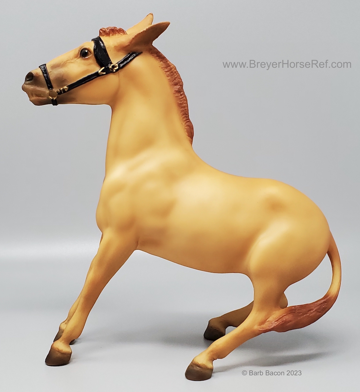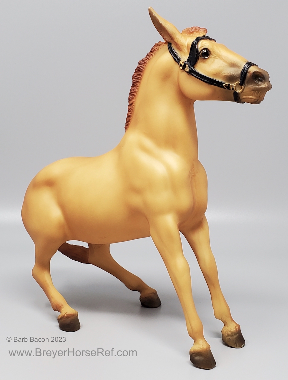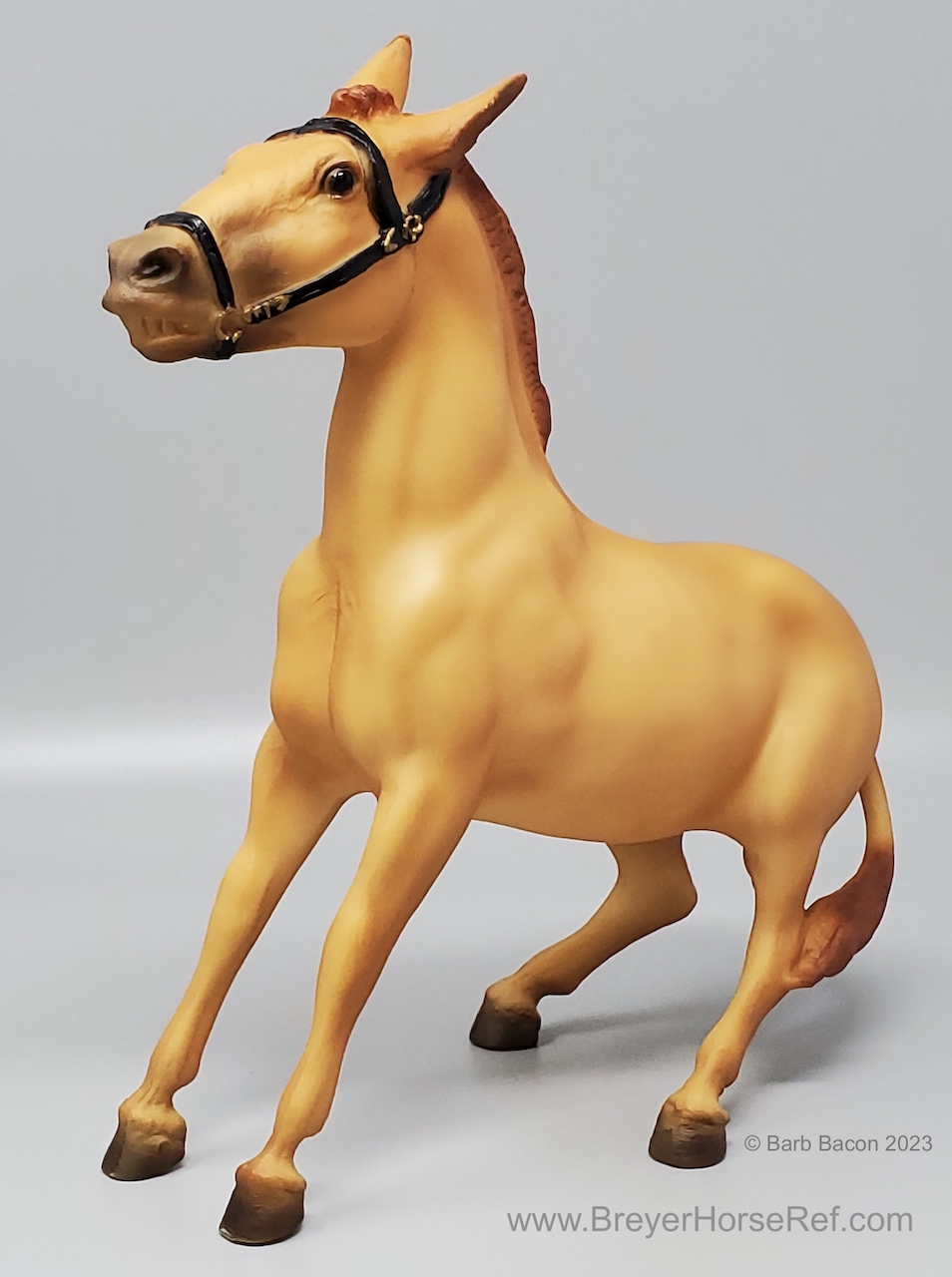 Apricot dun color with darker mane and tail tuft, grey hooves, solid face with grey nose, and a black halter. This model was sold separately or in the Balking Mule Assortment Special Run #410894. 400 models were available through Black Horse Ranch and included the Chestnut, Alabaster, Apricot Dun, Black Blanket Appaloosa, Black Leopard Appaloosa and Buckskin Balking Mules.