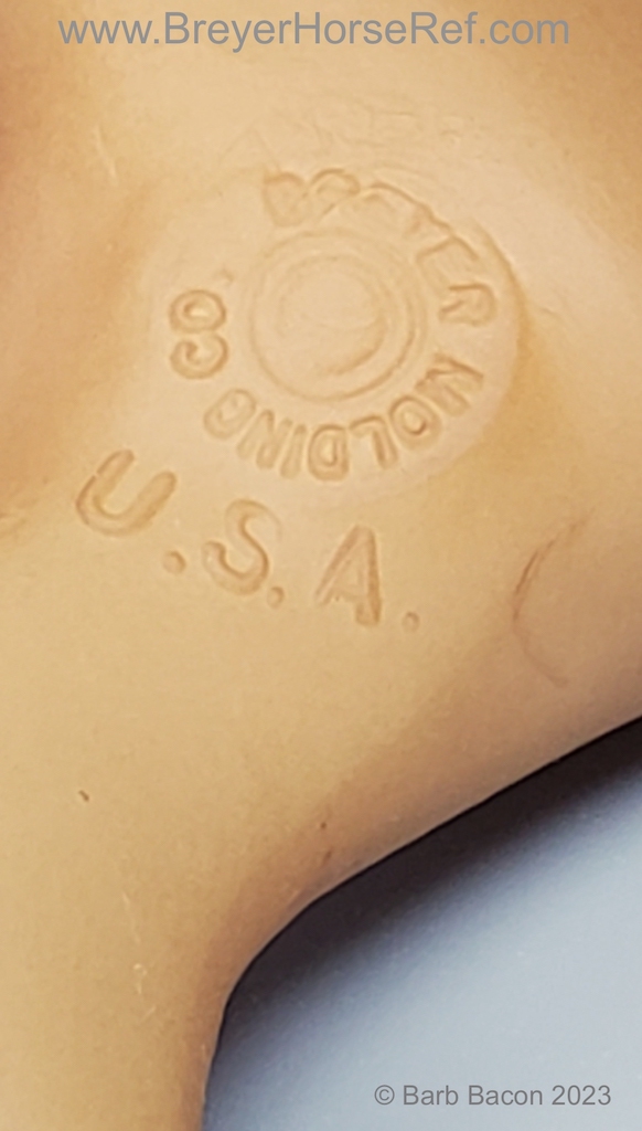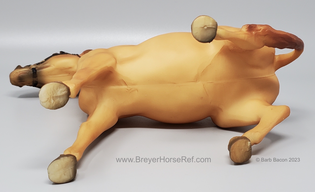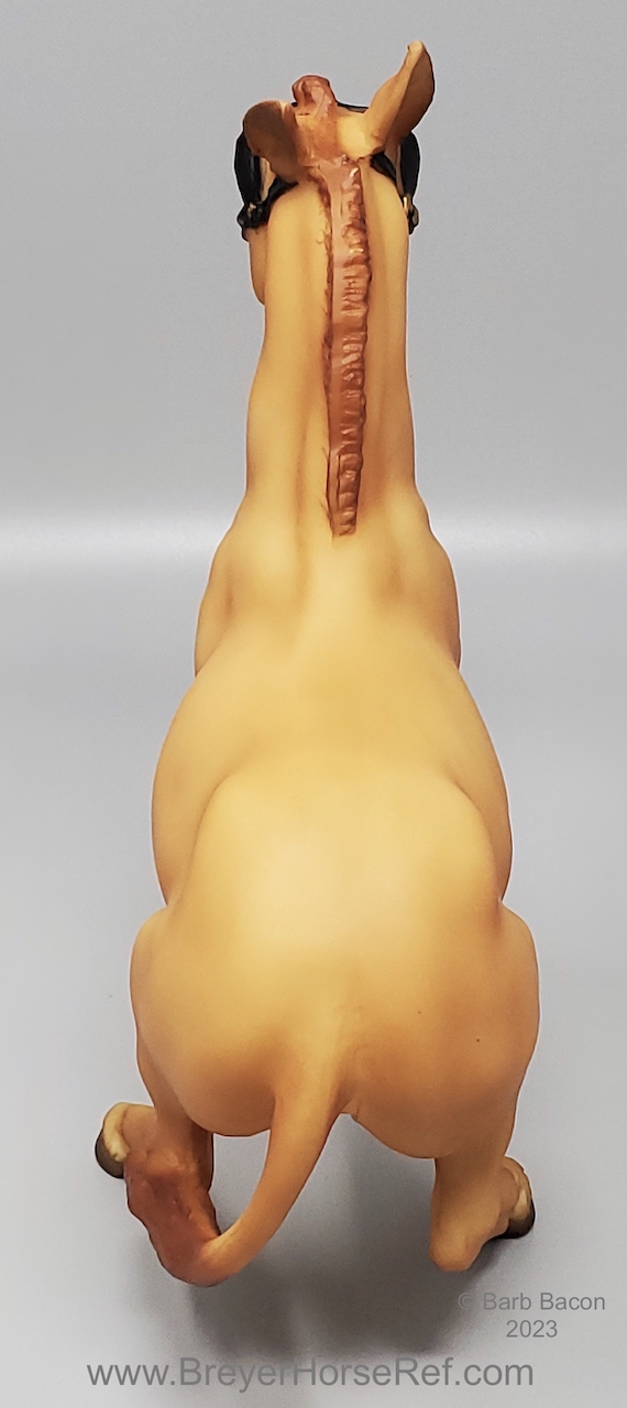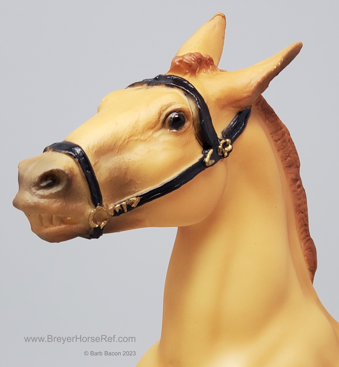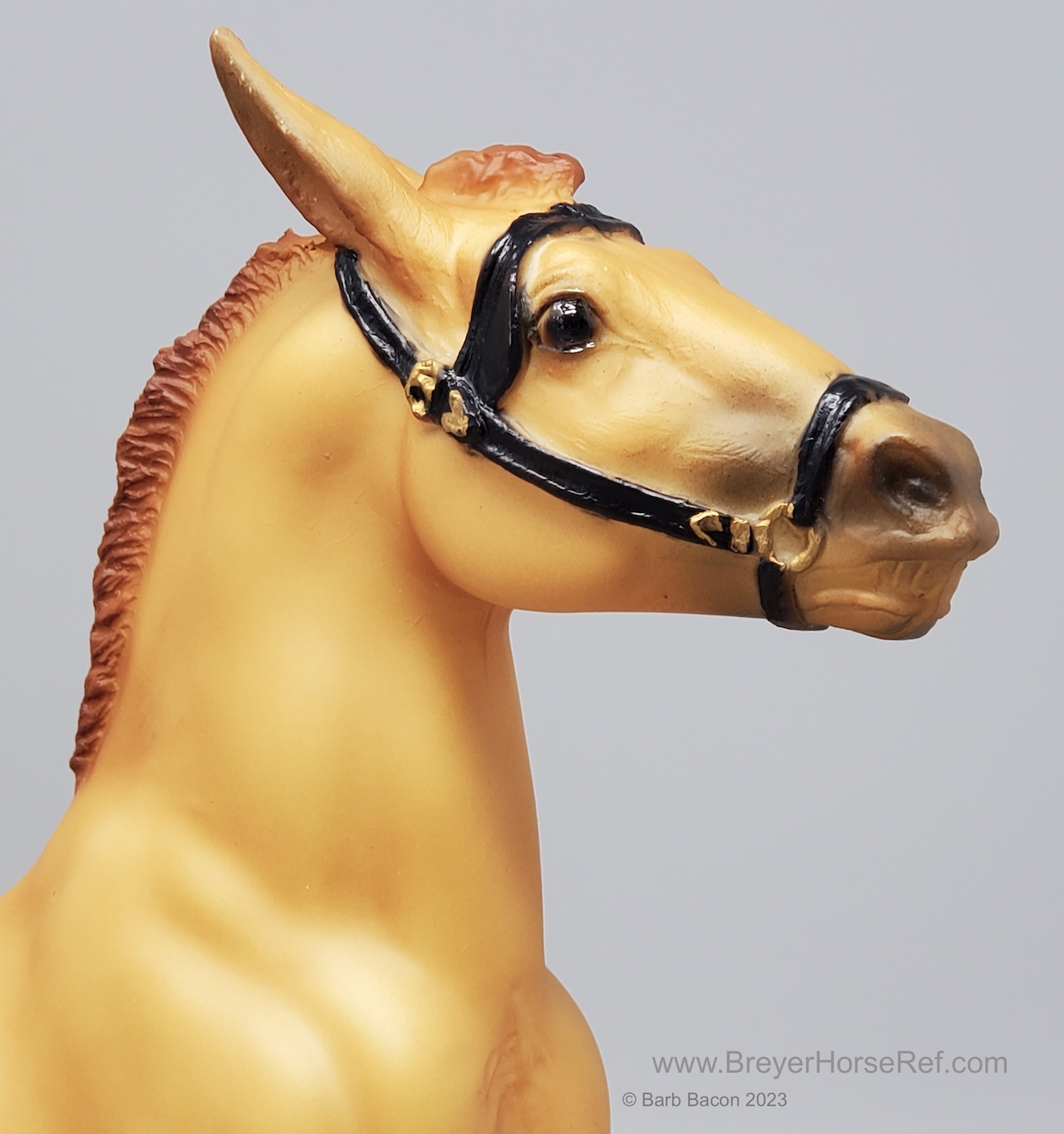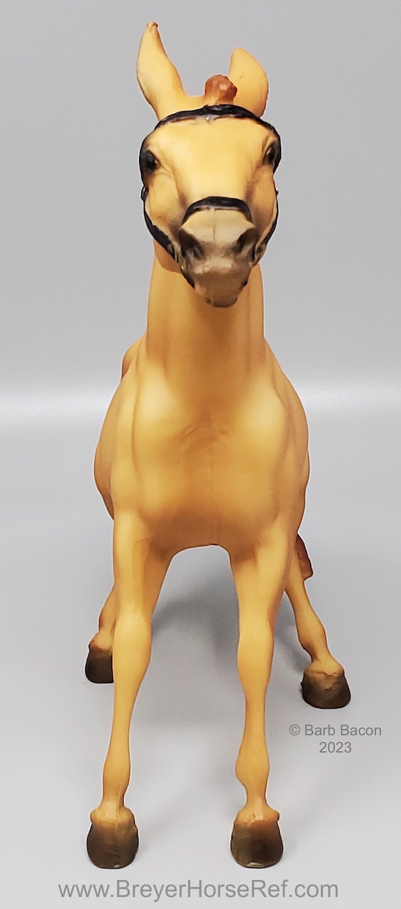 Apricot dun color with darker mane and tail tuft, grey hooves, solid face with grey nose, and a black halter. This model was sold separately or in the Balking Mule Assortment Special Run #410894. 400 models were available through Black Horse Ranch and included the Chestnut, Alabaster, Apricot Dun, Black Blanket Appaloosa, Black Leopard Appaloosa and Buckskin Balking Mules.