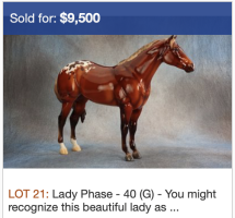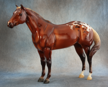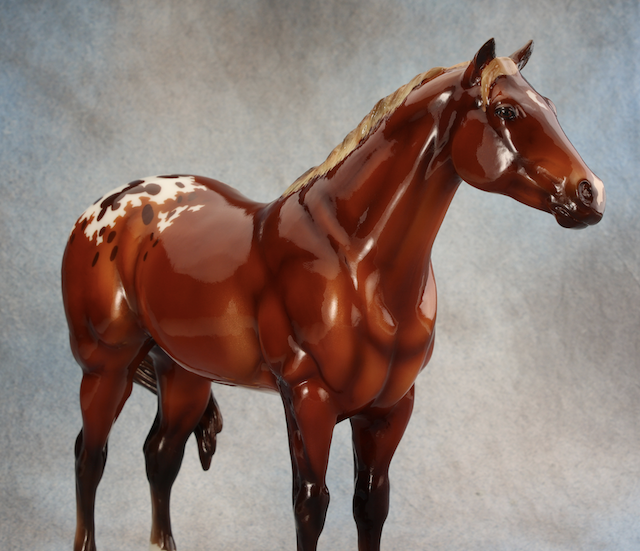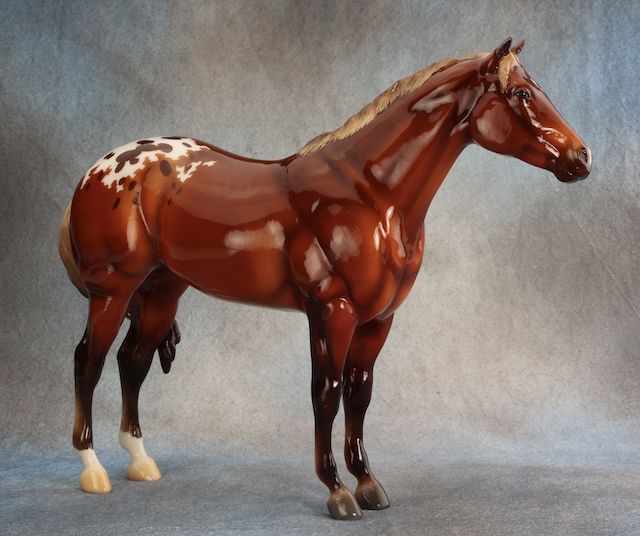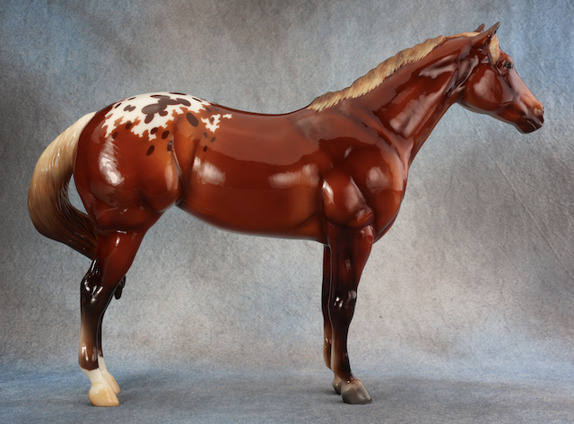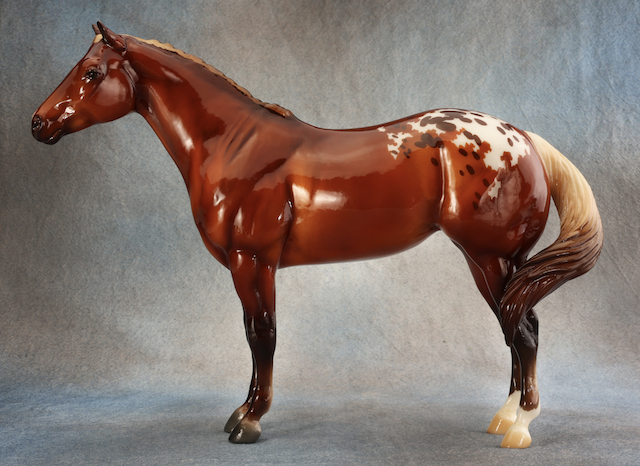 BreyerFest 2025 Auction Model. Described as a silver bay blanket appaloosa, designed by Lesli Kathman. Lady Phase with the Swished Tail. There were 25 matte models as the Saturday Raffle (see separate record for photos).