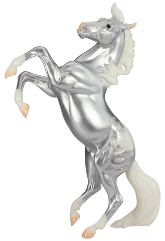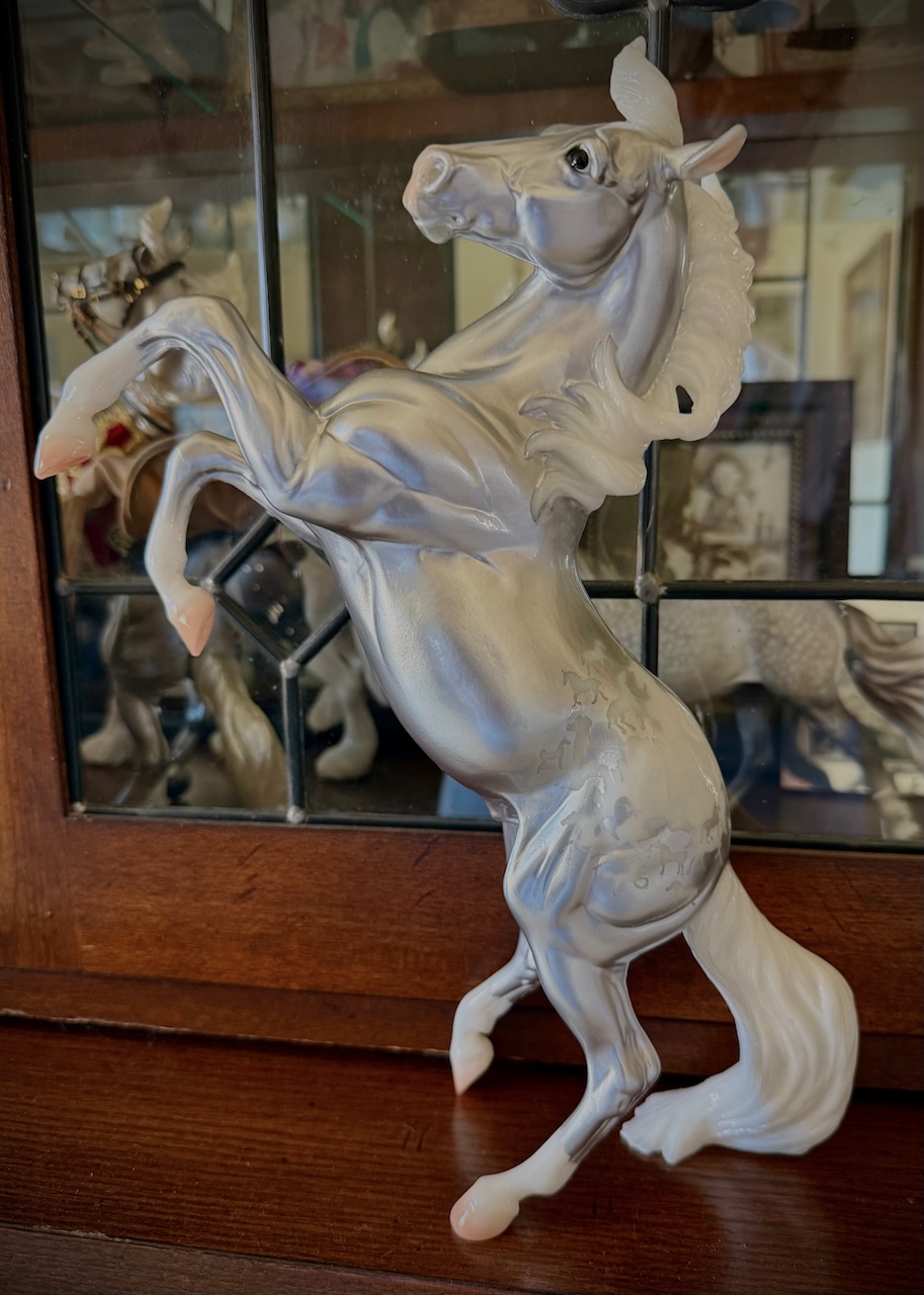 Silver Charm with a pattern that consists of many tiny Breyer model silhouettes designed by Chris Jonczak. 2200 pieces consist of the blue, silver and gold decorators. There were 1063 Matte Wedgewood, 1062 Gold Charm, and 75 Silver Charm.