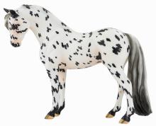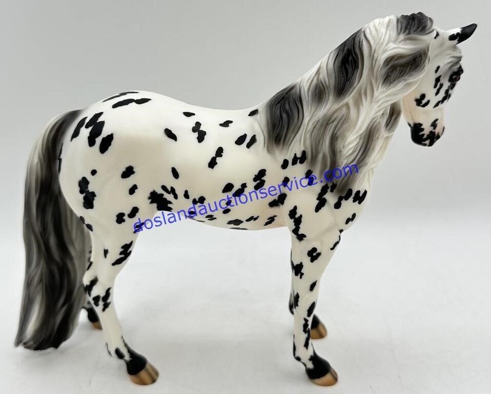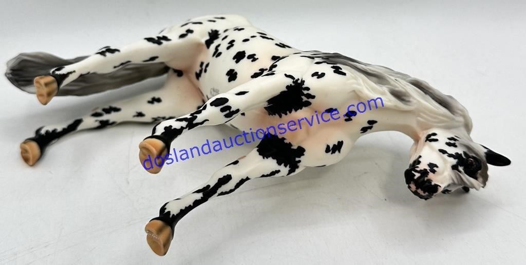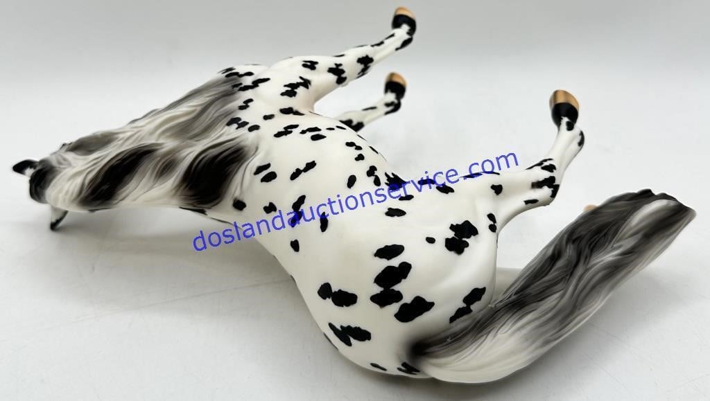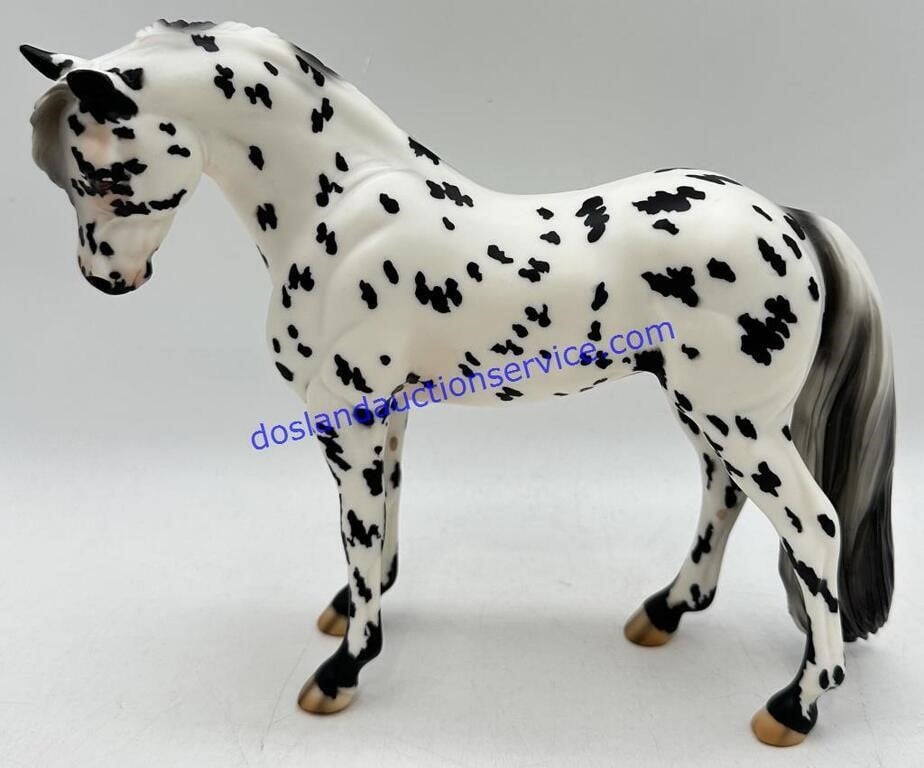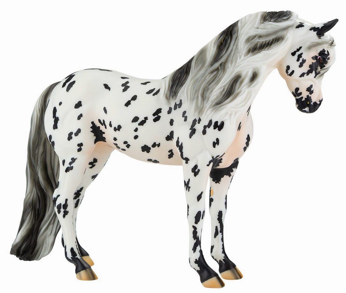 "Native to Europe, Bilberries – or European blueberries – grow singly or in pairs on low bushes. These antioxidant-rich berries are deep blue in color, often appearing nearly black, and enjoyed fresh or dried. This charming Appaloosa pony features a colorful leopard coat designed by Sommer Prosser, complete with dark spots that mimic the appearance of dried bilberries." www.breyerhorses.com. Bilberry 2019 Stamp on belly. This run was modified as a Mare.