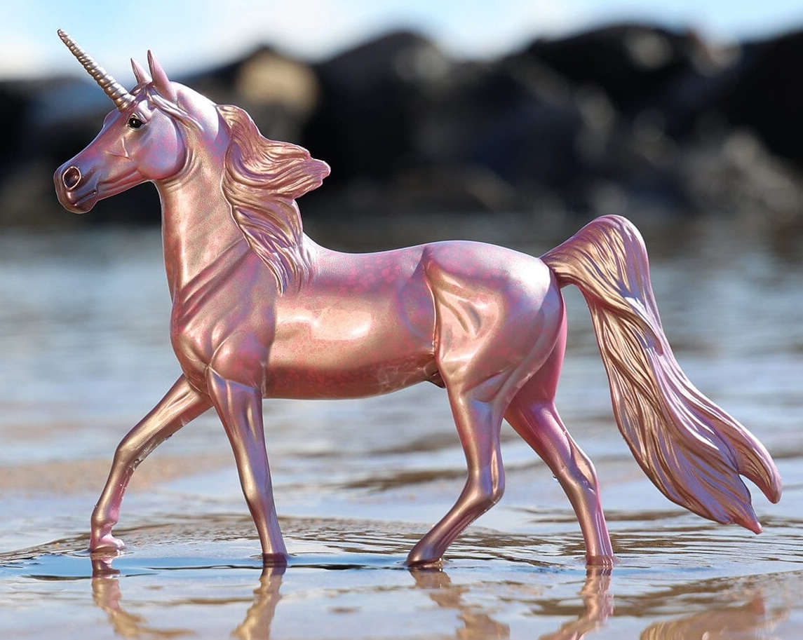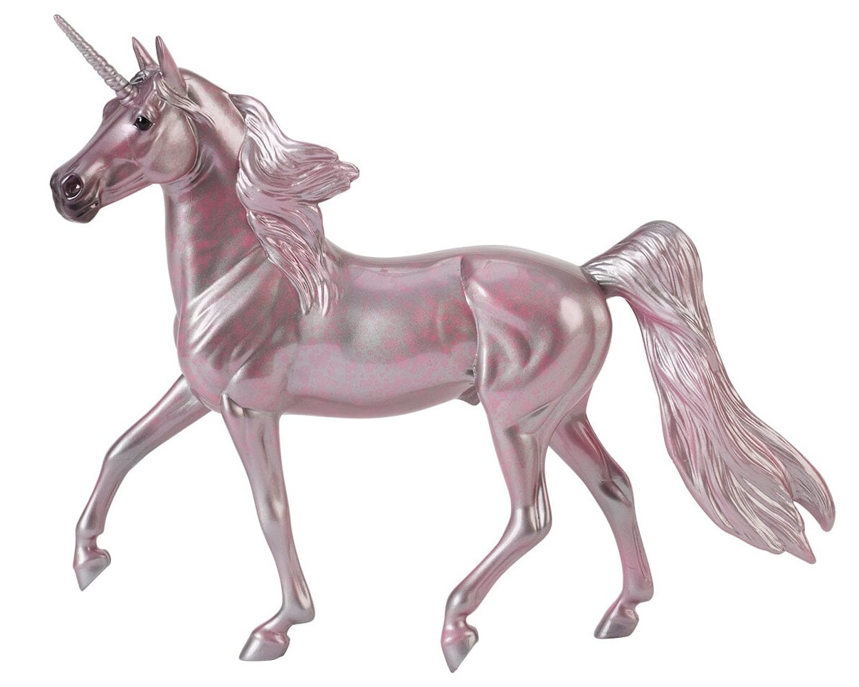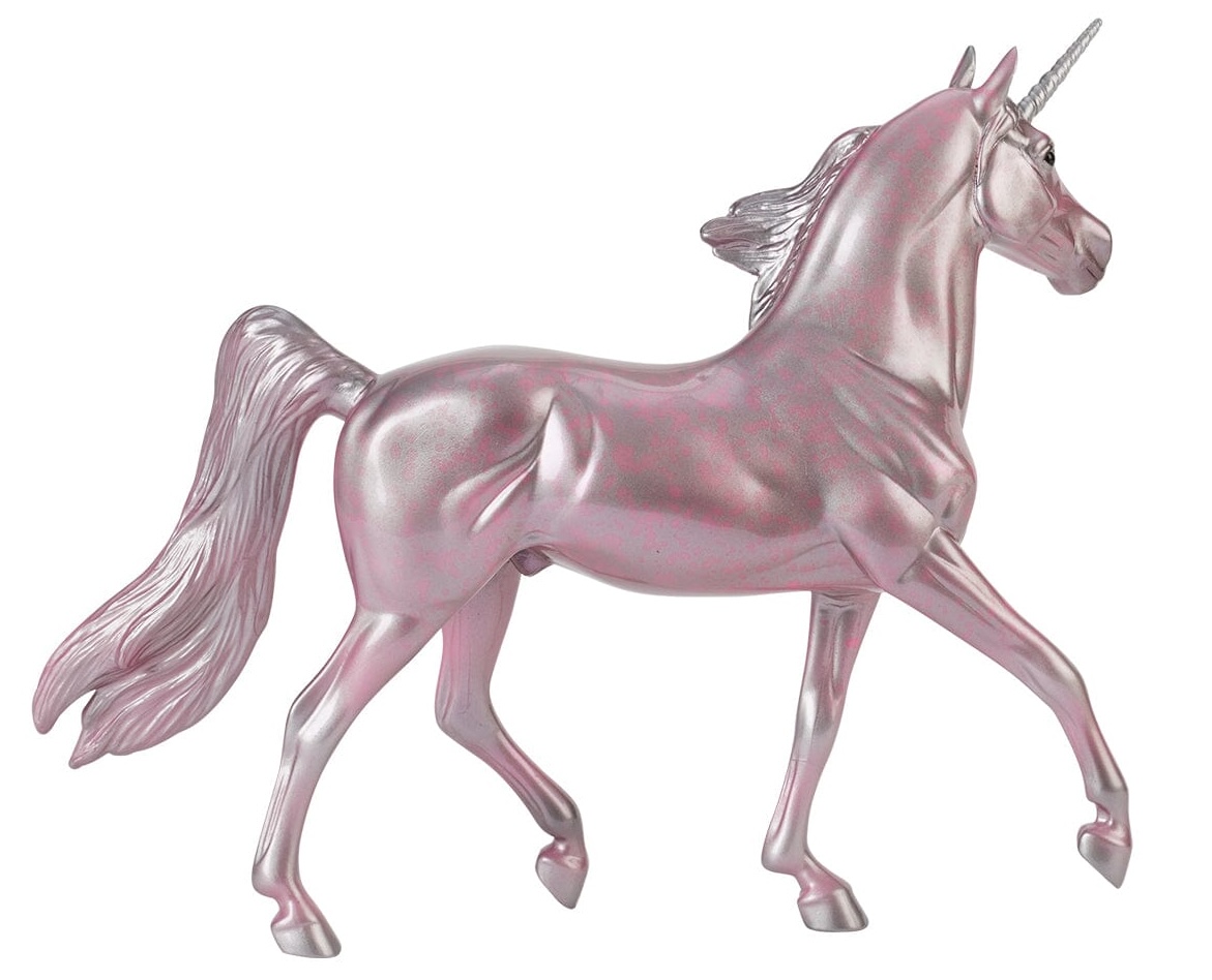 Named after the Greek Titan god of watchfulness and heavenly light, Hyperion’s coat is a brilliant reflection of his power. No matter which way you view him, his metallic pink and silver coat catches the light. Finished with a high-gloss finish and pink dapples, Hyperion is ready to be the shining star of your magical herd! Ships in a mail order box." www.BreyerHorses.com.