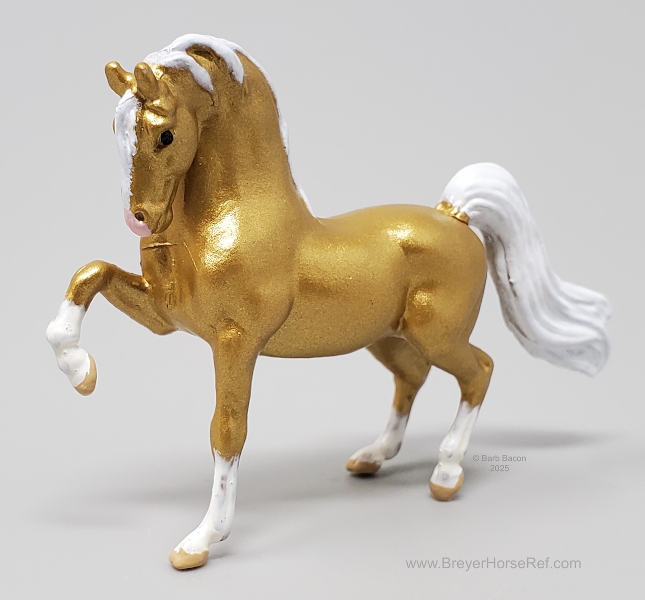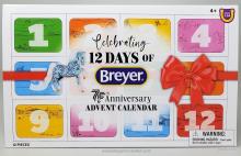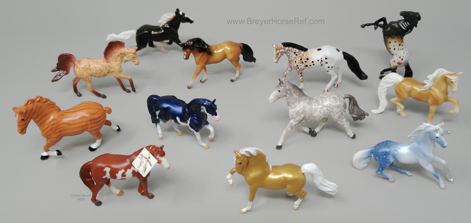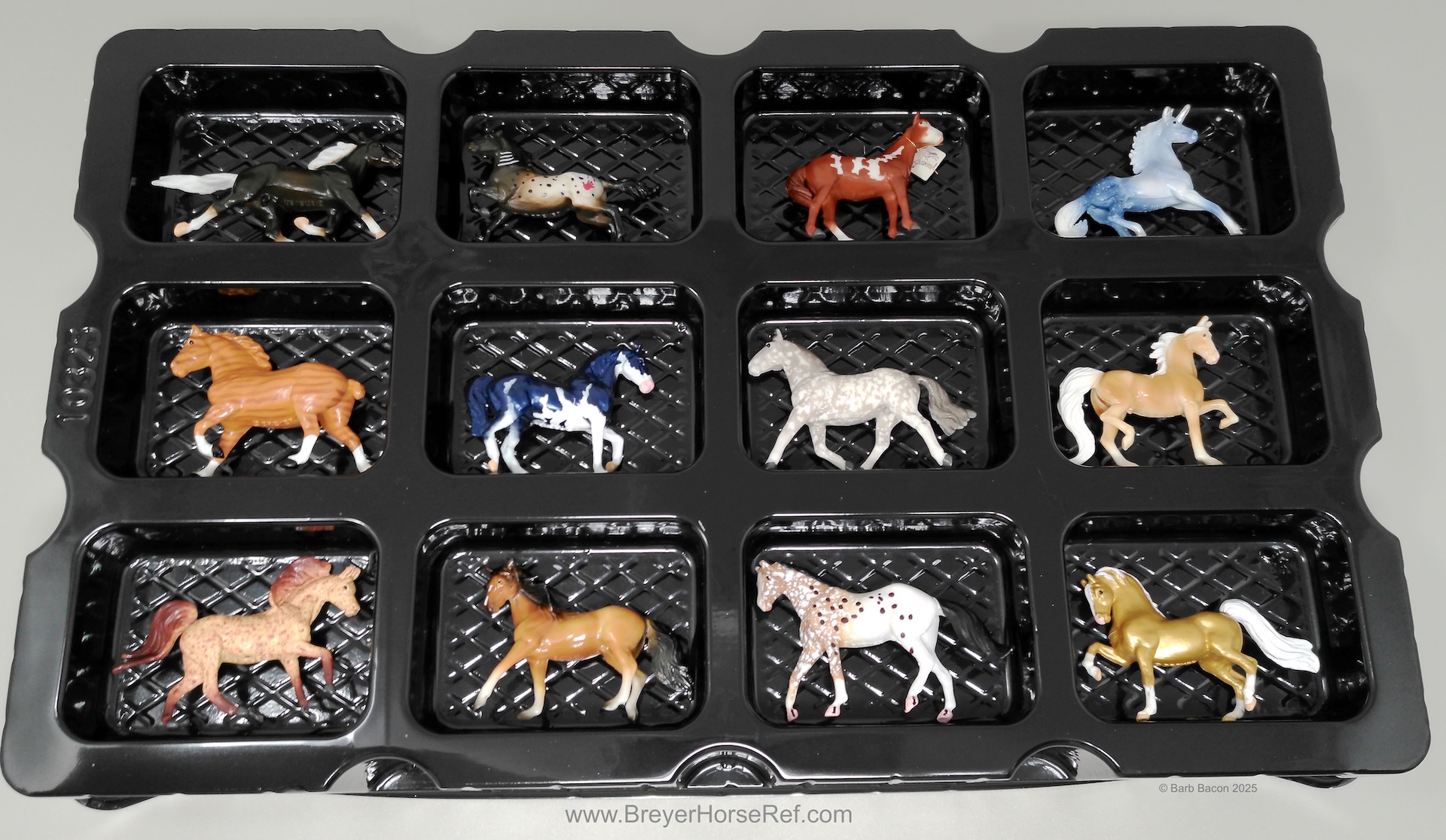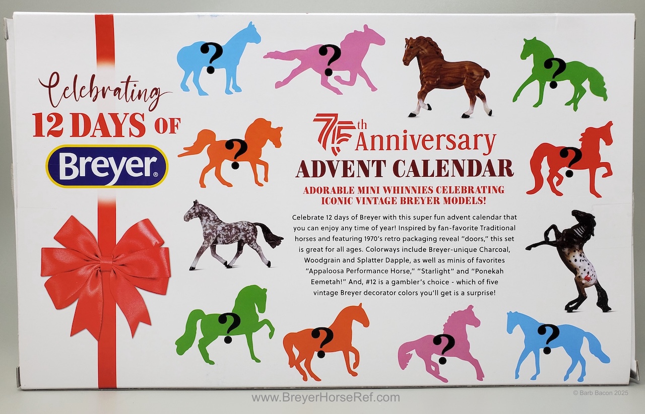There were five chase pieces to this set - Gold Charm, Florentine, Copenhagen, Wedgewood and Silver Filigree. "This unique advent calendar features miniatures of historic Breyer models with vintage-style coat patterns over chalky basecoats. There are 12 doors, one to open for each of the 12 days leading up to Christmas. Behind each door you'll find a special Mini Whinnies-scale horse. This unique Advent calendar includes 12 horses, one of which will be a gambler’s choice Sherman Morgan. Which of the five popular decorator colors he’ll be is a surprise! Other colorways feature iconic woodgrain with a Tenite sticker, splatter dapple, Appaloosa Performance Horse, Ponekah Eemetah with Native American markings, palomino with a blue ribbon sticker marking, a mini Starlight unicorn and many more! This is a very special anniversary collectible edition!" www.breyerhorses.com. Pictured in the 2025 Holiday Catalog.