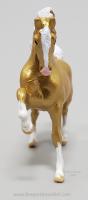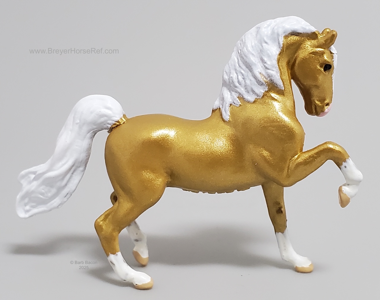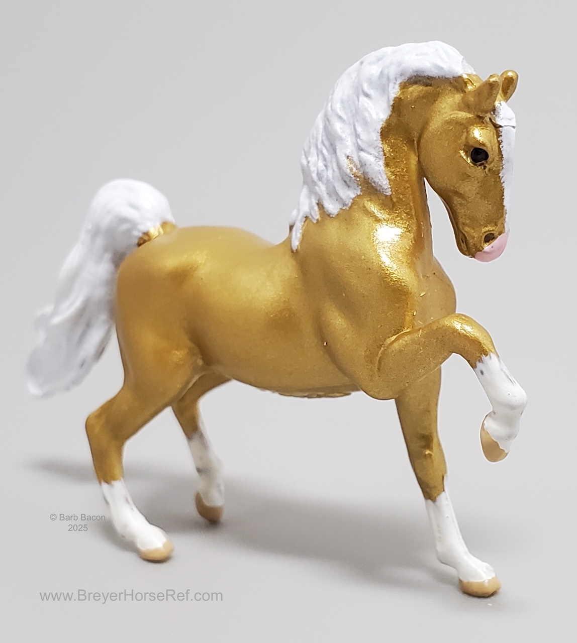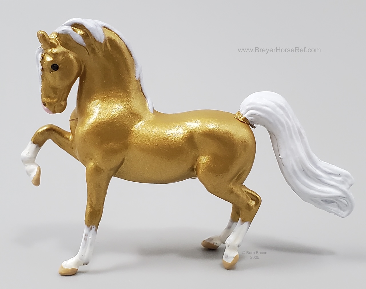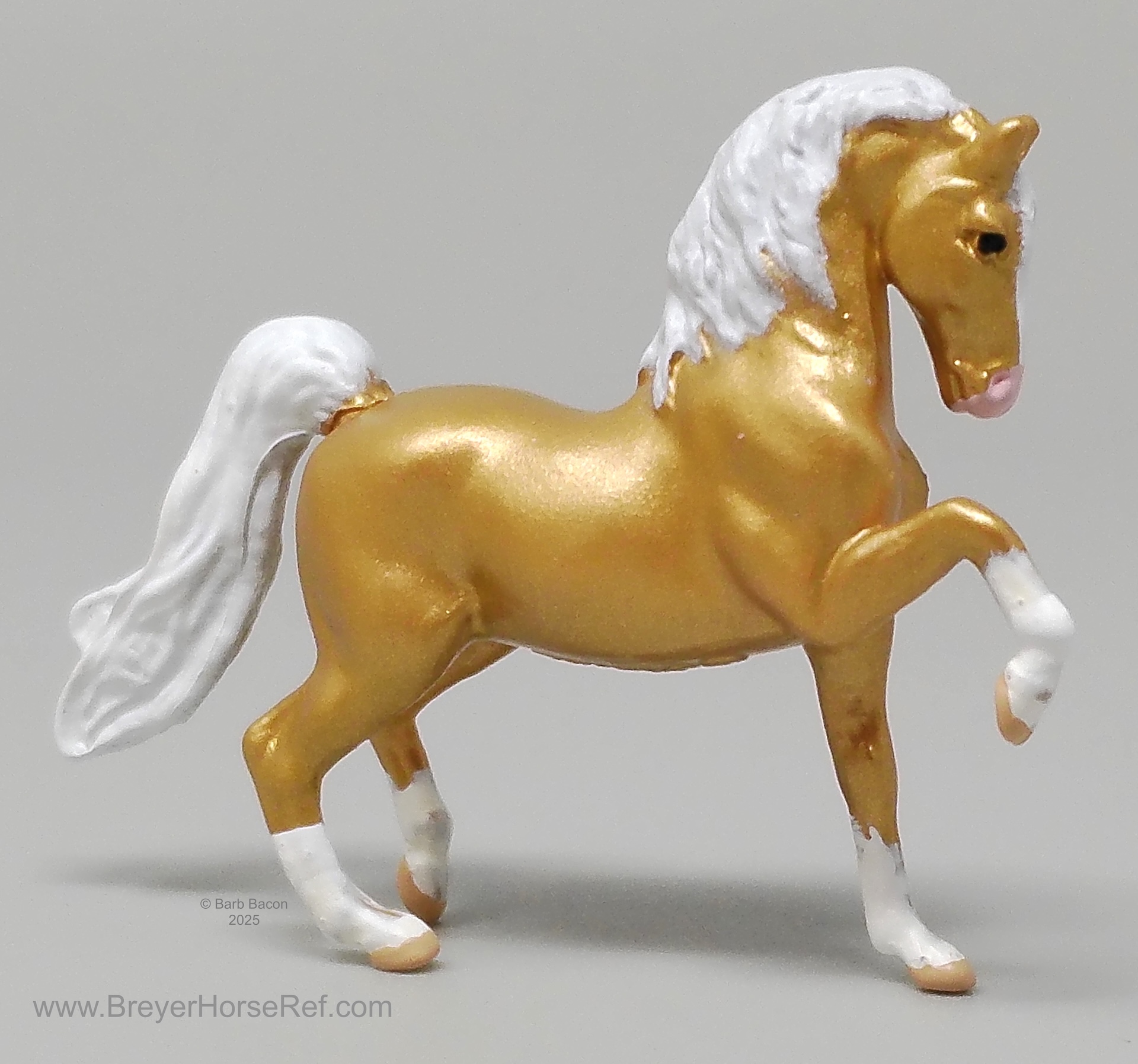There were five chase pieces to this set - Gold Charm, Florentine, Copenhagen, Wedgewood and Silver Filigree. "This unique advent calendar features miniatures of historic Breyer models with vintage-style coat patterns over chalky basecoats. There are 12 doors, one to open for each of the 12 days leading up to Christmas. Behind each door you'll find a special Mini Whinnies-scale horse. This unique Advent calendar includes 12 horses, one of which will be a gambler’s choice Sherman Morgan. Which of the five popular decorator colors he’ll be is a surprise! Other colorways feature iconic woodgrain with a Tenite sticker, splatter dapple, Appaloosa Performance Horse, Ponekah Eemetah with Native American markings, palomino with a blue ribbon sticker marking, a mini Starlight unicorn and many more! This is a very special anniversary collectible edition!" www.breyerhorses.com. Pictured in the 2025 Holiday Catalog.
