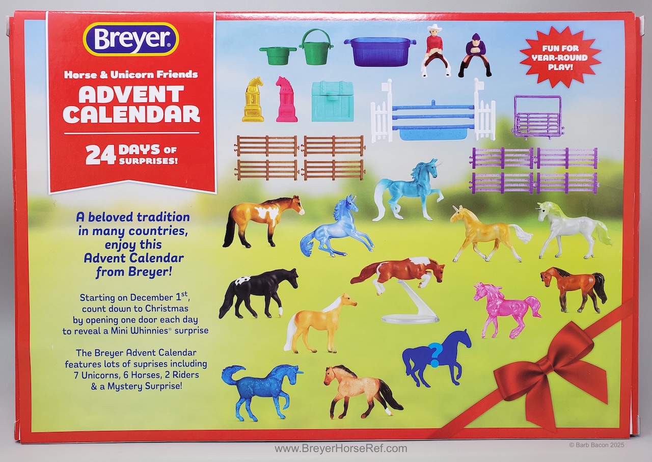 This set includes 13 models, 7 of those are Unicorns, 4 brown fence pieces, 4 purple sparkle fence pieces and a gate, 2 riders, water trough, 2 buckets, 2 trophies, green sparkle tack box and a blue sparkle jump. Pictured in the 2025 Holiday Catalog.