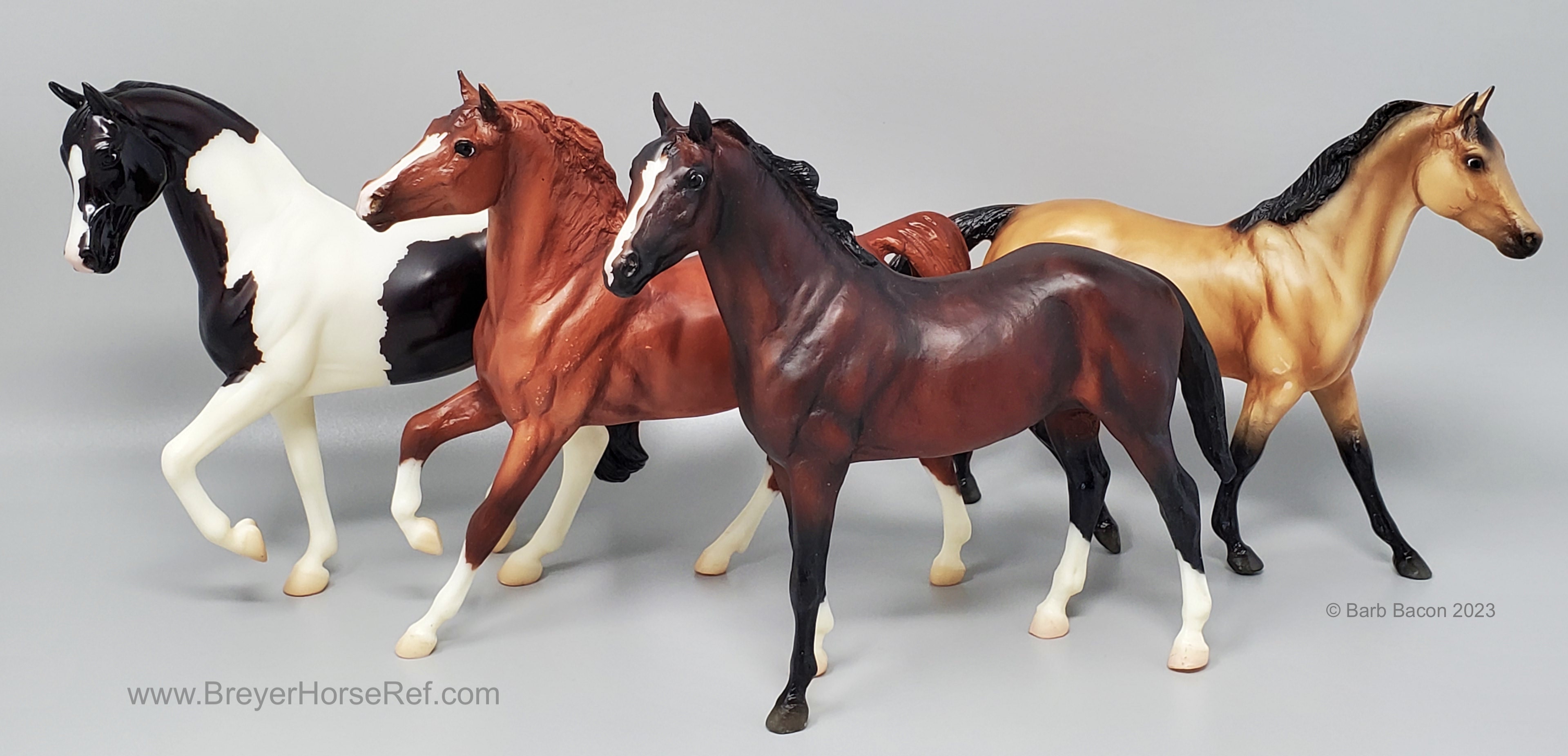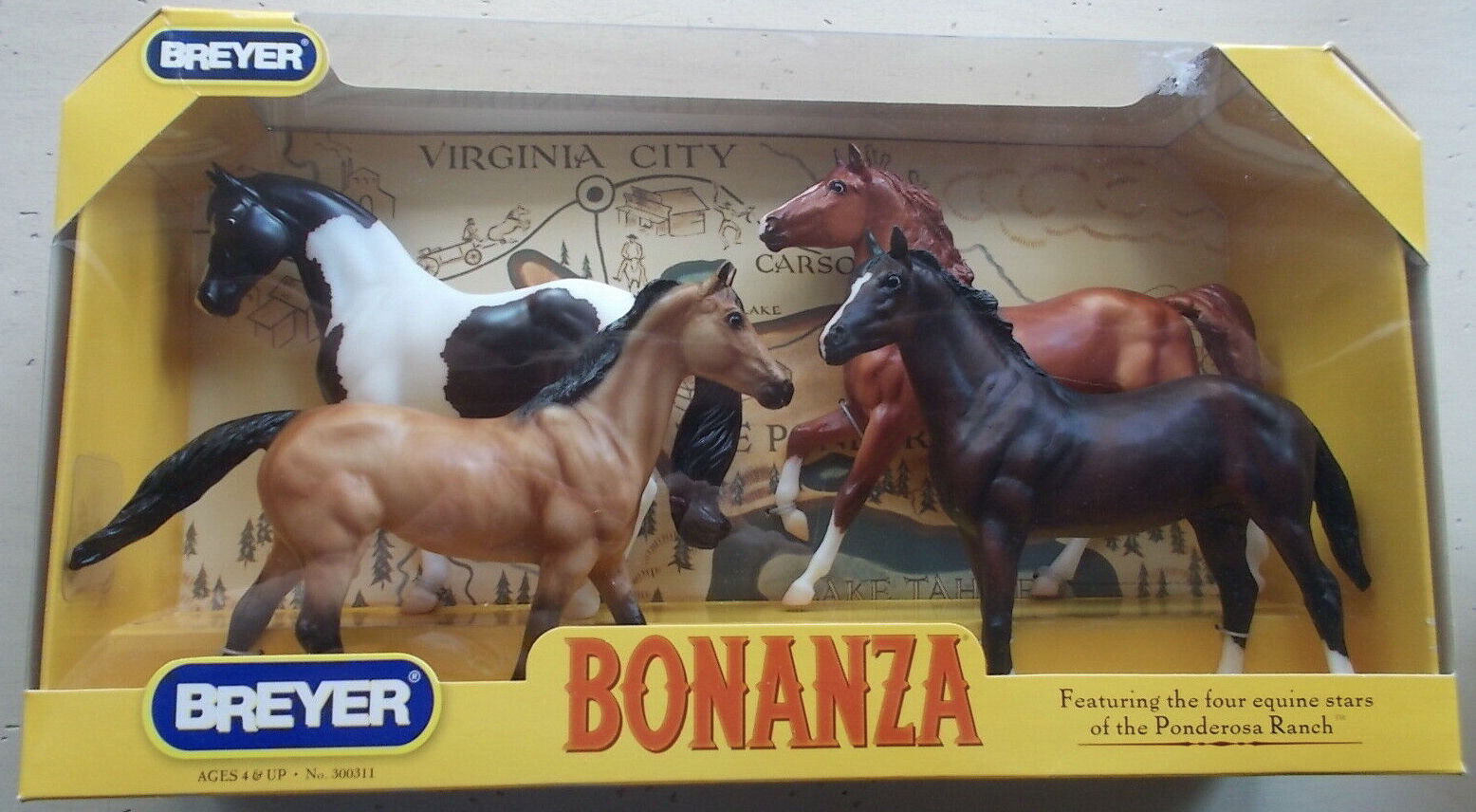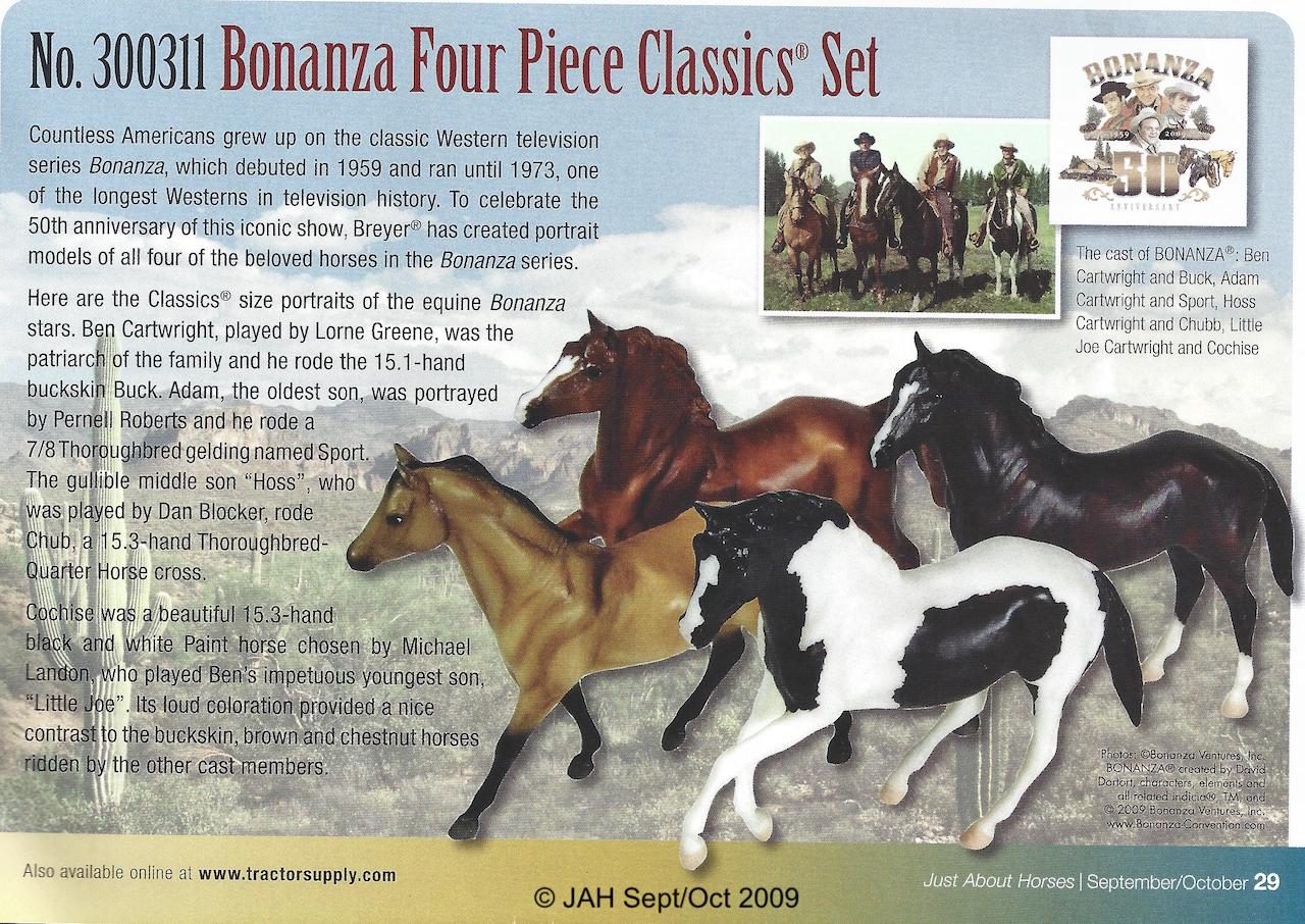 The set included Ben Cartwright's Buck (Buckskin Ruffian), Adam Cartwright's Sport (Chestnut Black Beauty), Hoss Cartwright's Chubb (Bay Duchess) and Little Joe Cartwright's Cochise (Black Pinto Warmblood Stallion).