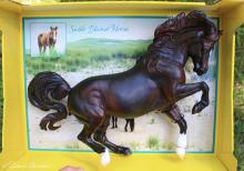 "Canada’s Sable Island is home to the feral Sable Island Horse. They likely descended from horses that were brought to the island for grazing in the 1700s. Pony-sized at only 13-14hh, the typical Sable Island Horse has a dark colored solid coat, narrow but deep-chested body, strong legs, and long mane and tail. The island’s horse population historically ranges from 200-500 horses. Breyer is pleased to have this horse in our 2020 line." www.breyerhorses.com.