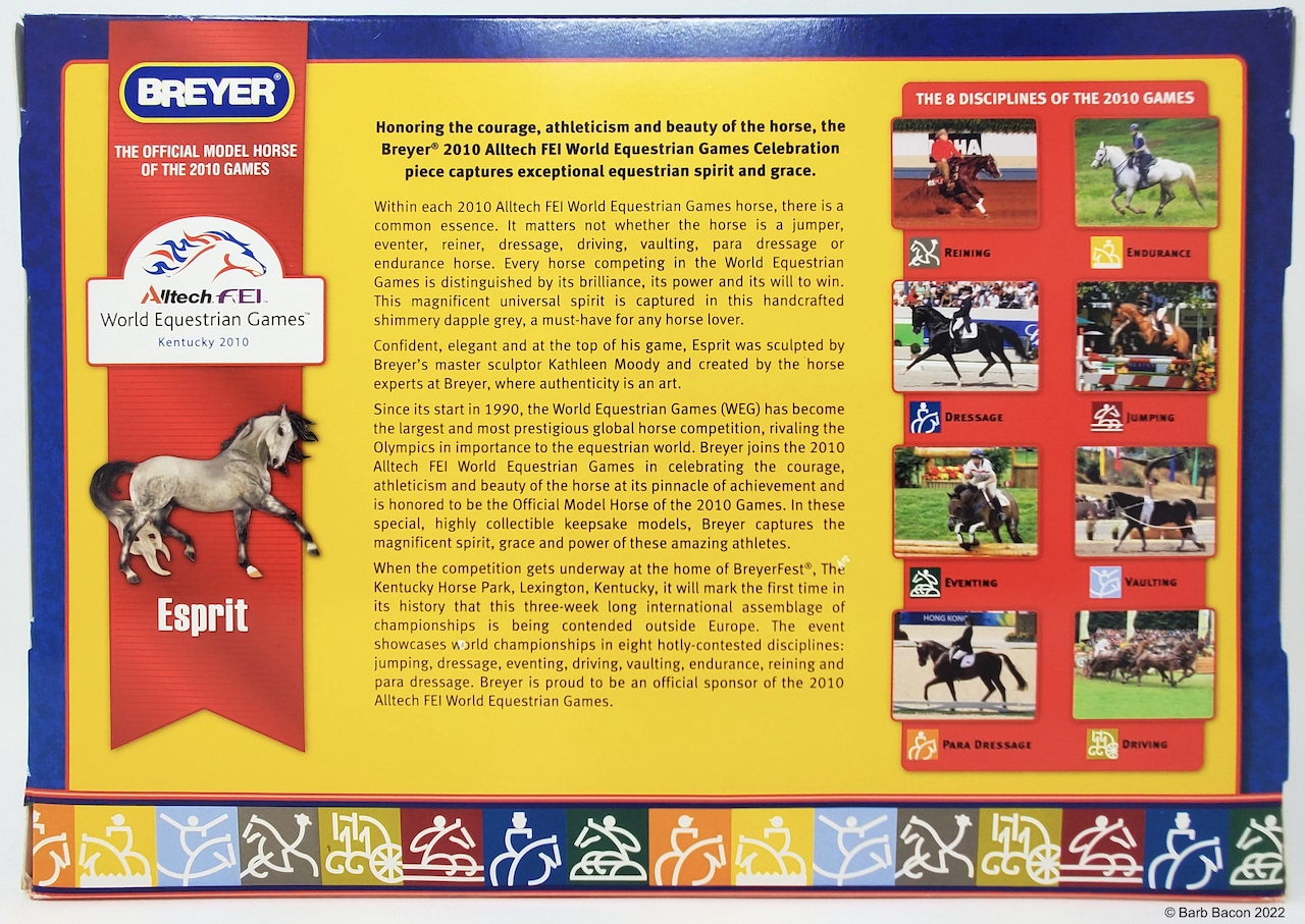 "The world’s finest model horse brand and the world’s most prestigious equestrian competition are joining together, as Breyer Animal Creation and the World Games 2010 Foundation today announced Breyer’s sponsorship of the Alltech FEI World Equestrian Games. The Games will be held September 25-October 10 in Lexington, Kentucky, and will feature the world championships in eight equestrian sports. As part of the partnership, Breyer has commissioned sculptor Kathleen Moody to create a sculpture to symbolize the spirit of the horses competing in eight different disciplines. Known as “Esprit,” the sculpture will be available in several mediums to commemorate the Games. Esprit will be the first model available, in late January, of the suite of WEG models that Breyer will produce to commemorate the horses of the 2010 Games.