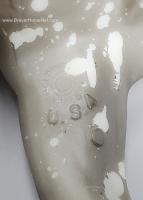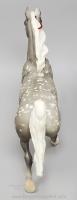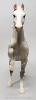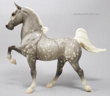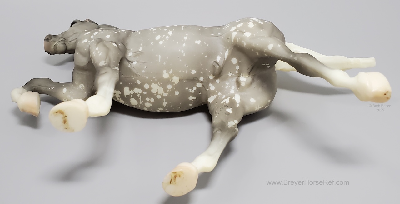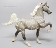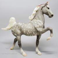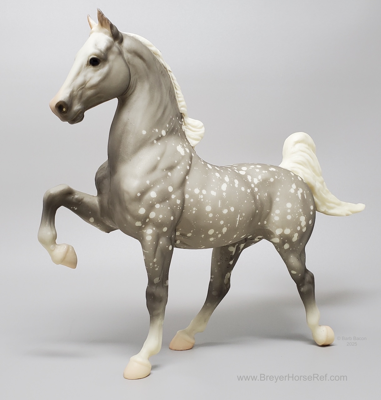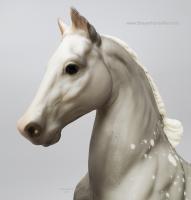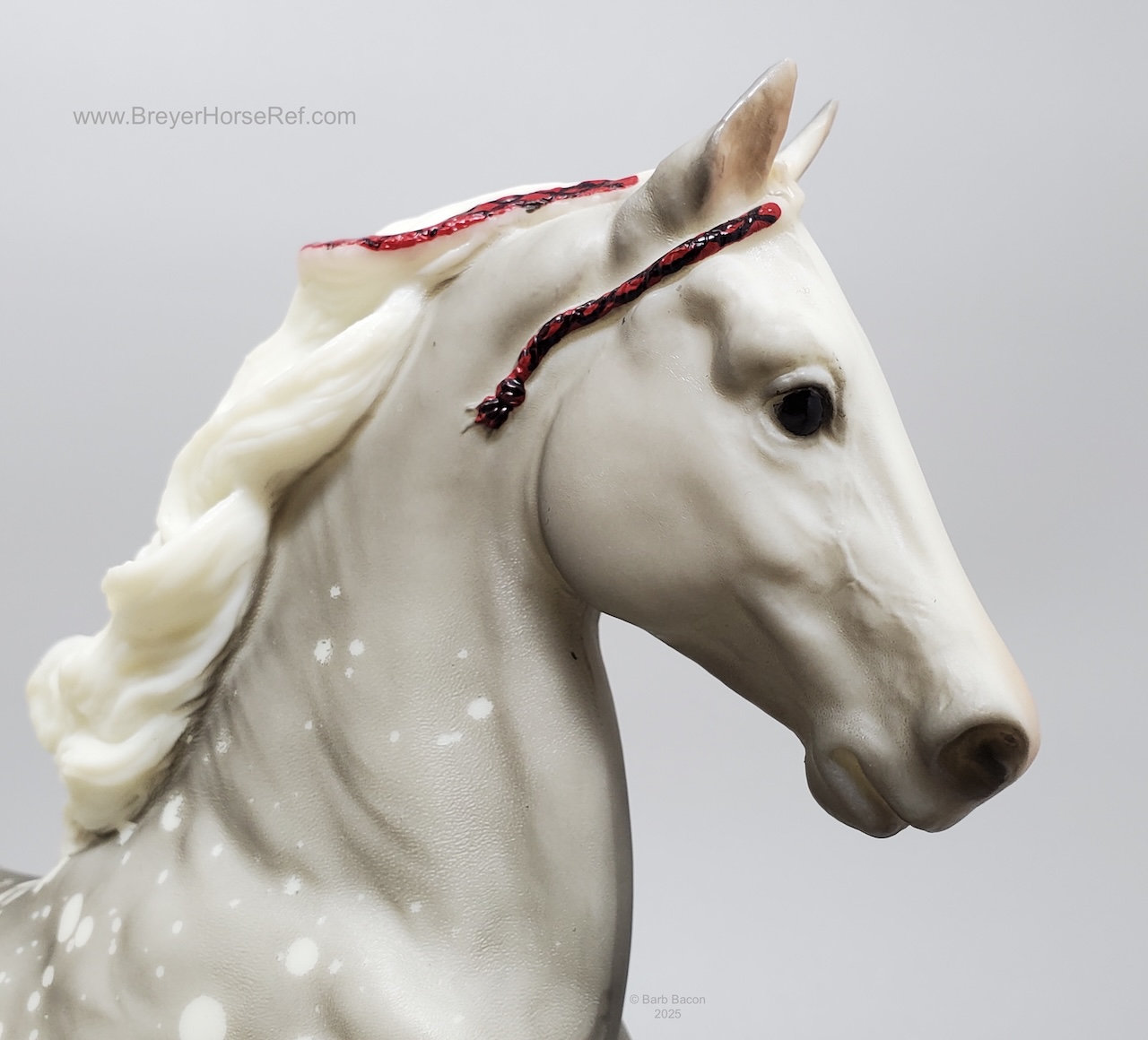 Dapple grey with white points, 4 socks with pink hooves, bald face with pinking on nose and in ears, and a red mane ribbon with black crisscross. Models from this run have been known to shrink.