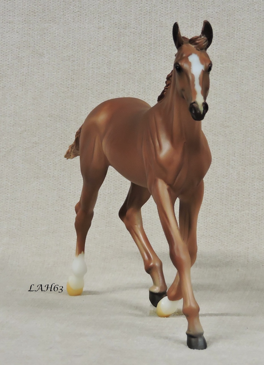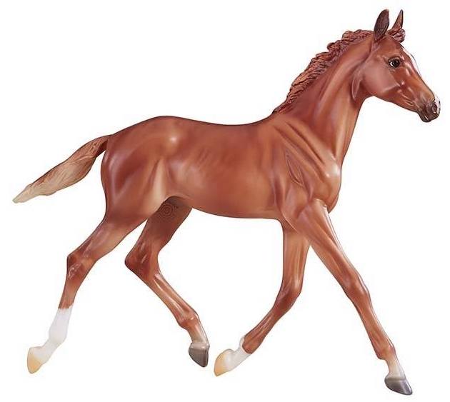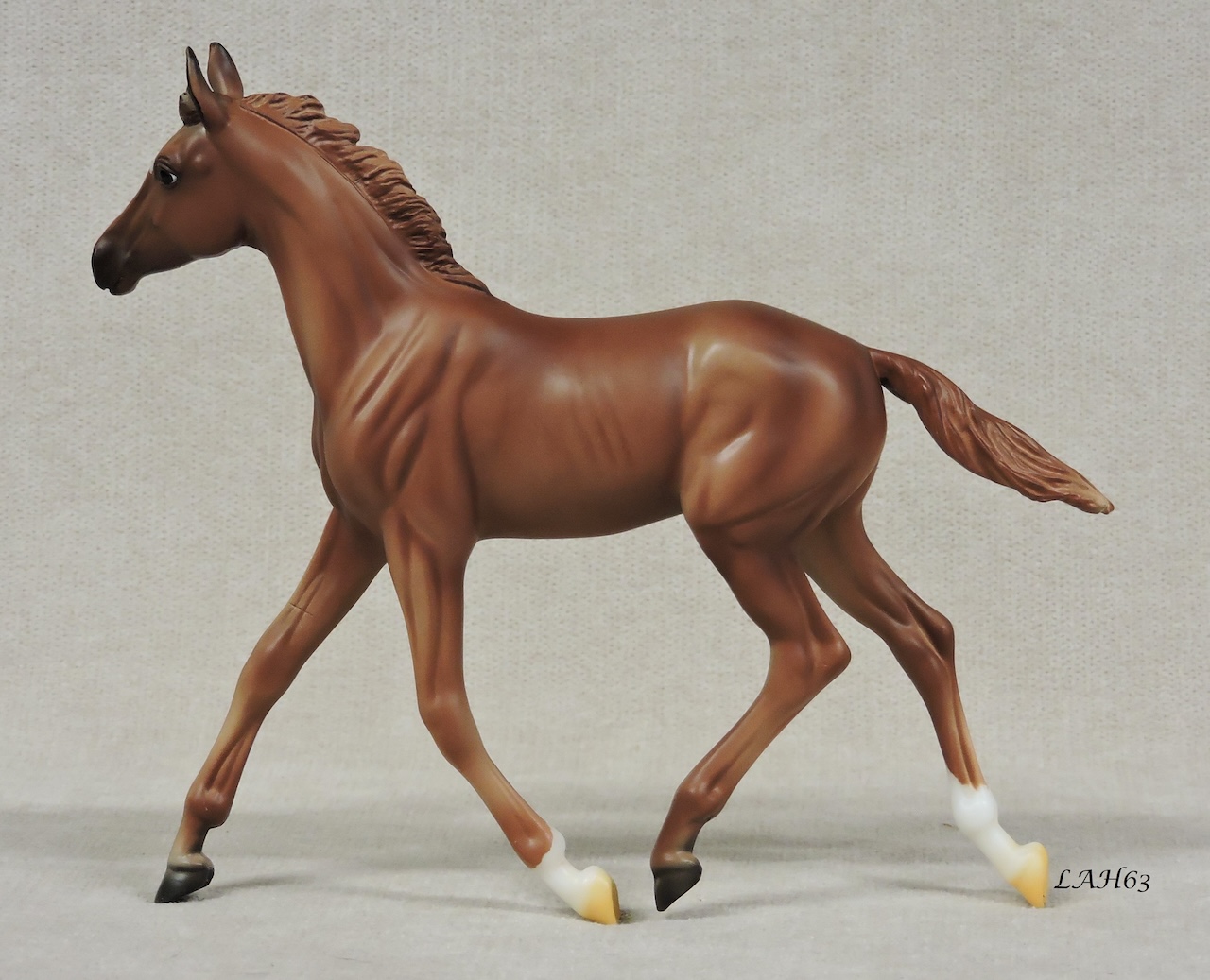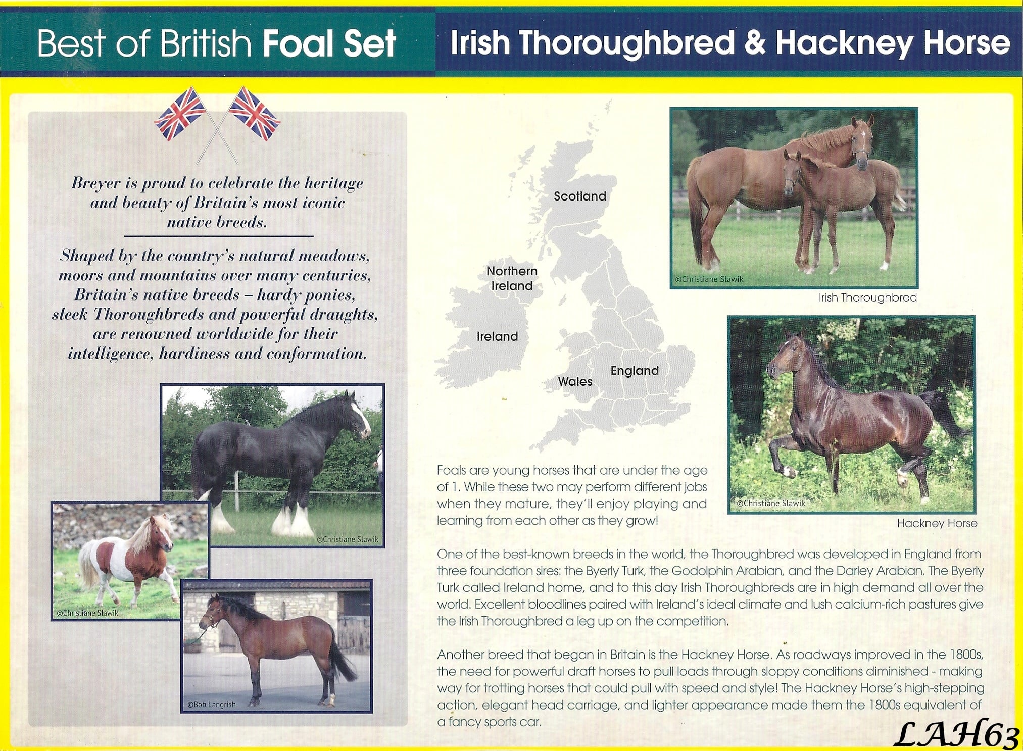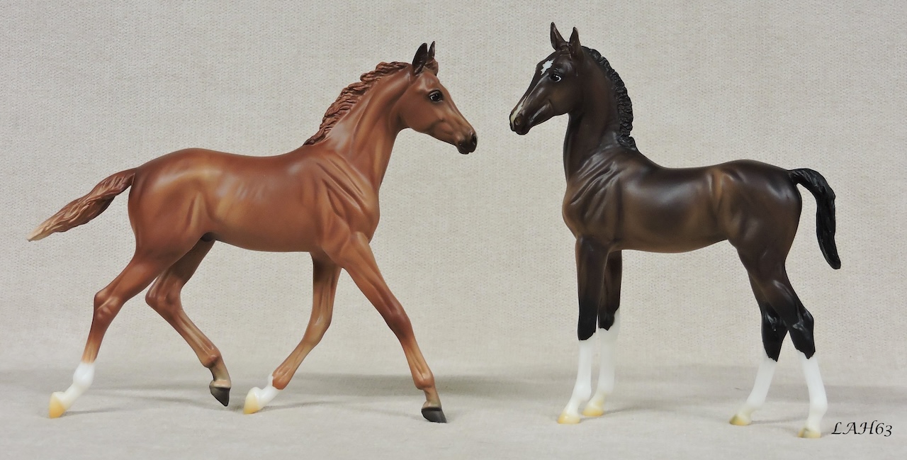 "Foals are young horses less than 1 year old. Thoroughbreds were developed in England to be the ideal racehorse: powerful, with speed and stamina, while carrying the weight of a rider. The Hackney Horse breed began in Britain. The Hackney's high-stepping action and elegant head carriage made them highly sought after carriage horses." www.breyerhorses.com. In a set with the Selene and Gilen molds.