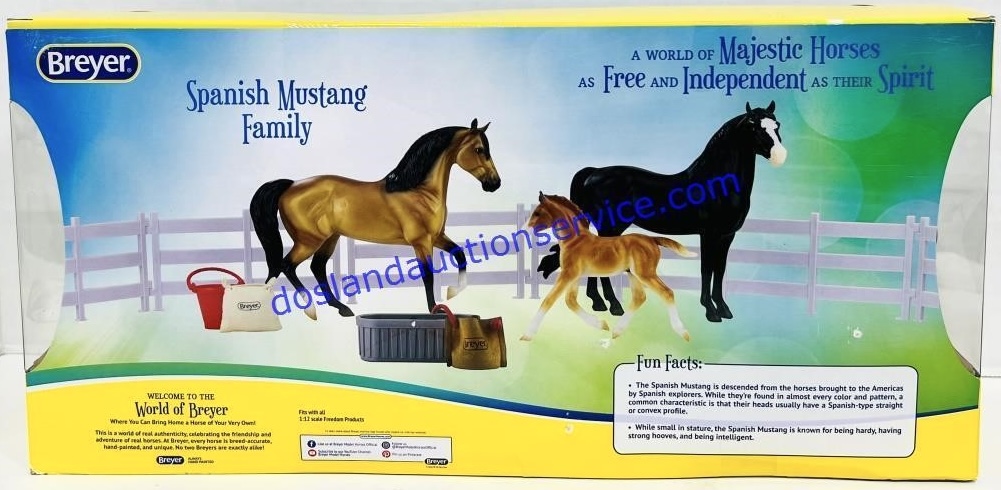 "The Spanish Mustang is descended from the horses brought to the Americas by Spanish explorers. While they’re found in almost every color and pattern, a common characteristic is that their heads usually have a Spanish-type straight or convex profile. While small in stature, the Spanish Mustang is known for being hardy, having strong hooves, and being intelligent. This new set includes Stallion, Mare, Foal, 6 pieces of fencing, water trough, water bucket, feed bag, and bag of feed." www.breyerhorses.com. Set included Fairfax, Mariah, and the Haflinger Foal. On the 2024 Retired List.