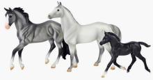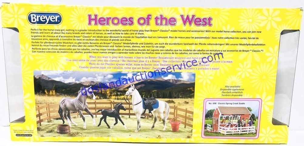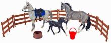 "The American West was won on the backs of hard working horses like these three stock-type horses. Everyone needed reliable horses for ranch work, travel and leisure, and these horses, which eventually formed the basis of the American Quarter Horse breed, were ideally suited to this lifestyle! Includes: 2 Horses (grey saddled with Western saddle and bridles plus an untacked grulla), and 1 cute black foal. Accessories include 6 pieces of corral fencing, a water barrel, and a bucket.” www.breyerhorses.com. Included the Haflinger Foal, Harper and the Standing Thoroughbred.